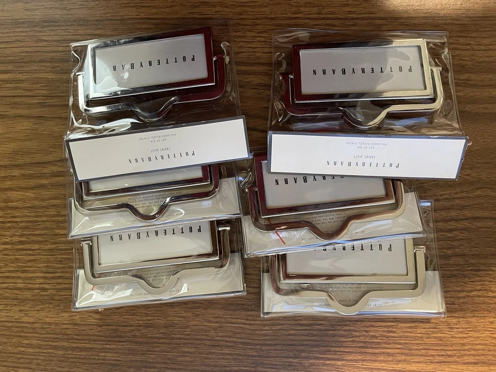 Set Of 6 Pottery Barn Front Mounted Hardware Label Pull Chrome 4.5" x 3" New- bought for a project and did use. New in package condition.