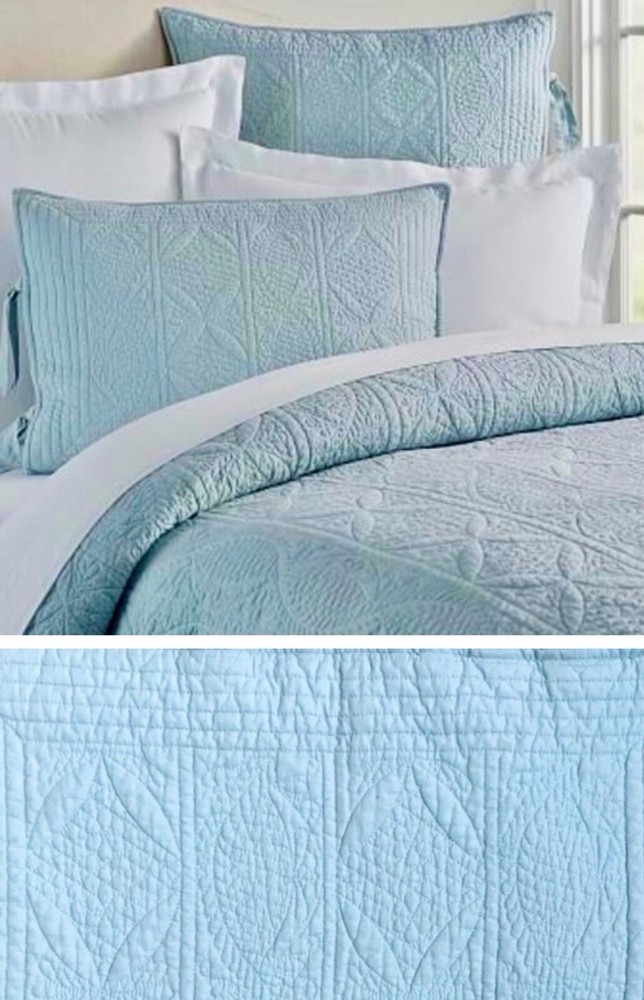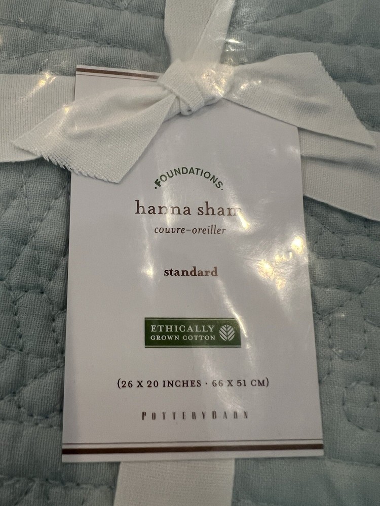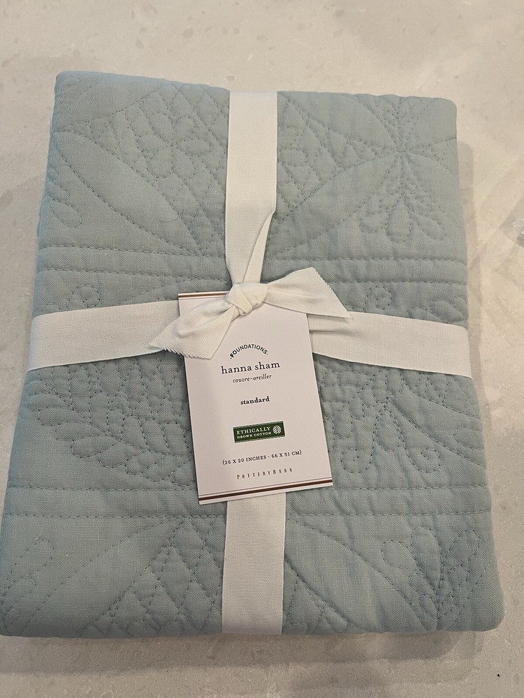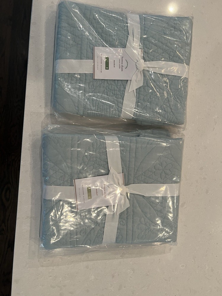 These are being sold as a pair. Add elegance to your bedroom decor with this set of two Pottery Barn Hanna pillow shams. Color is Seaglass Blue, like a spa-green blue. Crafted from 100% cotton and featuring a quilted pattern, these rectangular shams fit standard size pillows. Measuring 26 inches in length, these shams are perfect for both snuggling up with and displaying on your bed. Ideal for a variety of rooms, these Pottery Barn Hanna pillow shams are a must-have.