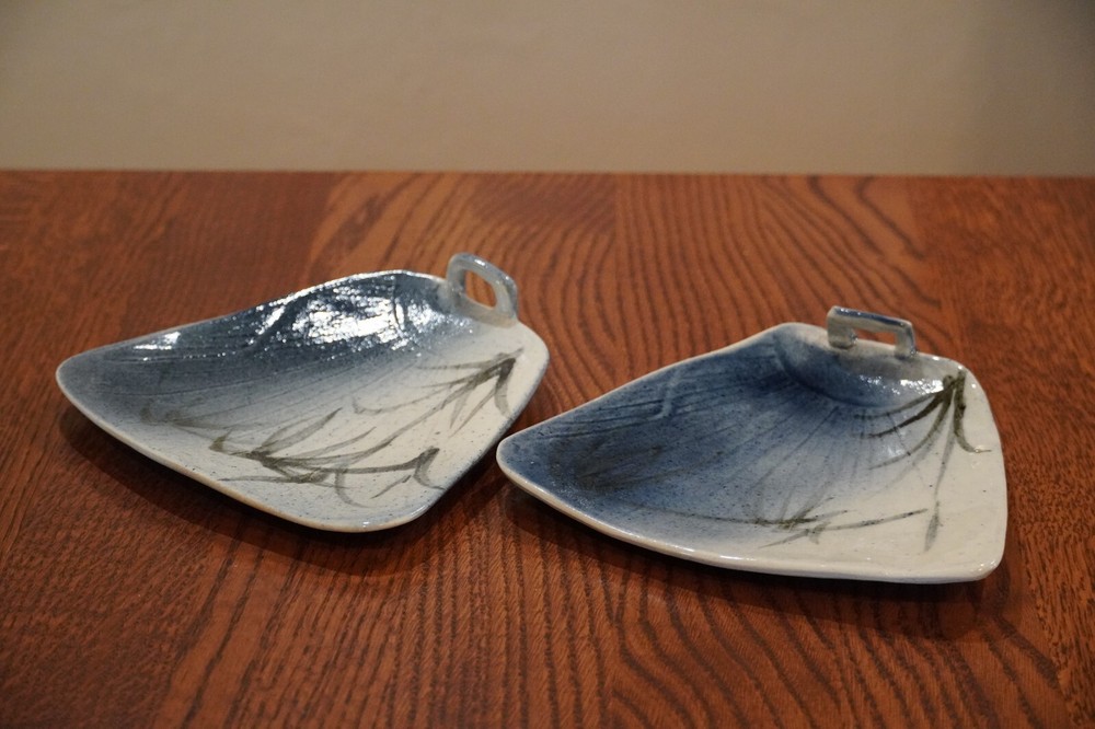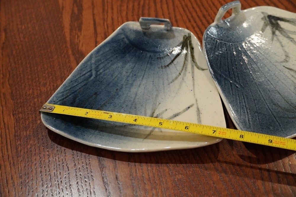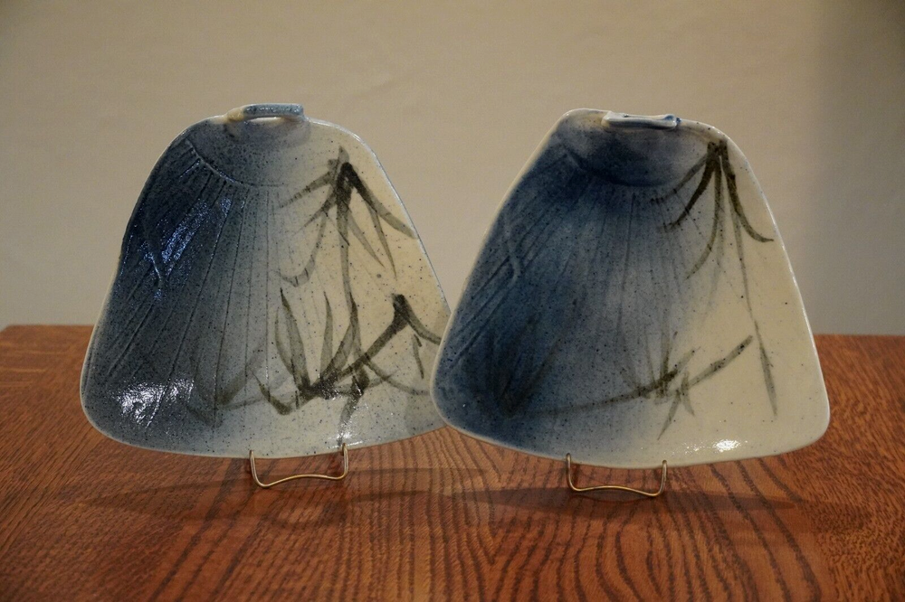 This is a set of 2 handmade ceramic dishes signed "Ann Elizabeth" from Ann Gerrity in Williamstown, Massachusetts. The dishes are fan-shaped with a Japanese Modern style abstract bamboo design, featuring a mottled blue and white glazed color scheme. They measure 7.5" in length, 6.5" in width, and 1.25" in height. They are the perfect size for sushi or dessert. To see all of my listings, click here: multipli-city-bazaar