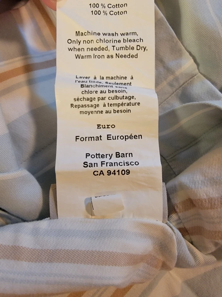Up for sale is a set of 2 pre-owned Pottery Barn striped euro shams. They feature blue, white and tan stripes. 100% cotton and machine washable. Shams are in excellent, pre-owned condition. No rips, stains or tears.