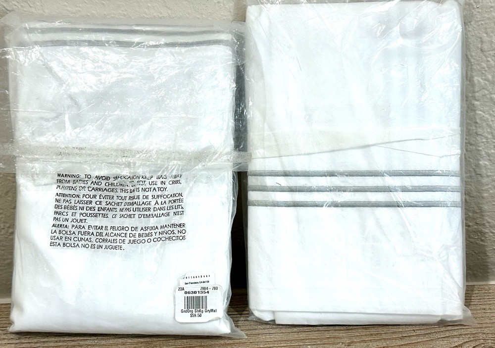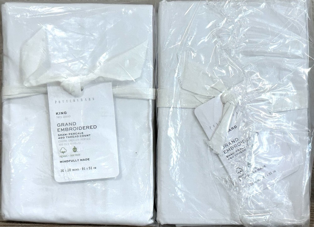 Pottery Barn Set of 2 Grand Embroidered Grey Mist Pillow Shams New with Tags ~ Sham has envelope closure ~ Reverses to slid ~ 400 thread count constructed of 2 ply yarns ~ 2 inch flange ~ Machine wash in warm water; gentle cycle ~ Tumble dry on low heat; remove promptly ~ Comes from a smoke-free home