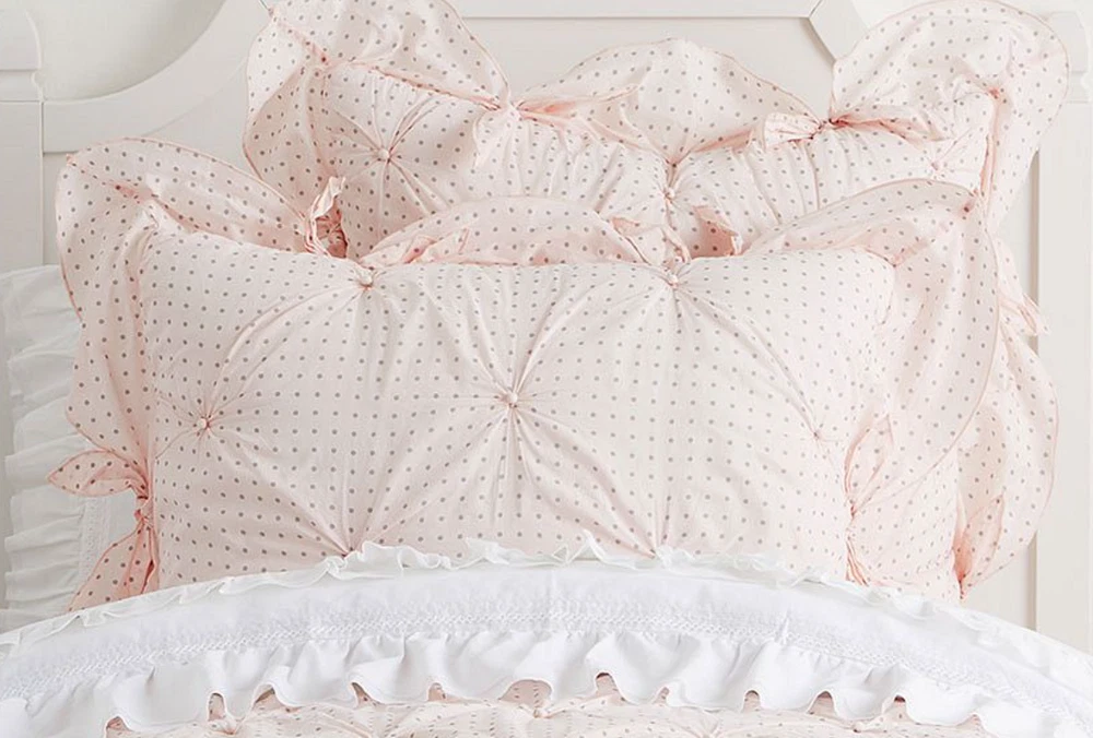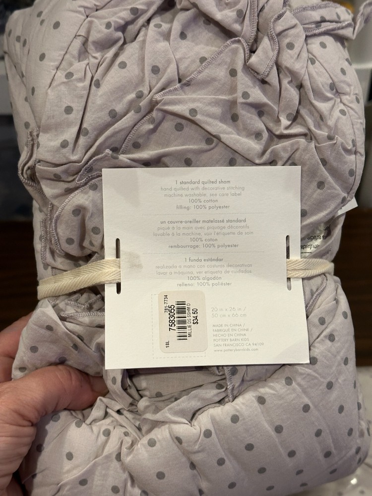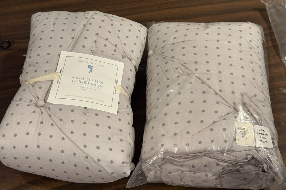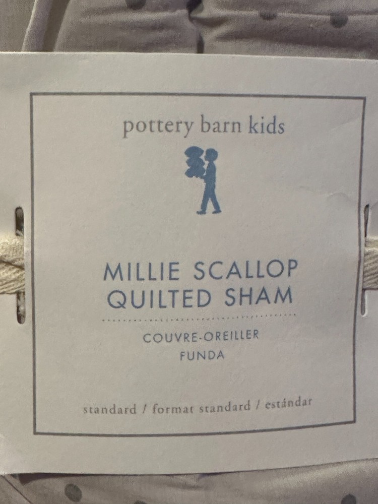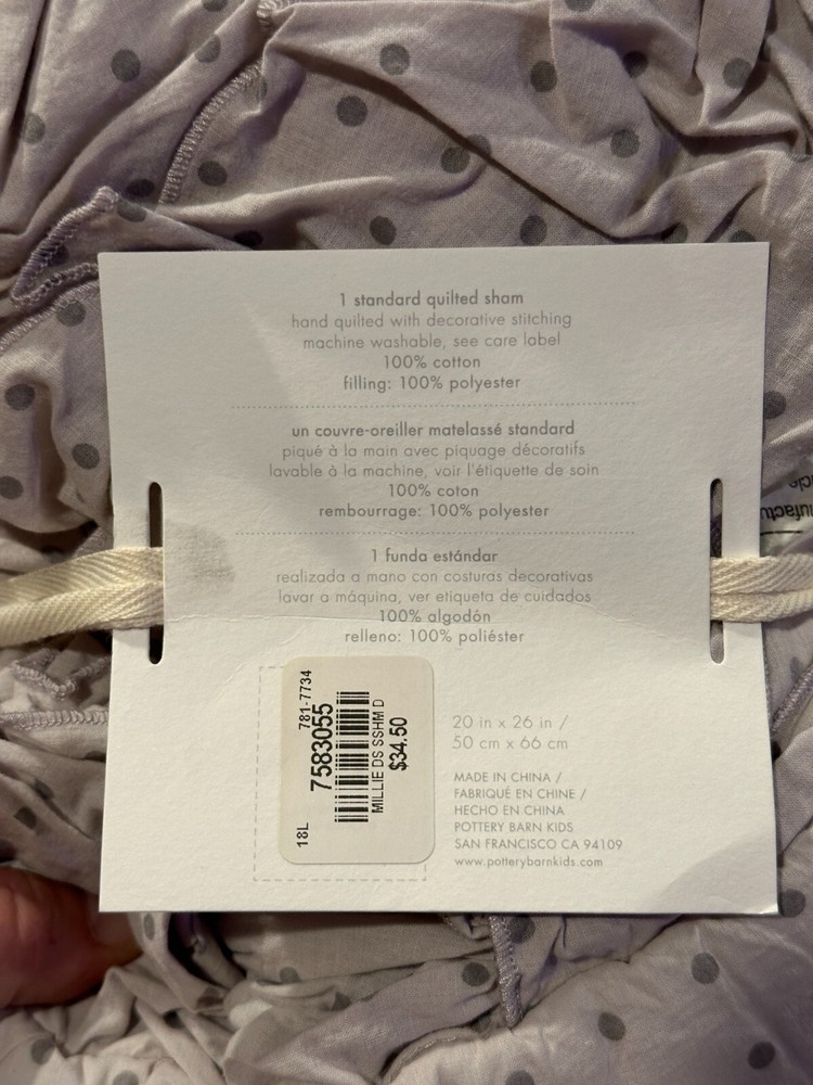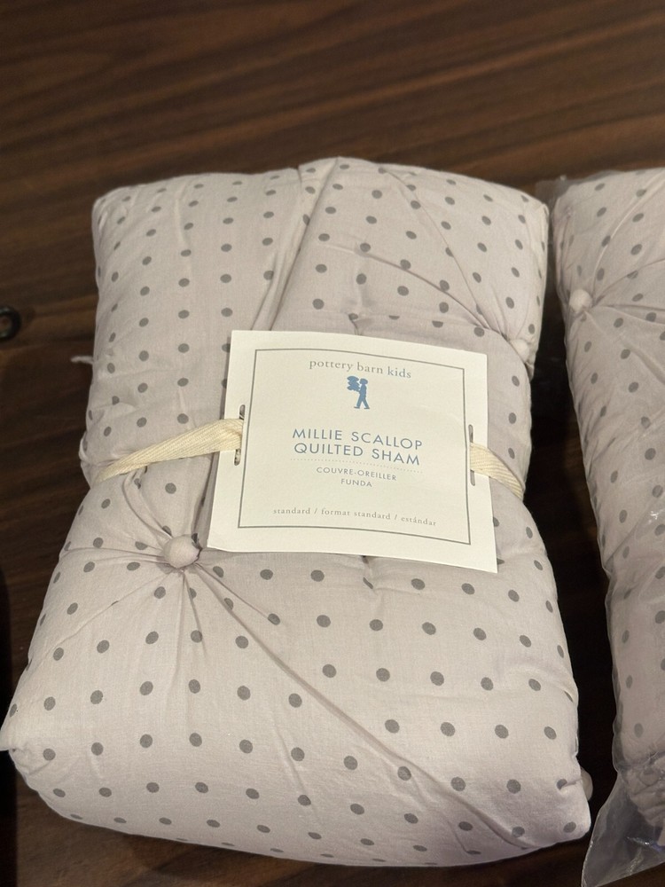 Set of 2 Pottery Barn Kids Millie Polka dot Scallop 2 Standard shams Purple lavender New w/tags -1 has paper tags one new in bag with price sticker -missing paper tag. Photo show coordinating bedding that included Sham is shown in pink from the website so you can see style -- this listing color is purple lavender -set of two Standard shams only.