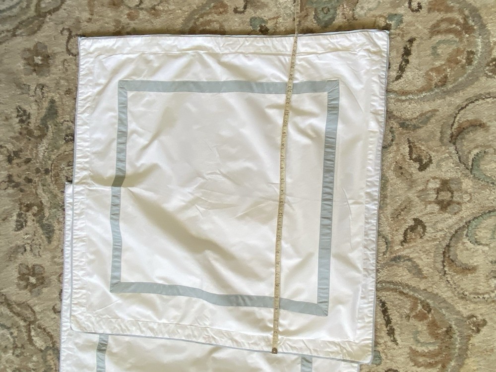 Bright white with sea foam Eucalyptus accents High Quality Italian Cotton Modern and elegant design Envelope enclosure Measures 28" square overall 25" insert size with 1.5" flange