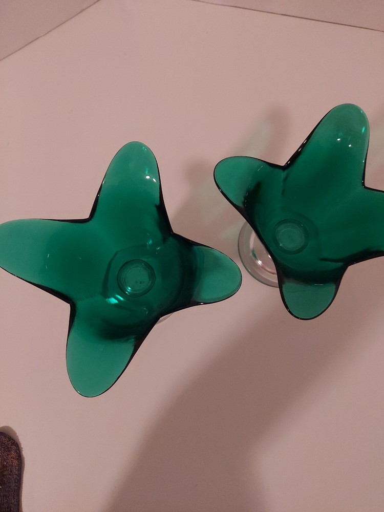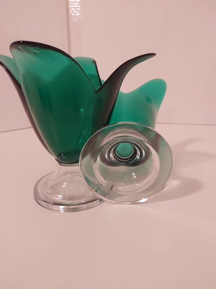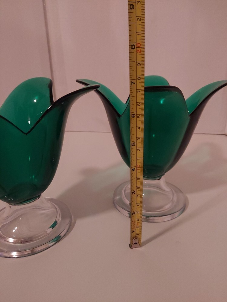 Add a touch of vintage art to your home decor with this set of 2 Studio Nova tulip-shaped green art glass vase pedestal. The scalloped design and clear glass accentuate the beauty of the green tulips, making it a perfect centerpiece for your living room or dining table. Each vase is 6.75 inches in length and handcrafted in Portugal, making it a unique addition to your collection. These vintage vases are perfect for collectors and enthusiasts alike. They are made of high-quality glass and have a mid-century age to them. The vases come in a set of two and are perfect for displaying flowers or as a standalone piece of art. Add this beautiful set to your collection today!