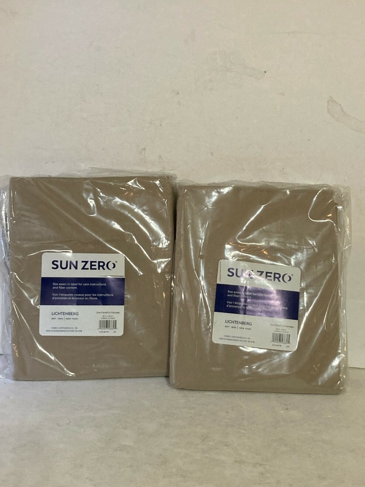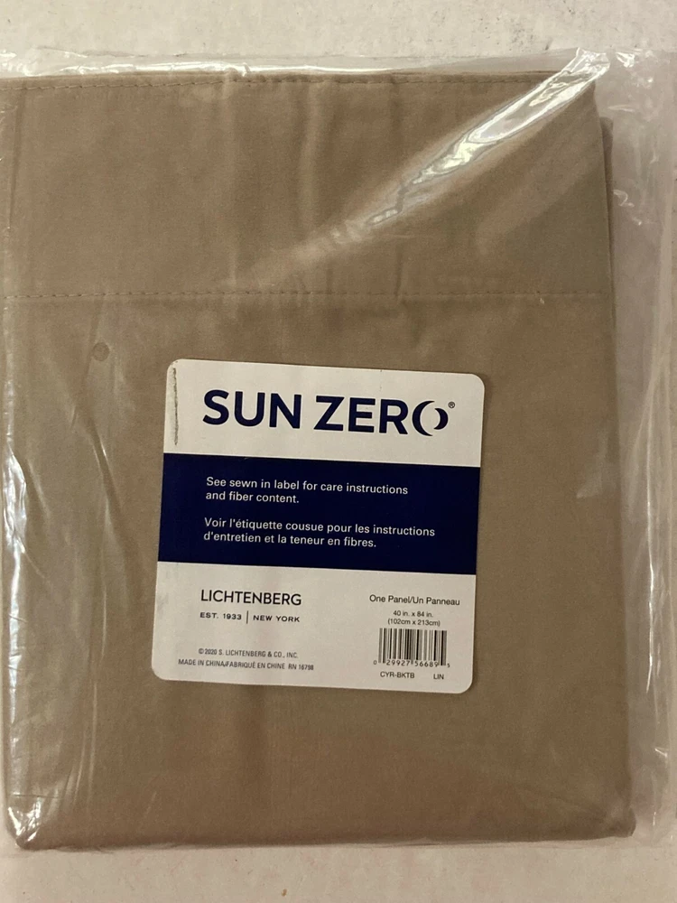 WE DO NOT SHIP TO P.O. BOXES. PLEASE PROVIDE A PHYSICAL MAILING ADDRESS. OPEN BOX. IN LIKE NEW CONDITION. NEVER USED. OPEN PACKAGES Item will be shipped free by USPS Priority Mail/UPS within 48 Lower States (NO SHIPPING for Alaska, Hawaii or Puerto Rico) THIS IS A SET OF 2 PANELS Sun Zero Cyrus Curtain Panel in stones provide the ultimate in light blocking technology to keep out even the harshest of light while adding energy efficiency to any room of your home. Sun Zero Total Blackout technology is laboratory tested to block out 100% of light, reduce outside noise by up to 30%, and decrease energy lost through your windows by up to 30%. Comfort is optimized with thermal insulation that helps keep summer heat and winter chill out of your home. Equipped with hidden back tabs for easy hanging on standard curtain rods up to 1.5" in diameter. Hang in your entertainment room to eliminate screen glare and reduce distracting outside noise, or in your bedroom for enhanced privacy and a sounder, more uninterrupted sleep. Sold as individual panels measuring 40" width by 84" length. Measure carefully before selecting your desired size and quantity. Machine wash cold on gentle cycle. Use non-chlorine bleach when needed. Tumble dry on low heat, using a cool iron as needed. Total Blackout technology blocks out 100% of outside light while enhancing privacy Thermal insulation helps keep summer heat and winter chill out of your home Energy efficient design reduces energy lost through your windows by up to 30% Thermal properties help keep summer heat and winter chill out of your home Hidden back tabs fit curtain rods up to 1.5" in diameter