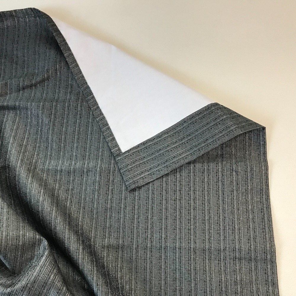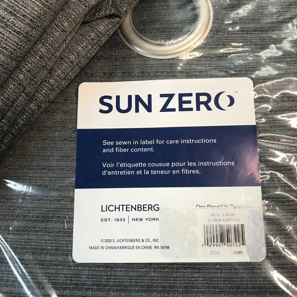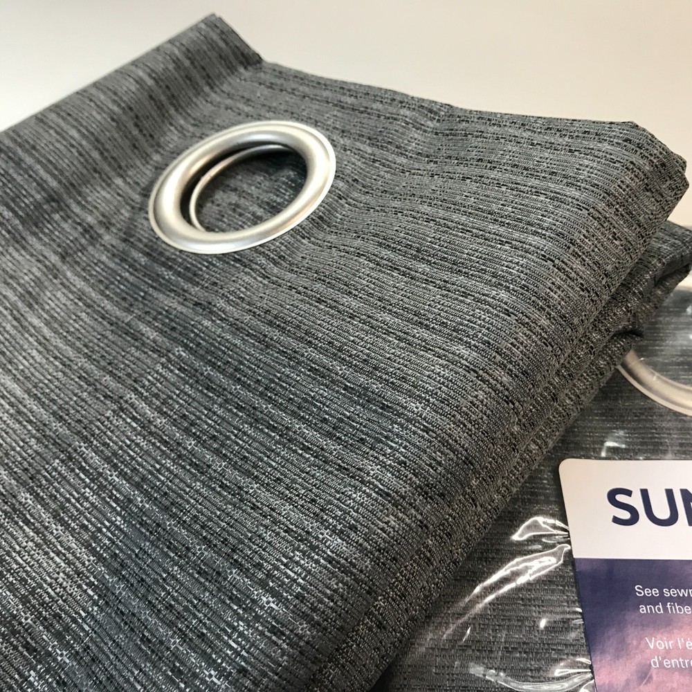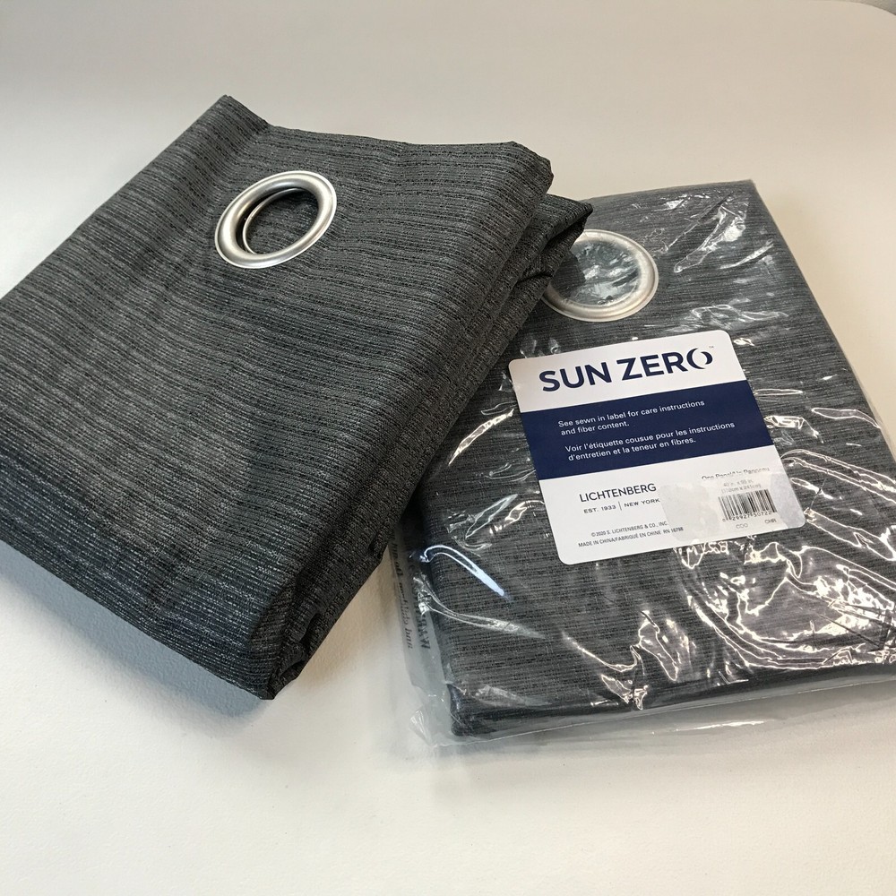 This is a Set of (2) Sun Zero Lichtenberg Grommet Curtain Panels. One panel is packed in an unopened bag, the other is loose. Color: Charcoal Size: 40" x 95" Qty: 2 panels