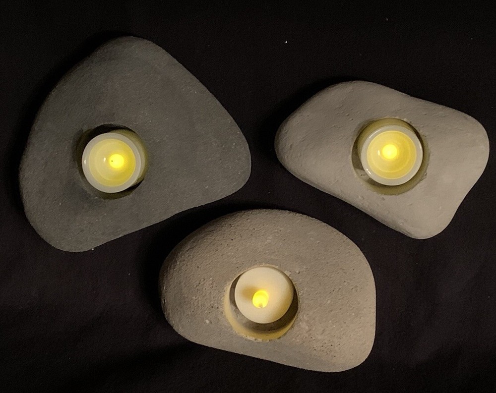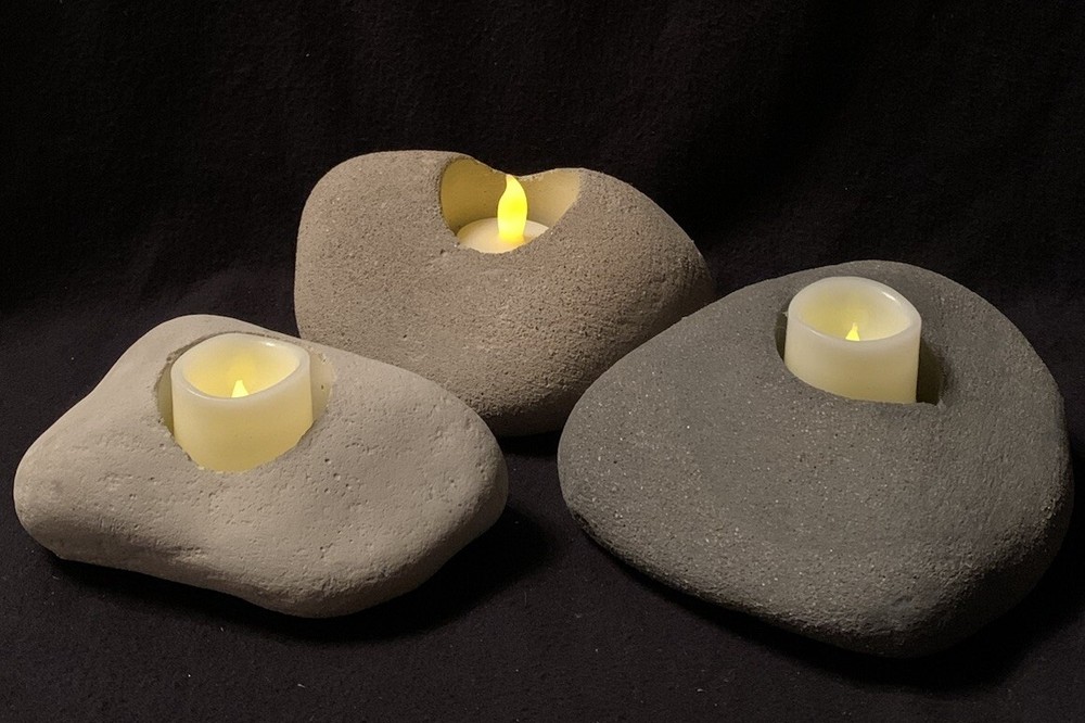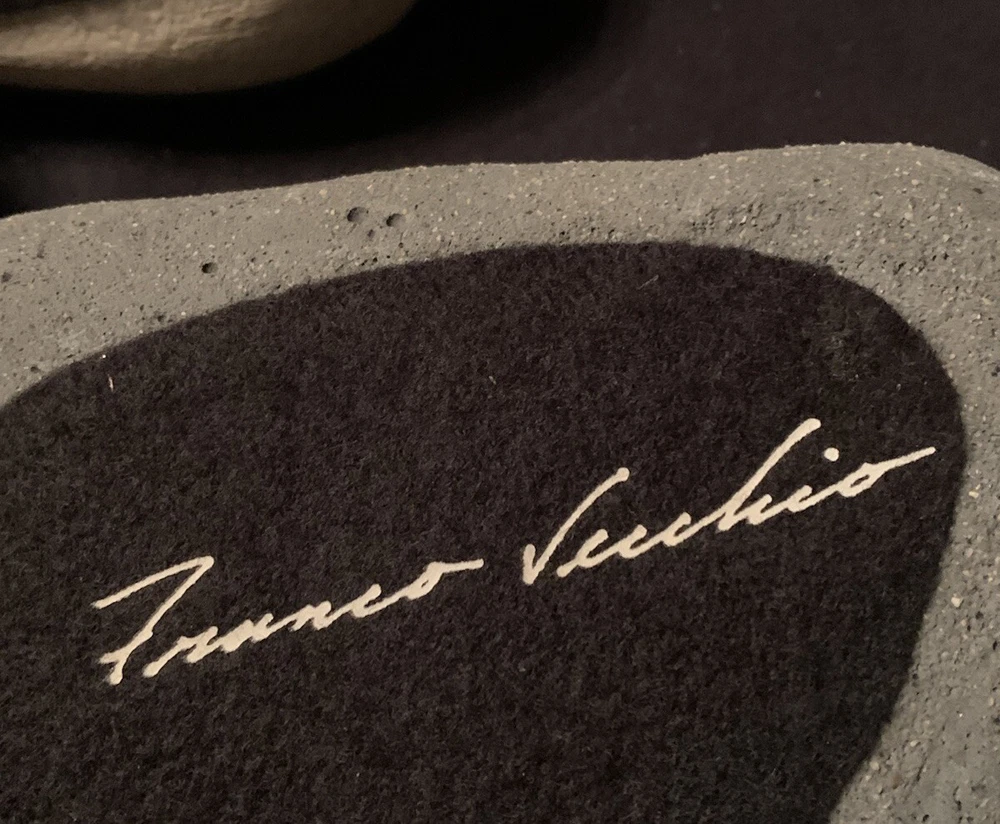 You are viewing a set of 3 Earth Lights votive rock candles from the Franco Vecchio Studio Collection. They were created by the late renowned interior designer Franco Vecchio. His studio collection included cement works for the Frank Lloyd Wright Foundation and Calvin Klein Home. Each piece is hand cast and made in the USA of recycled materials. They have a scratch resistant padding on the bottom to protect surfaces. Each has a copy of the artist's signature on the padded base. Measurements- *6" long x 4.75" wide x 2.5" deep *5.75" long x 3.75" wide x 2.75" deep *5" long x 3.25" wide x 2" deep About the Artist: Vecchio grew up in Sicily. He worked with his father who was a master mason. He was introduced to building and design at a young age. His family settled on the East Coast. He later moved to Los Angeles and went on to produce and market his own line of home accessories, as well as producing lines for Calvin Klein Home, The Frank Lloyd Wright Foundation and original signed celebrity concrete handprints. Franco also made custom pieces of art and furniture for residential clients around L.A. and was soon asked to create interiors. He was best known for masculine bachelor pads. These items are in very good pre-owned condition and clean. There are a few chips around the edge of the hole where the candle goes. They are very minor. See last pictures. These items will be packaged with care and shipped with your choice of UPS Ground or USPS Priority Mail.