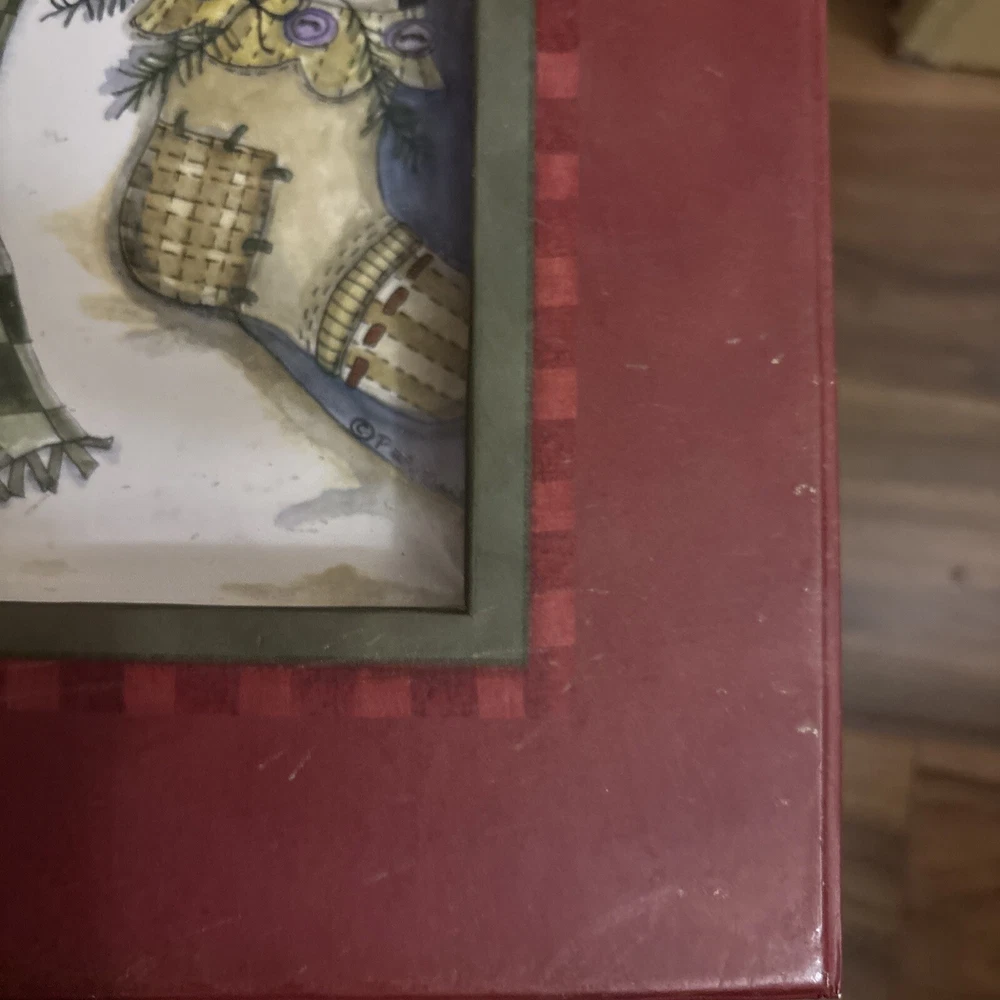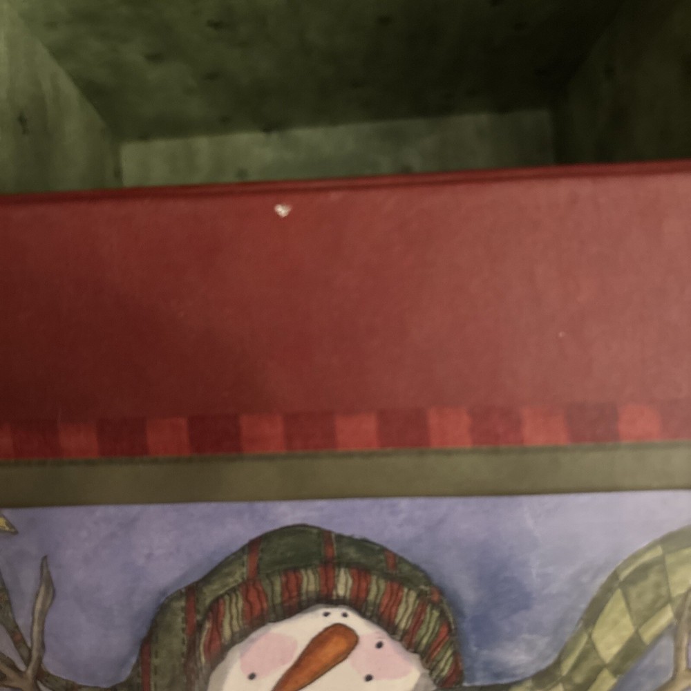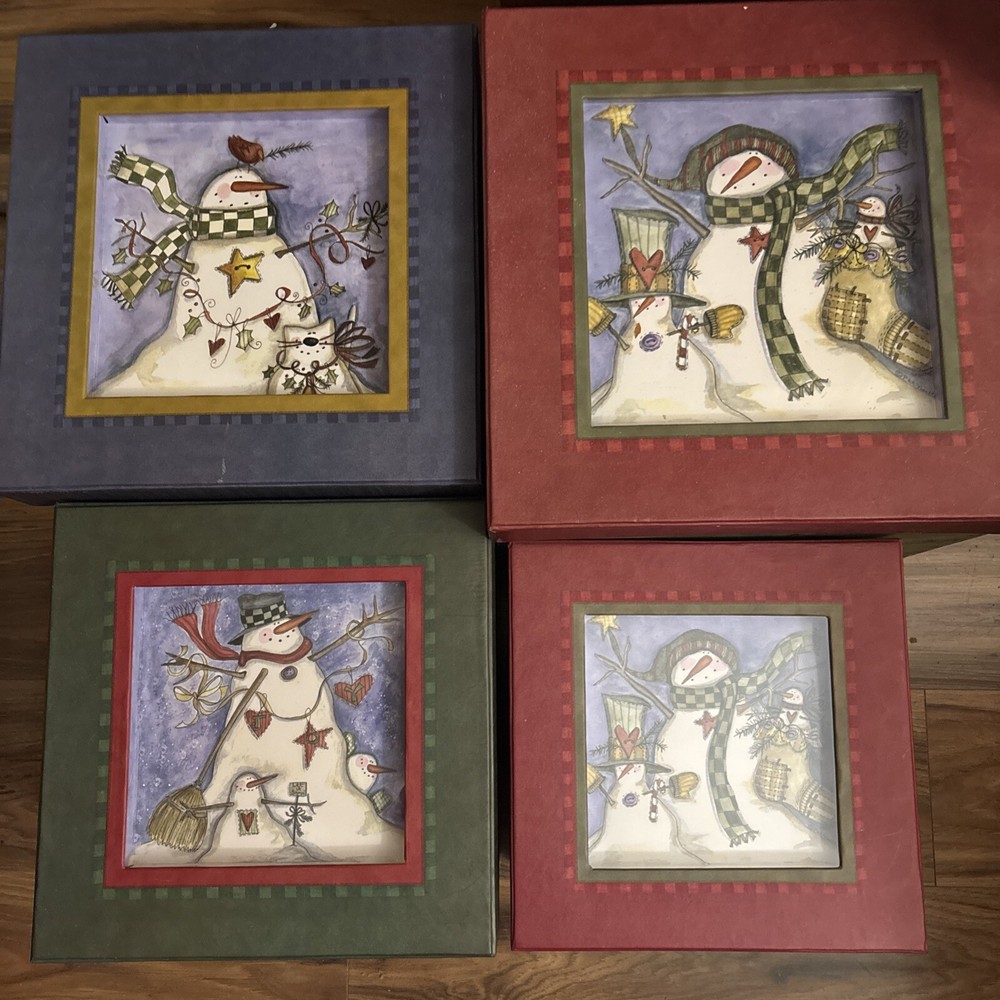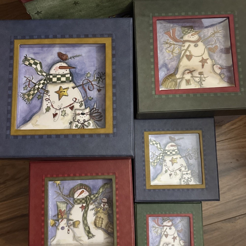 The product is a set of nine Christmas nesting stacking boxes by Silver Swan Studios. Each box features a winter snowman shadow box design with lids. The boxes are square-shaped, assorted in size, and made of fiberboard. They are multi-colored and have a holiday theme. The set is from China and is free-standing, requiring no assembly. Personalization is not available for these original holiday decorative boxes. (PT3)