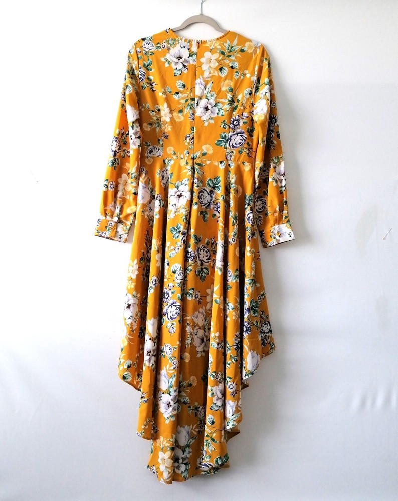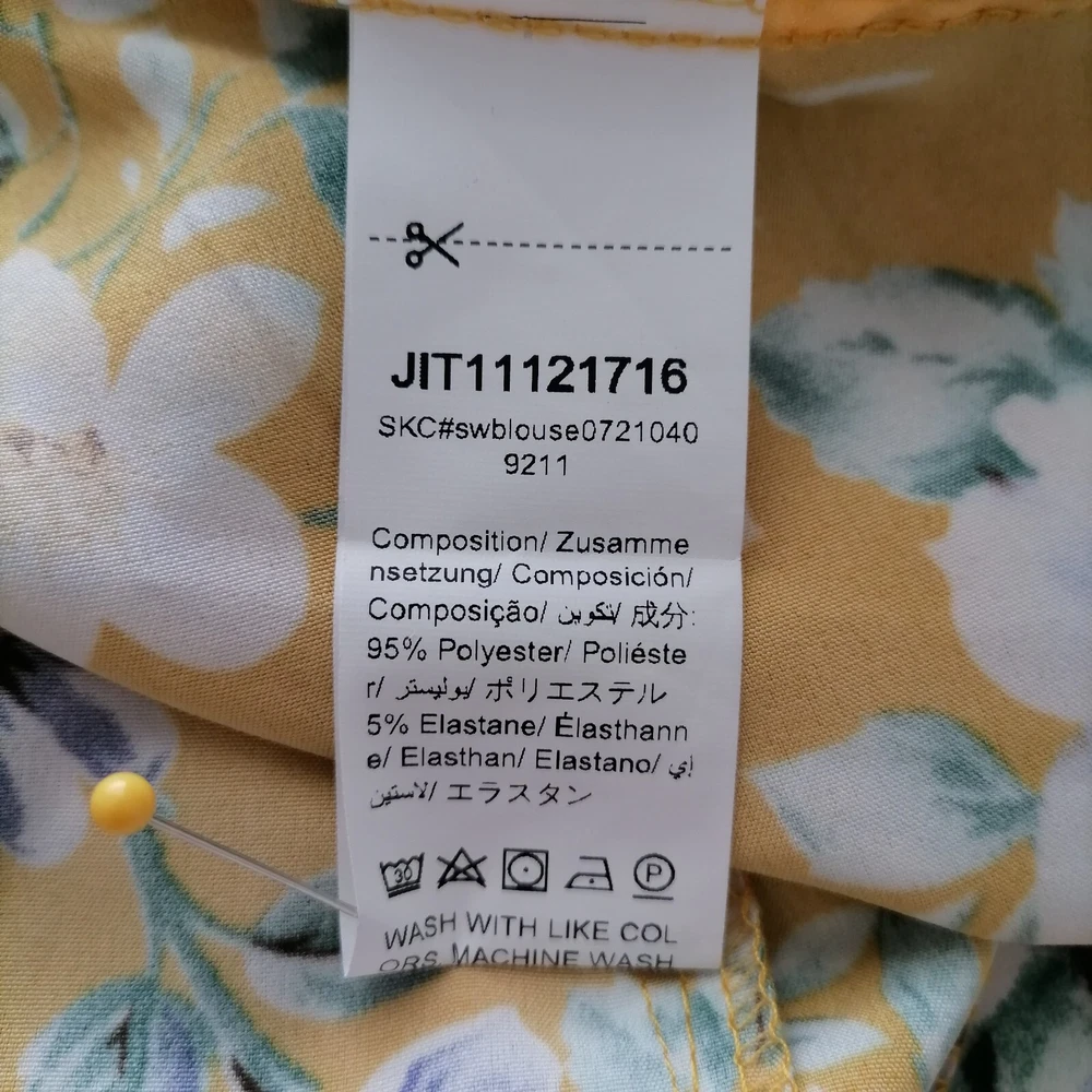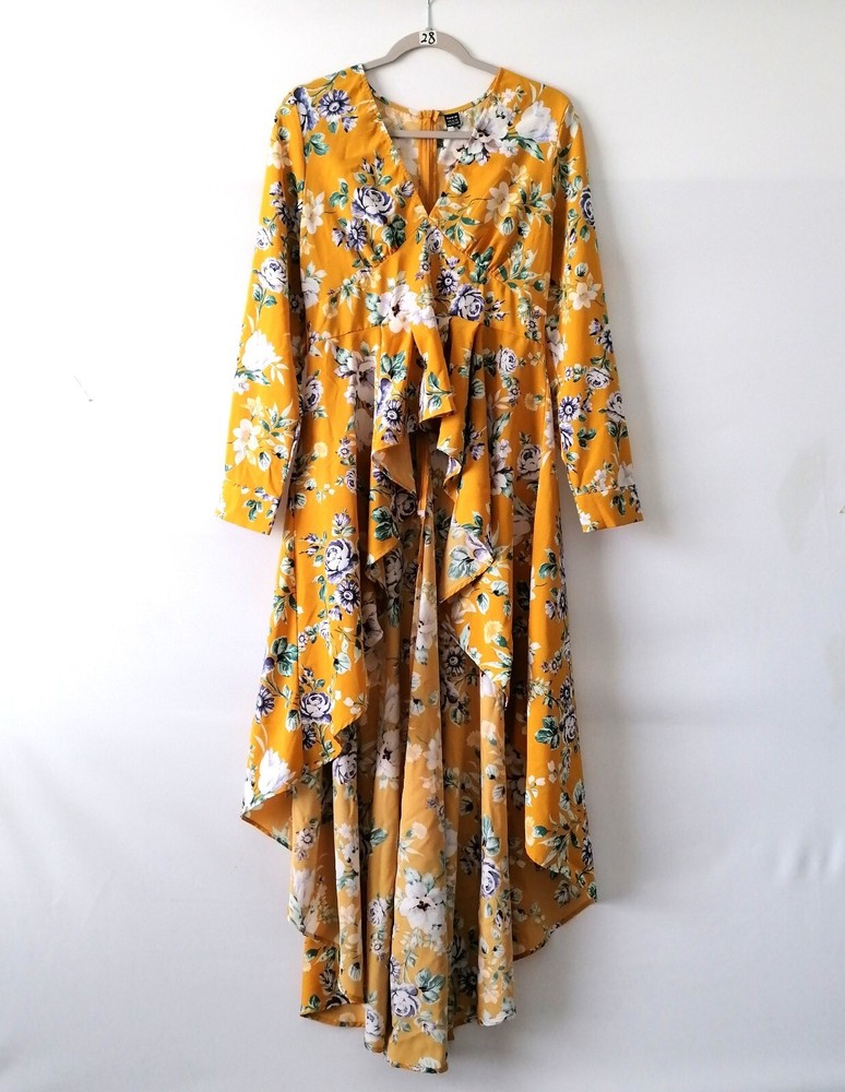 Shein Womens Yellow Clasi Floral Print Self Belted Ruffle Dip Hem Blouse Size L Pre Owned In Good Condition. Approximate Measurements With Flat-Lay In Inches: Pit To Pit : 18" Length: 25/55" Sleeve Length: 23" Waist:14" Brand: Shein Size: L Color: Yellow Sold as pictured! Thank you for looking! SKU: 434-28,C