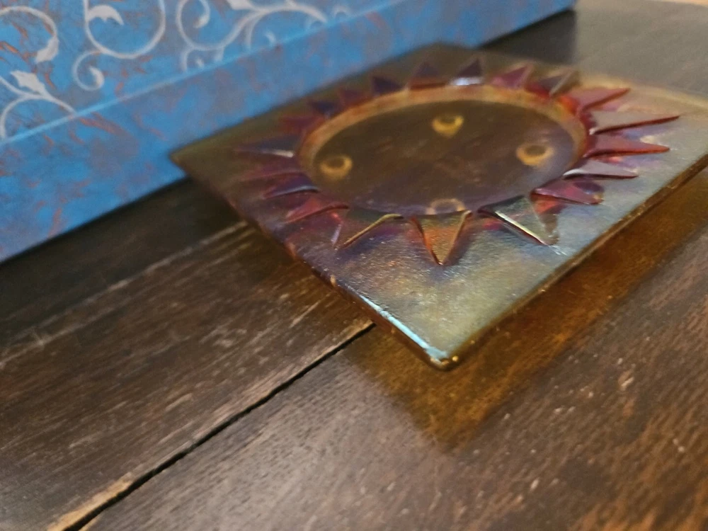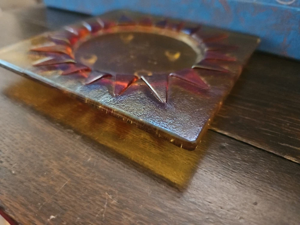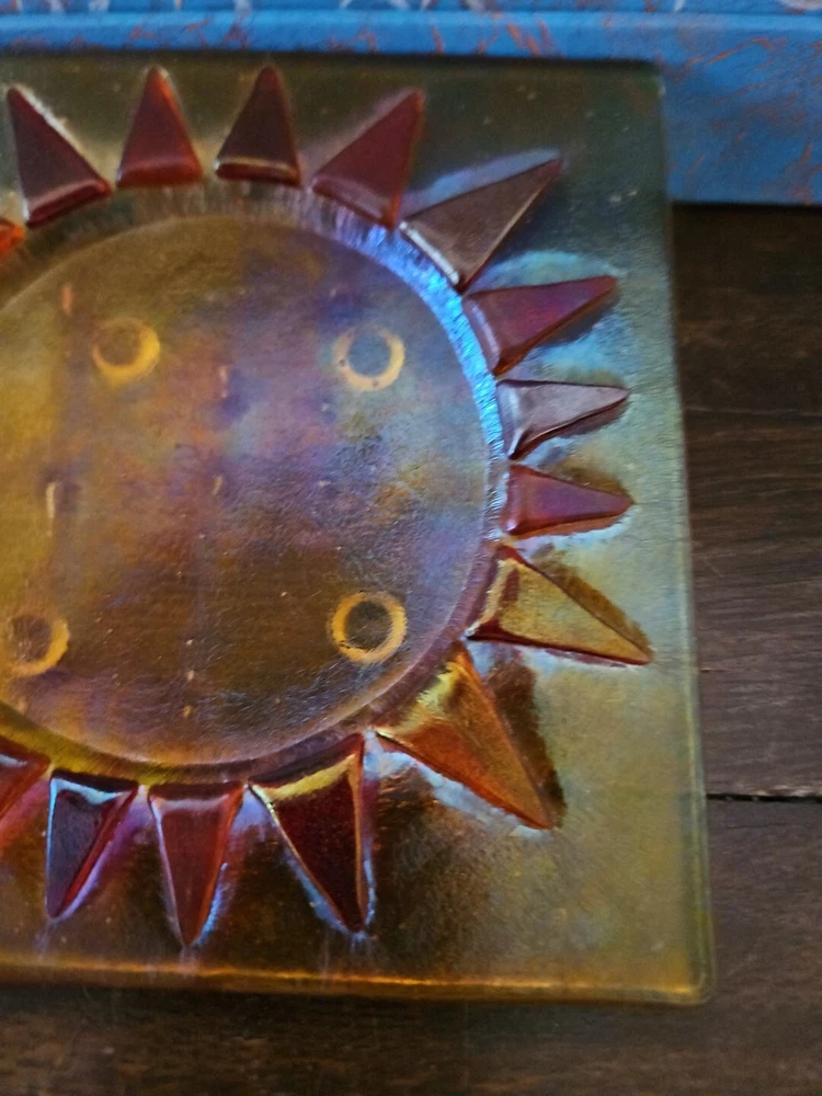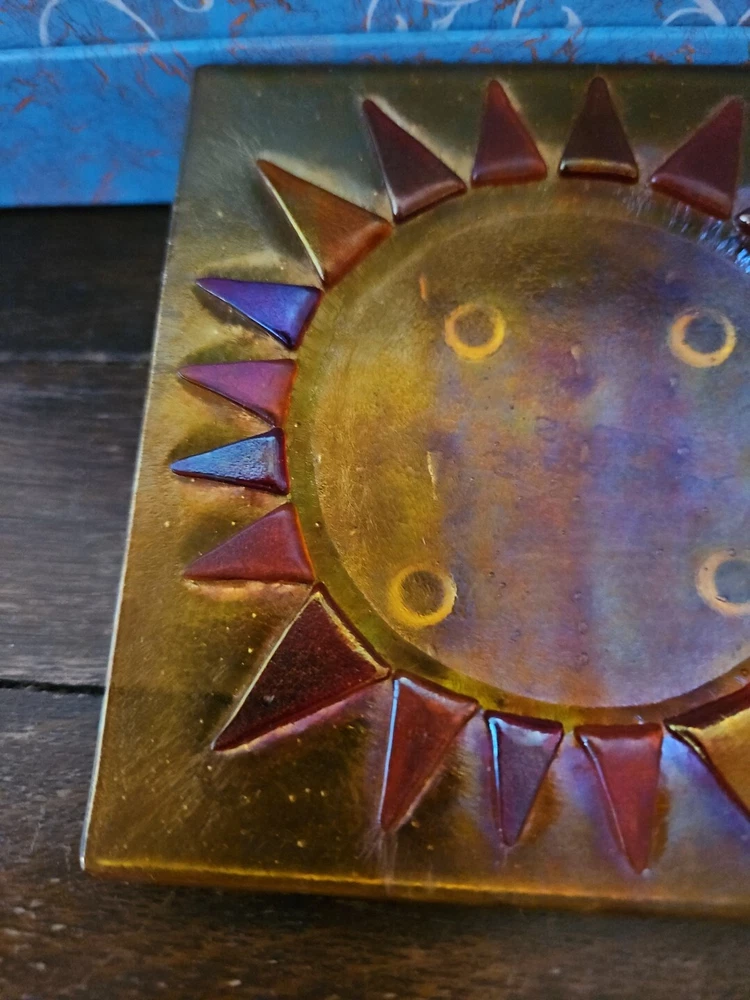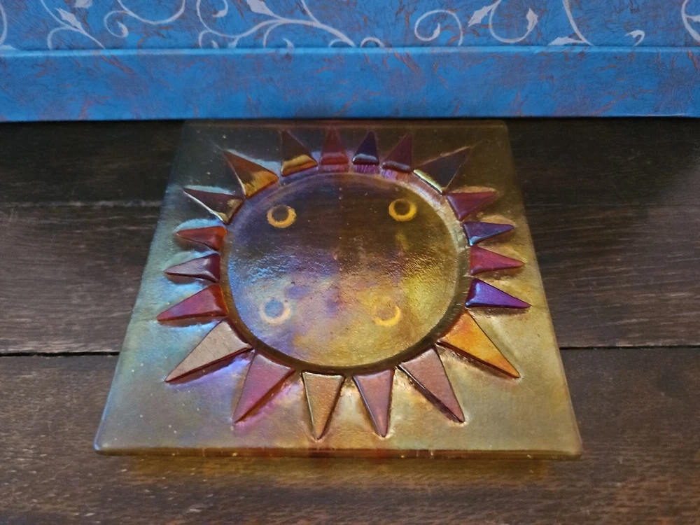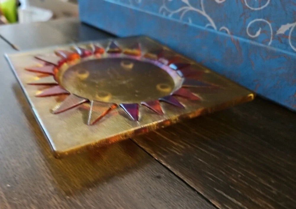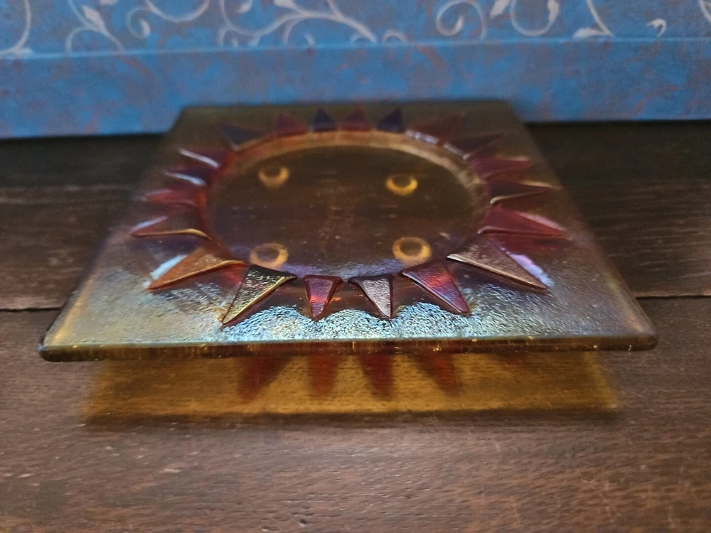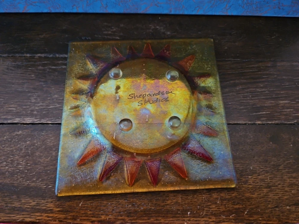 Add a touch of elegance to your wine table with this beautiful Shepardson Studios Amber Sunrise Art Glass Wine Coaster. The 5-in x 5-in square coaster features a stunning sun pattern; etched in the glass is signed by the studio. The amber and red color combination adds a pop of color to your table setting. This original studio-crafted coaster is made of high-quality glass and is perfect for any occasion. It is easy to clean and maintain. Four rubber pedestals to prevent from damage. This wine bottle coaster is perfect for your dinner table. Weighs 7.5 ounces without packaging. It is beautiful. Shepardson Studios is a company that produces an extensive line of kiln-fired glass tableware. The company is located in Black Mountain, North Carolina, USA. Thank you for looking, glory2god911