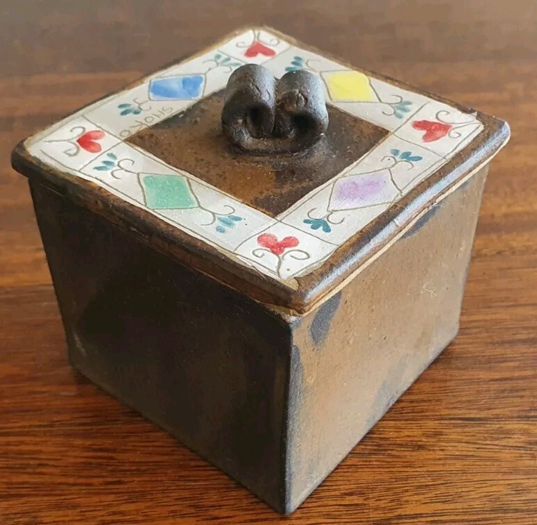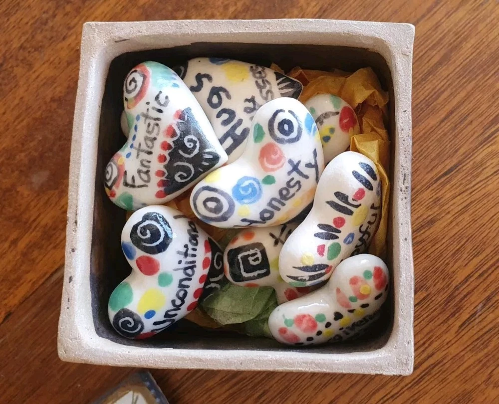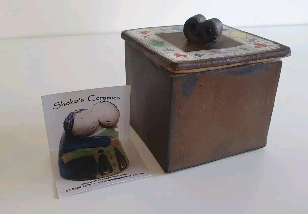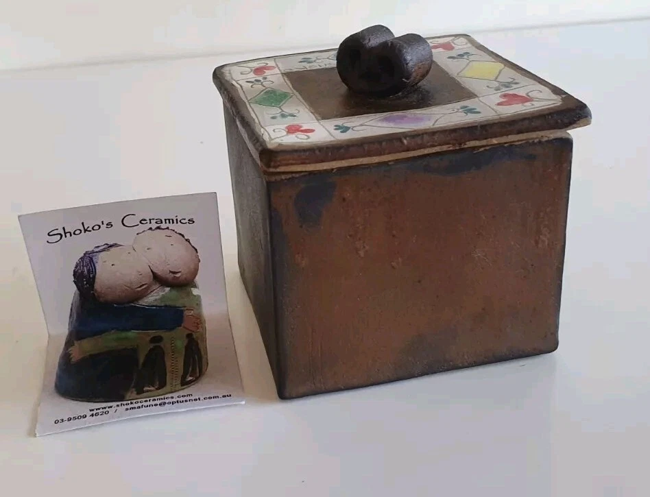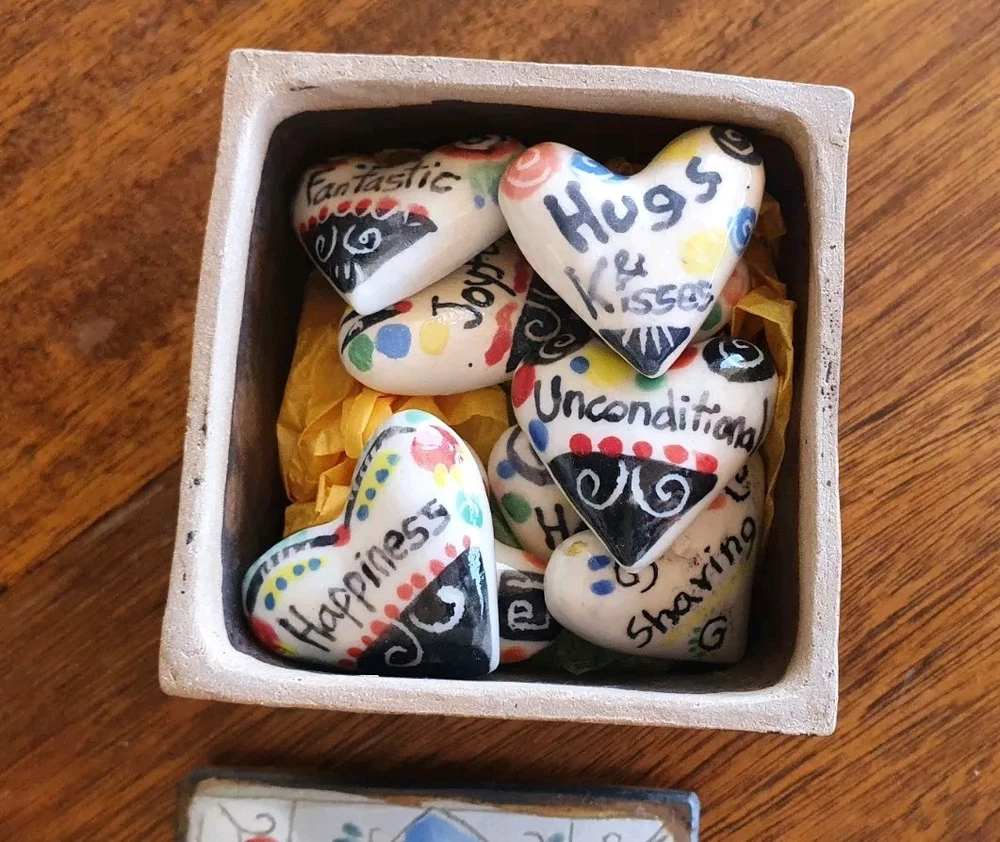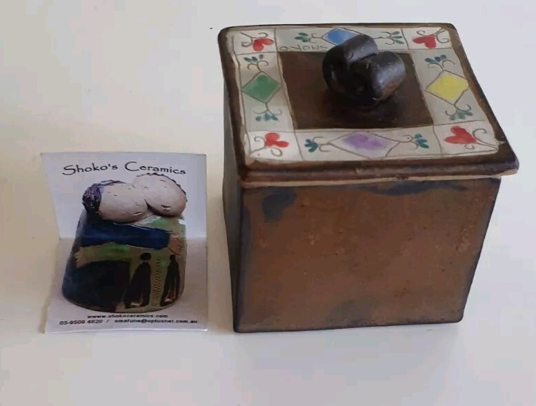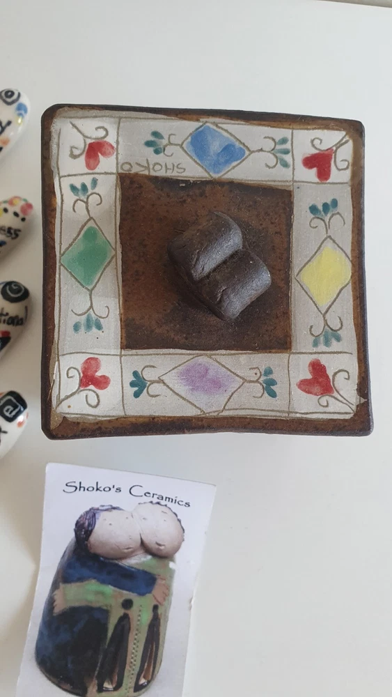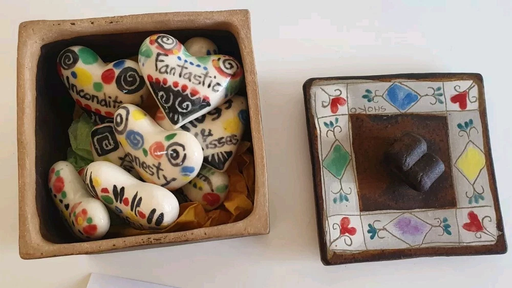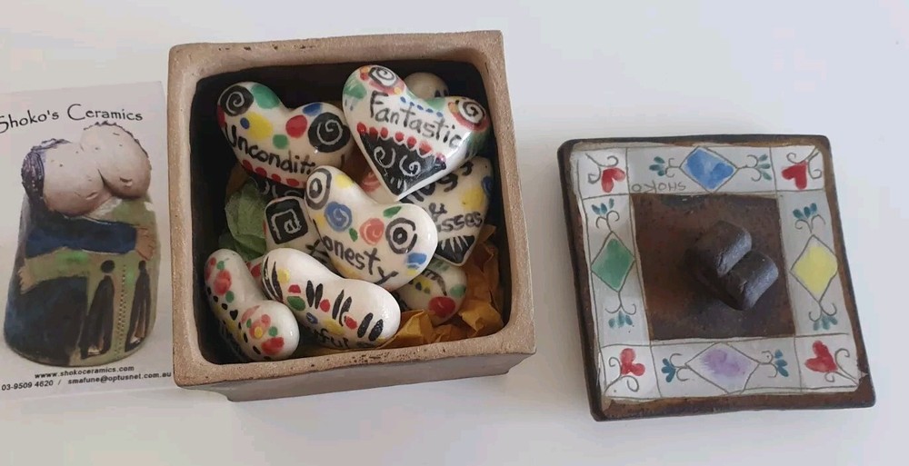 Hand Painted Studio Pottery 'The Box of Love' with nine (9) Heart-shaped ceramic Hugs, Promises & Feelings hand made by Shoko Mafune of Shoko Ceramics ca. 2010. Measures 9cm to top of handle, square sides 7.5cm, weighs 463g including nine hearts. Perfect condition. Japanese-born Shoko Mafune trained under ceramic masters in Japan in the 1970s followed by study, research and exhibiting in Europe and Japan in the '80s before settling in the Philippines. Since the early 2000s Shoko has lived between the Philippines and Melbourne where she has continued her practice, Shoko Ceramics, exhibiting at artist markets as HugBell Ceramics and teaching Japanese ceramics. Artist Statement 'The Box of Love' "I had been a stall holder the Sunday Craft Market at Williamstown and Hawthorn, Victoria almost 3 years. On one particular Sunday I placed a red heart shaped box along with pencil and paper on my stand. I asked the people who come to my stand to write down '' What is Love " for them. I collected their messages, and recreated their thoughts on to my small ceramics hearts. These hearts were then shared with others at the next Sunday Market. This become my small LOVE project that I 'd hoped would connect people through mutual feelings." "I have played with clay since I was a child. My techniques were developed from learning under a traditional Japanese ceramics master for five years. However my style has evolved and has been affected by living in different countries and encountering different cultures... My intention is to attract people to touch (not only look) and interact with my work, and in return I want my ceramics to connect the people together. I hope my art can, even for a slight moment, inspire feelings of delight in people." - Shoko Mafune