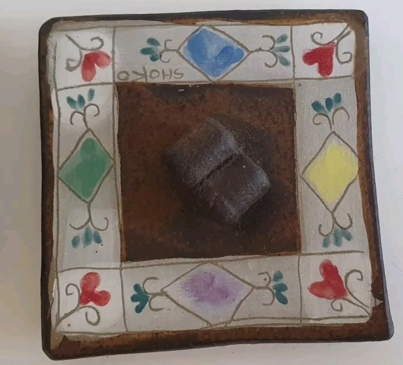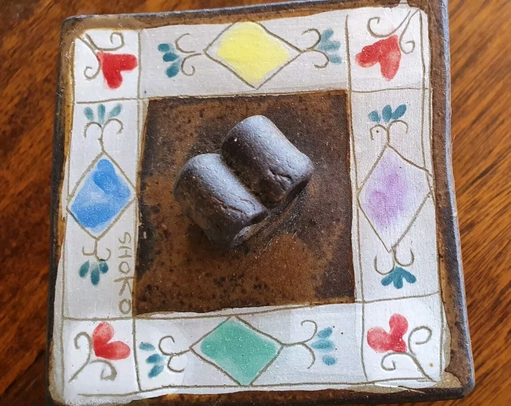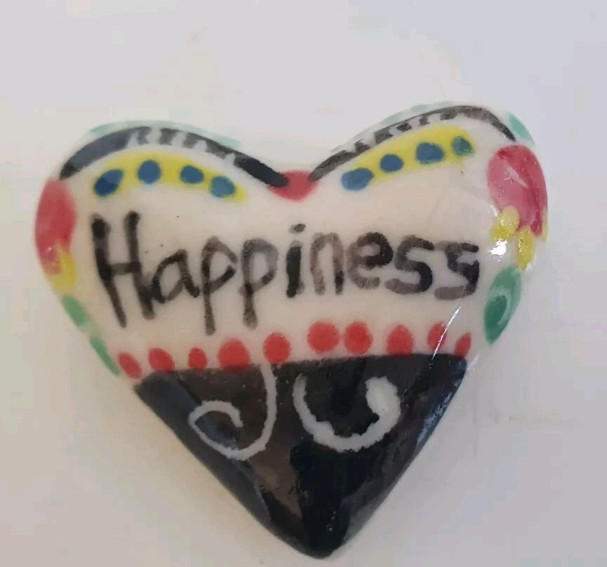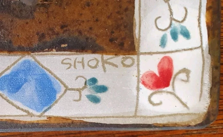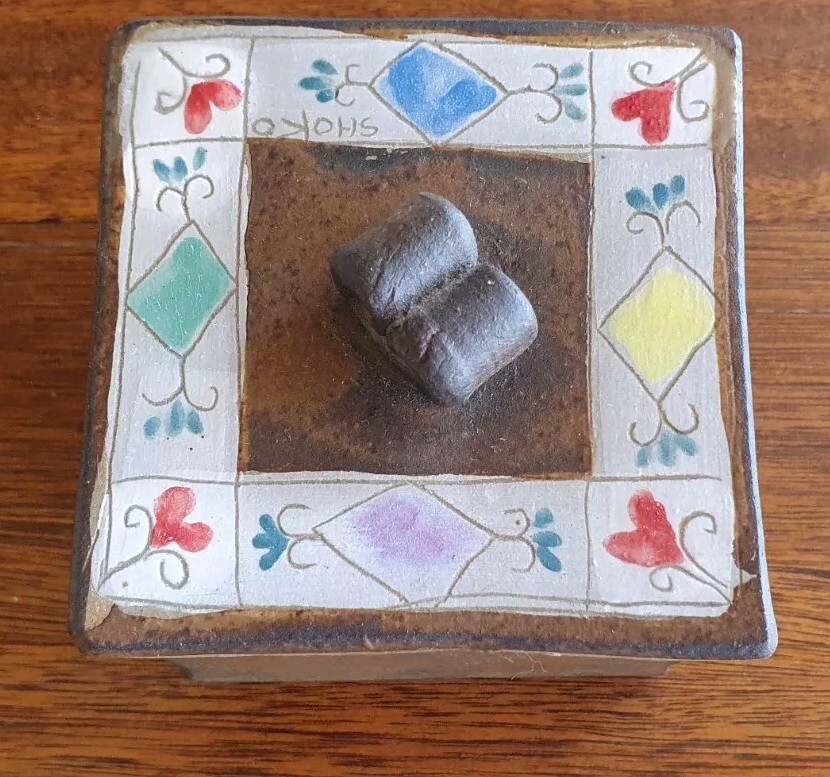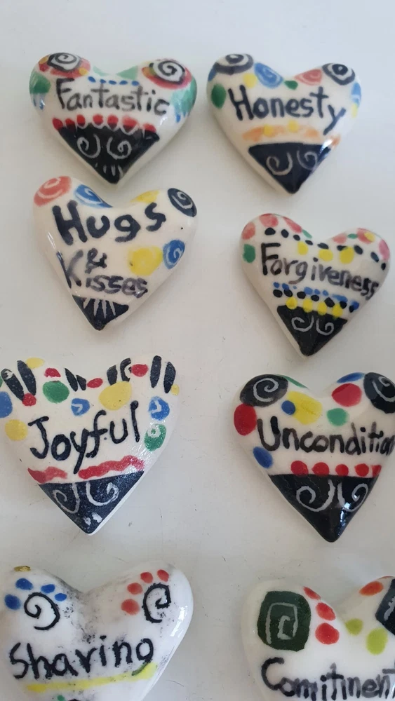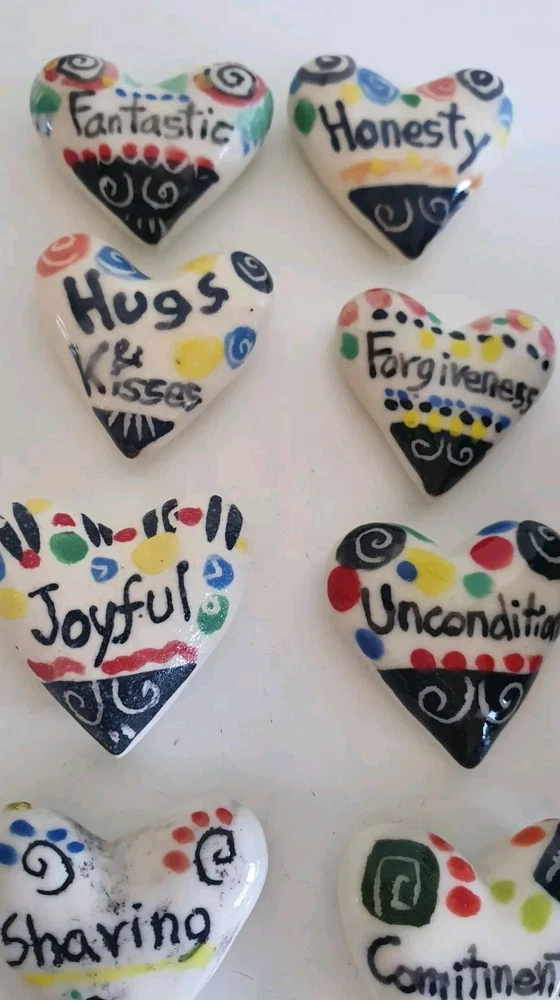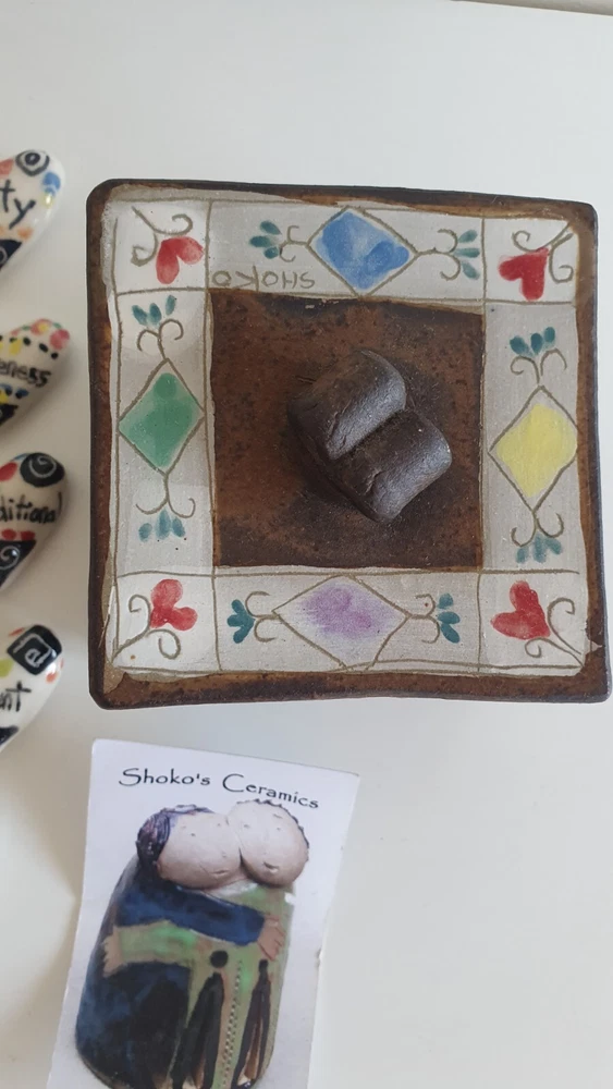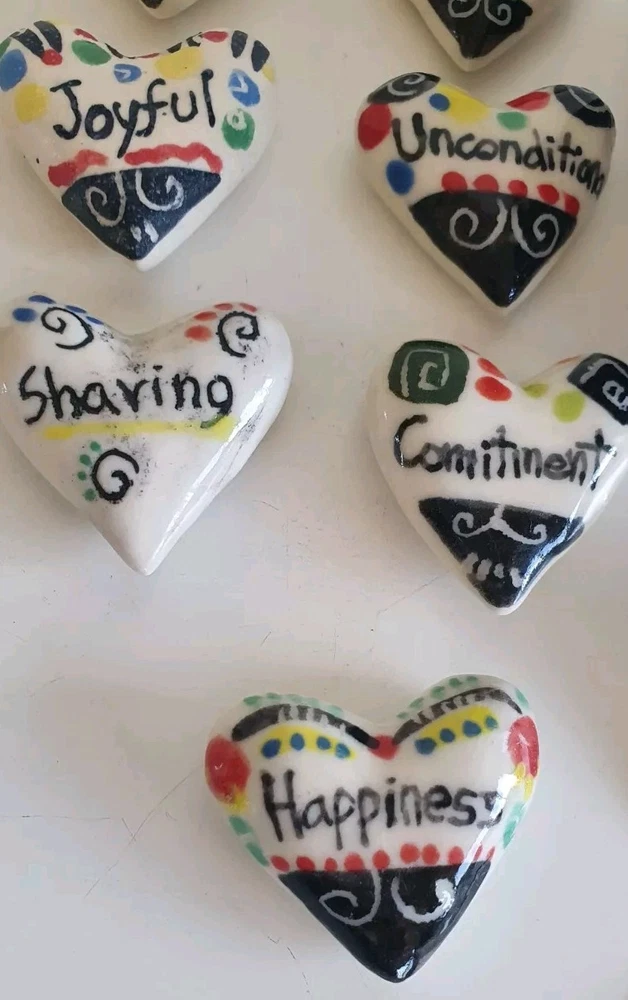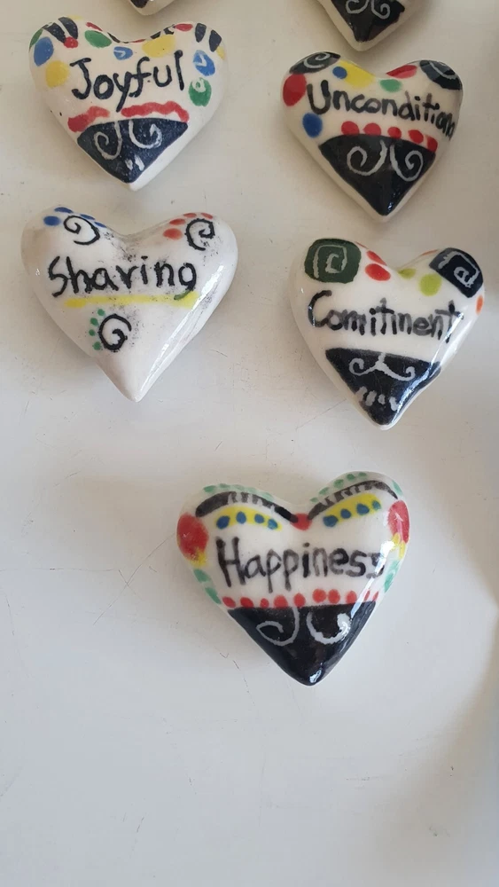 Hand Painted Studio Pottery 'The Box of Love' with nine (9) Heart-shaped ceramic Hugs, Promises & Feelings hand made by Shoko Mafune of Shoko Ceramics ca. 2010. Measures 9cm to top of handle, square sides 7.5cm, weighs 463g including nine hearts. Perfect condition. Japanese-born Shoko Mafune trained under ceramic masters in Japan in the 1970s followed by study, research and exhibiting in Europe and Japan in the '80s before settling in the Philippines. Since the early 2000s Shoko has lived between the Philippines and Melbourne where she has continued her practice, Shoko Ceramics, exhibiting at artist markets as HugBell Ceramics and teaching Japanese ceramics. Artist Statement 'The Box of Love' "I had been a stall holder the Sunday Craft Market at Williamstown and Hawthorn, Victoria almost 3 years. On one particular Sunday I placed a red heart shaped box along with pencil and paper on my stand. I asked the people who come to my stand to write down '' What is Love " for them. I collected their messages, and recreated their thoughts on to my small ceramics hearts. These hearts were then shared with others at the next Sunday Market. This become my small LOVE project that I 'd hoped would connect people through mutual feelings." "I have played with clay since I was a child. My techniques were developed from learning under a traditional Japanese ceramics master for five years. However my style has evolved and has been affected by living in different countries and encountering different cultures... My intention is to attract people to touch (not only look) and interact with my work, and in return I want my ceramics to connect the people together. I hope my art can, even for a slight moment, inspire feelings of delight in people." - Shoko Mafune