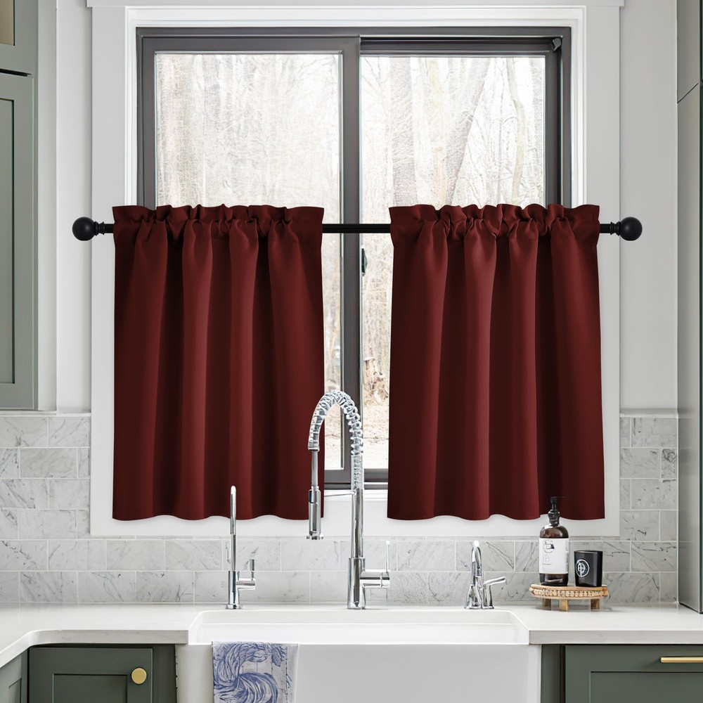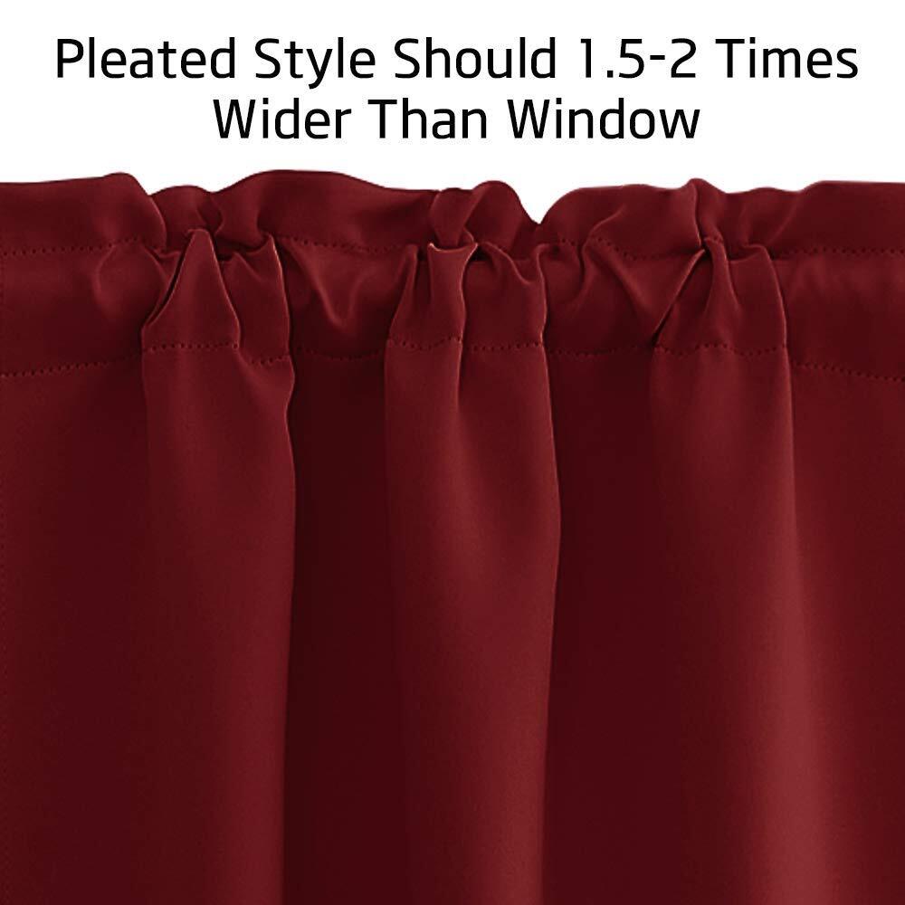 To allow light in and still be able to showcase a great view, try Blackout tier curtain. With BLACKOUT ROD POCKET VALANCE, there is more to it. FIT NICELY: The valances pair are constructed with a 3-inch pocket. The standard is applicable for all curtains pole. Each Panel measures 29-inches wide, length is measured overall 36-inches from the top to bottom of the panel. sold by 2 panels.PERFORMANCE: Different from the other ordinary lightweight fabric, with super soft and heavy innovative triple-weave 200 GSM polyester fabric, this product has better shading performance.The blackout curtains provide utmost privacy protection, making these the perfect window treatment for your home, office, apartment, business and more. This design has matching accessories such as window treatments, hampers, shower curtains.Microfiber thermal coating blocks light out well and also keeps the room at a set temperature by insulating against either heat or cold.EASY CARE: Valance is made to last. Machine washable in cold water, tumble dry. Quick iron or steam clean when needed. OTHER DESIGN VALANCE Once you search CURTAINS, a more amazing surprise waiting for you to explore. READY MADE: Set includes 2 panels of 34" wide x 36" length rod pocket (2" opening pocket) valance each panel. As a general rule, for proper fullness panels should measure 2-3 times the width of your window. UNIQUE DESIGN: Hang the curtains on a curtain rod through the rod pocket, 2" opening pocket create pleats easily. Hang these voile curtain panels with rings and hooks. That could be adjustable for height max 3 inches. Hooks space distance around 4-6 inches. STYLISH & PRIVACY: Rod pocket valance curtain provides absolute privacy for your indoor life, and protect your furniture and art pieces from fading when the bright sun streams in. This valance completes an elegant and smart look for your living space. WIDE COMPATIBILITY: Use the tier to cover the lower portion of windows or used alone on short windows, they can blend in easily with your kitchen, bathroom, laundry room, studio or whatever you used them. EASY TO CARE: Machine washable in cold water ( make sure the water temperature is lower than 91℉ ), tumble dry, quick iron or steam clean when it is necessary. Easy use of easy care.