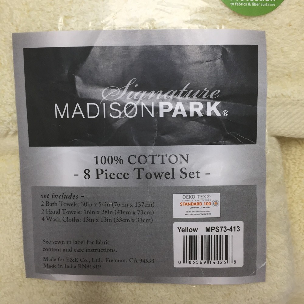 Signature Madison Park Yellow 8 Piece Towel Set 100% Cotton NEW CONDITION - NEW In Factory Packaging Wrap yourself in the plush comfort of the Signature Madison Park Yellow 8 Piece Towel Set, crafted from 100% cotton for an unmatched touch of luxury. Each piece, including four washcloths, two hand towels, and two bath towels, is designed to provide the ultimate softness, perfect for pampering after a bath or refreshing your space with a vibrant yellow hue. Color - Yellow Material - 100% Cotton 2 Bath Towel Measures - 30 in x 54 in 2 Hand Towel Measures - 16 in x 28 in 4 Wash Cloths Measures - 13 in x 13 in Care - Machine Washable & Dryer Safe