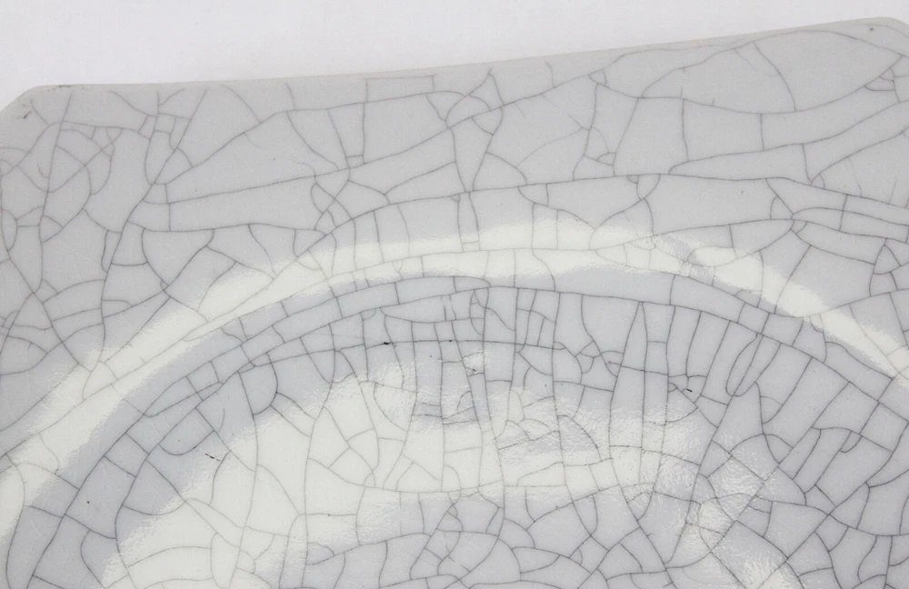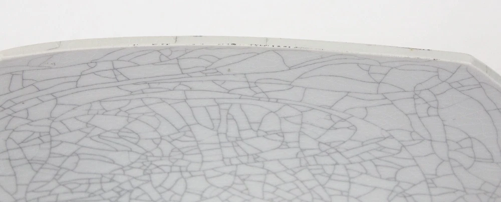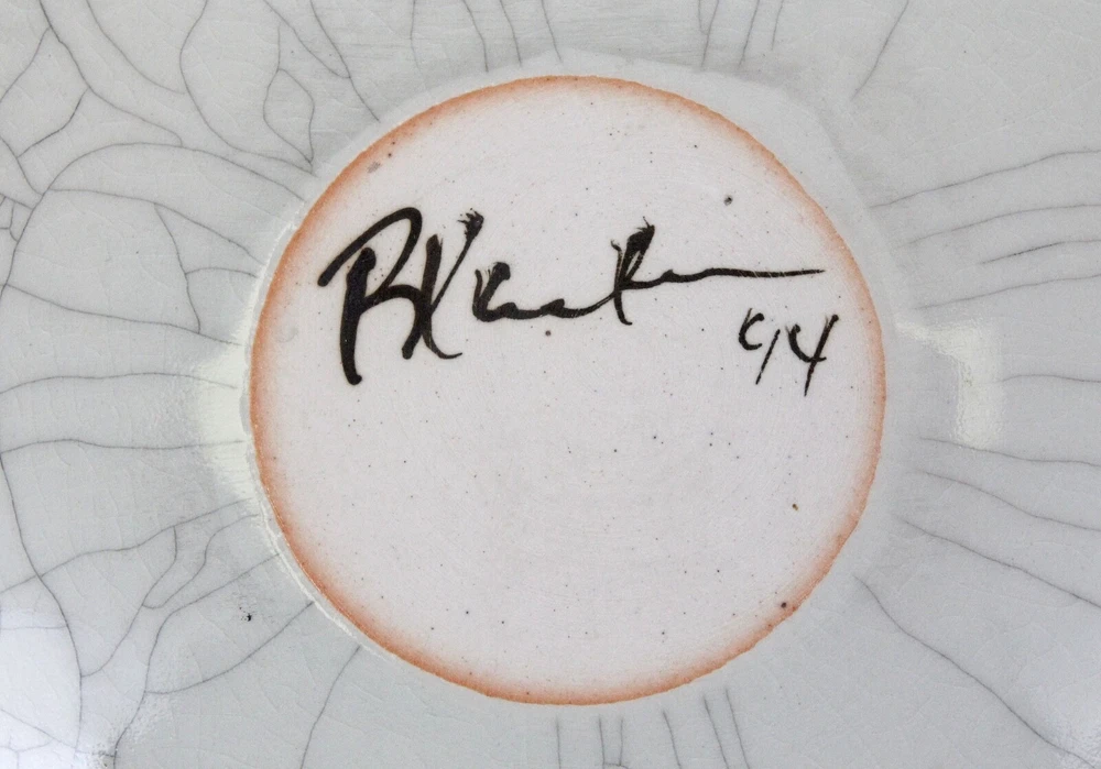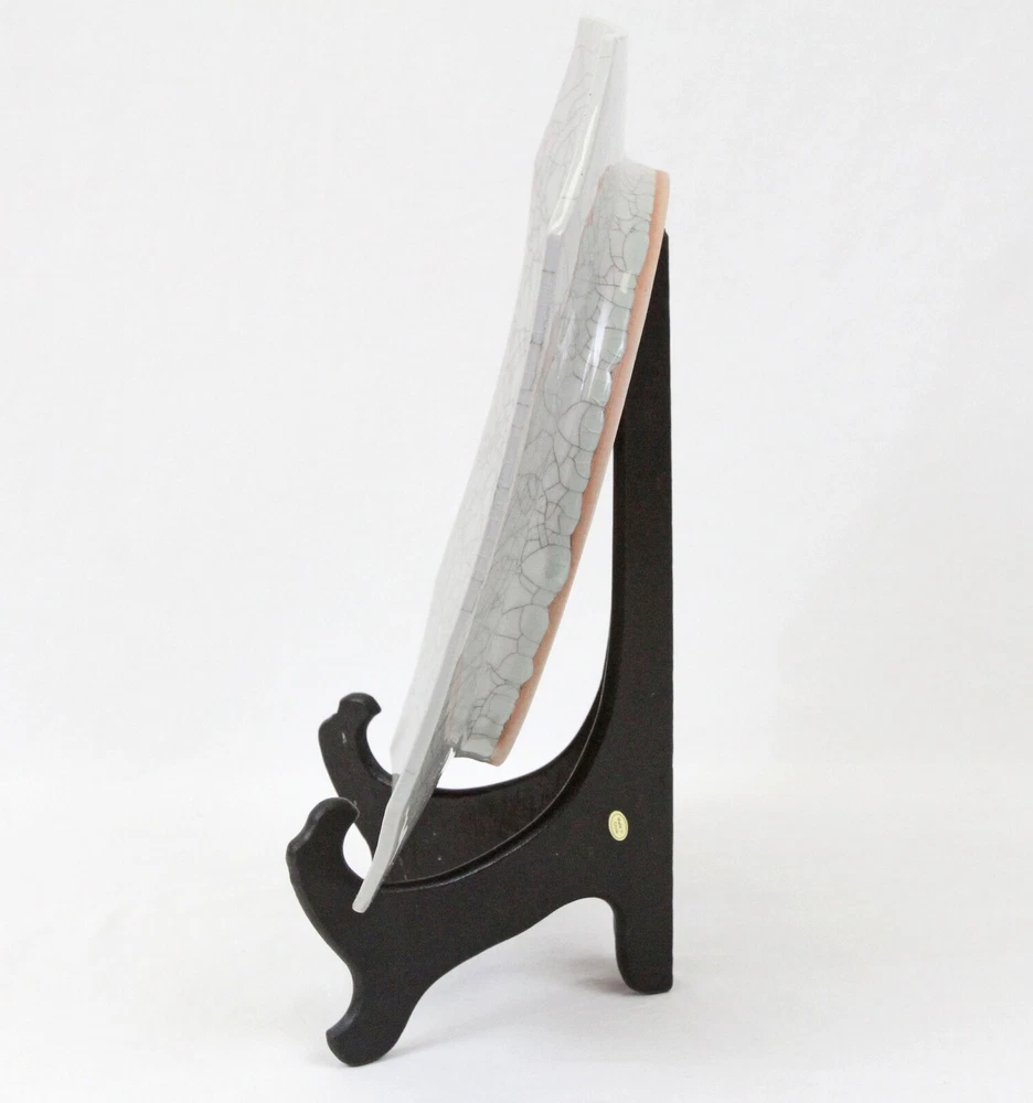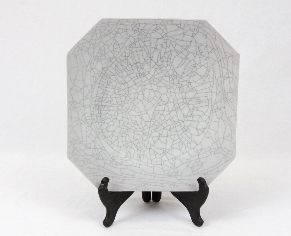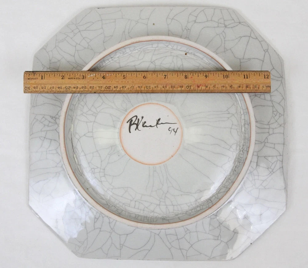 Ground shipping is free for the contiguous United States. This beautiful piece of handmade pottery is 13" x 13.25". Laid down on a table, the corners are 1.5" up to 1 7/8" tall. It comes with a wood stand, so you can display it. It could also be used as a modern art centerpiece bowl. There is a 1" difference in height between the middle of the platter and the edges. It's in great condition with no chips or cracks. There are some black lines or marks on it, maybe from the glaze, but not from being damaged. The back is signed by an unknown artist and dated 94. It weighs 4 lbs.