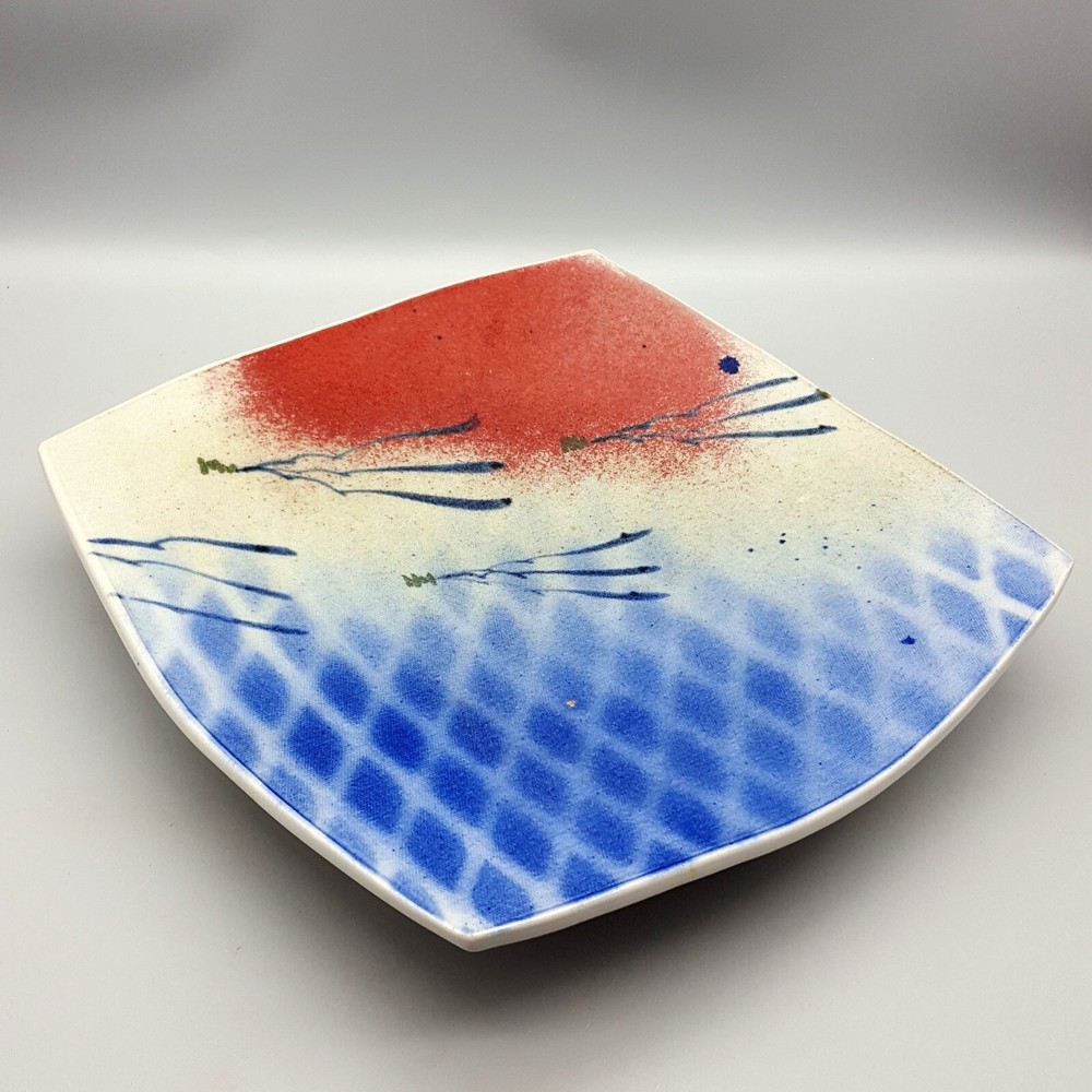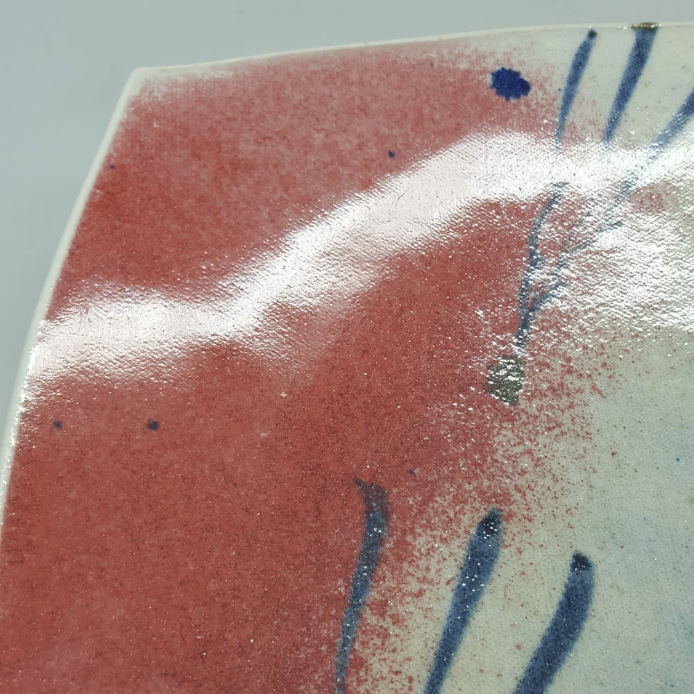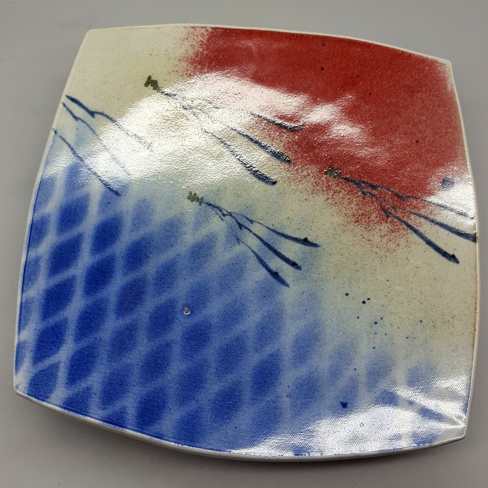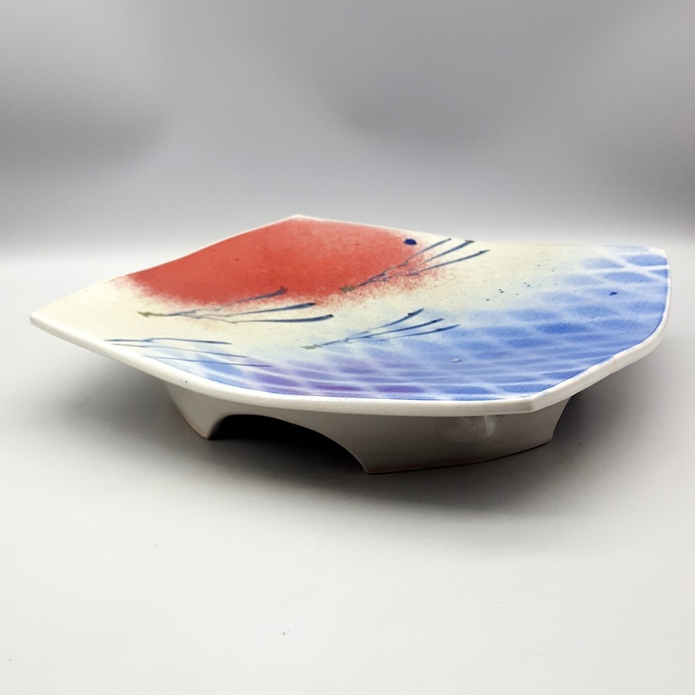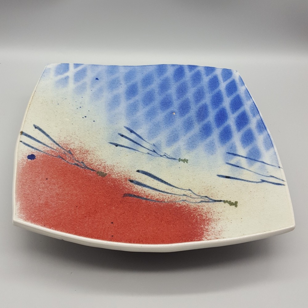 Oriental Ikebana-style footed platform, gently upcurved sides. Blue and red pattern glazed on a gray background. Abstract design suggests water and fish. Studio art pottery signed "Davis" on the underside. Stands 2" deep by about 10.75" square. Heavy for its size at 4 pounds. Noted a few production bumps, a pre-glaze chip on underside edge, and light scratches visible in reflected light. No other issues - no cracks, crazing nor stains. From clean, smoke-free storage. Thank you for visiting my eBay store. We are happy to bundle orders whenever possible, often use recycled packing, and typically ship in one day.