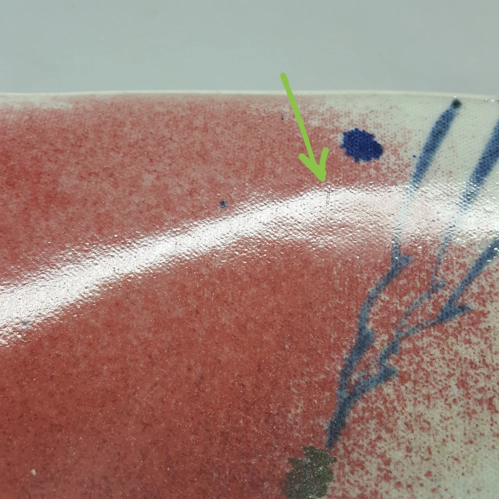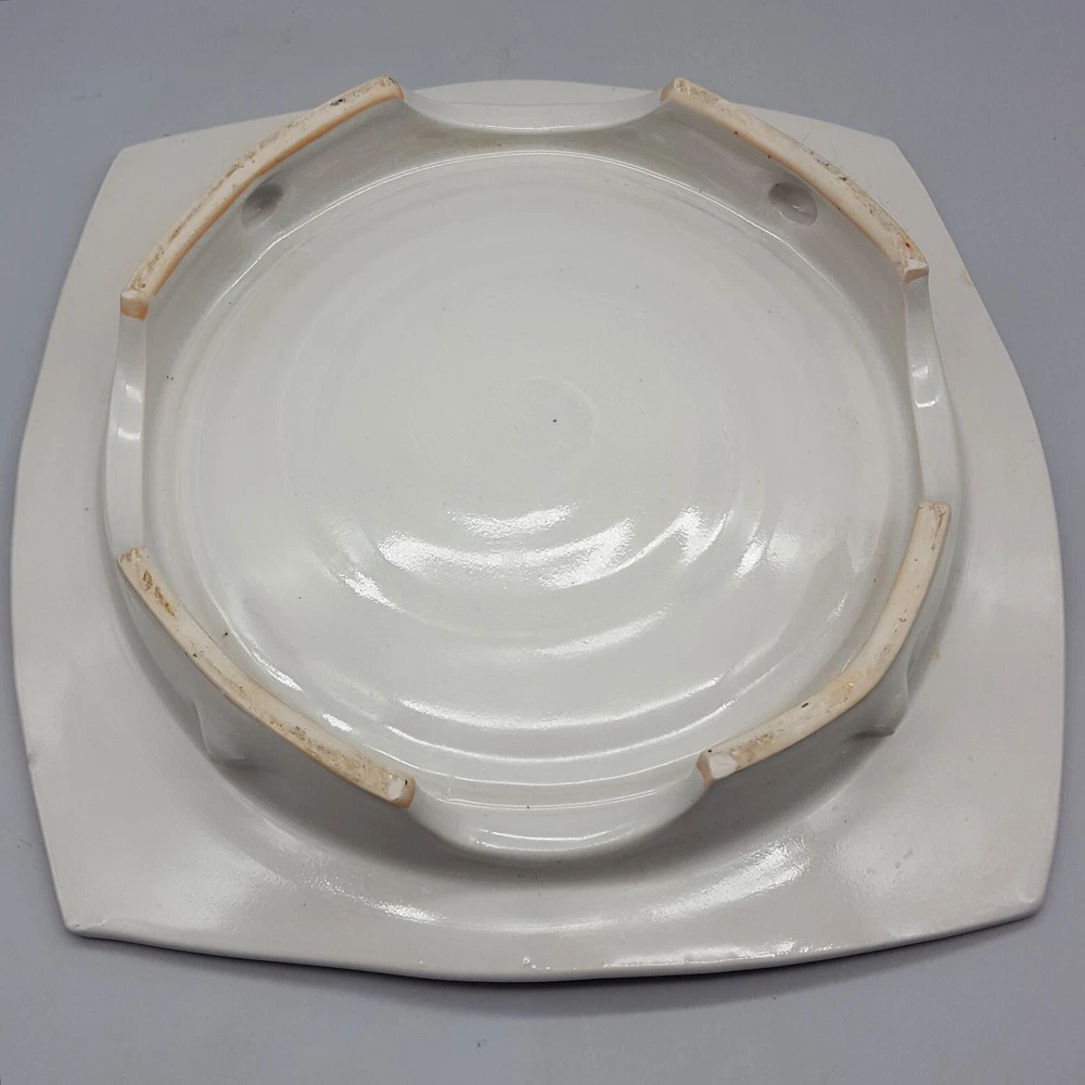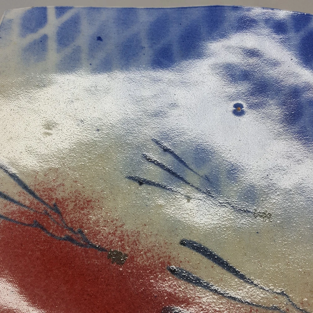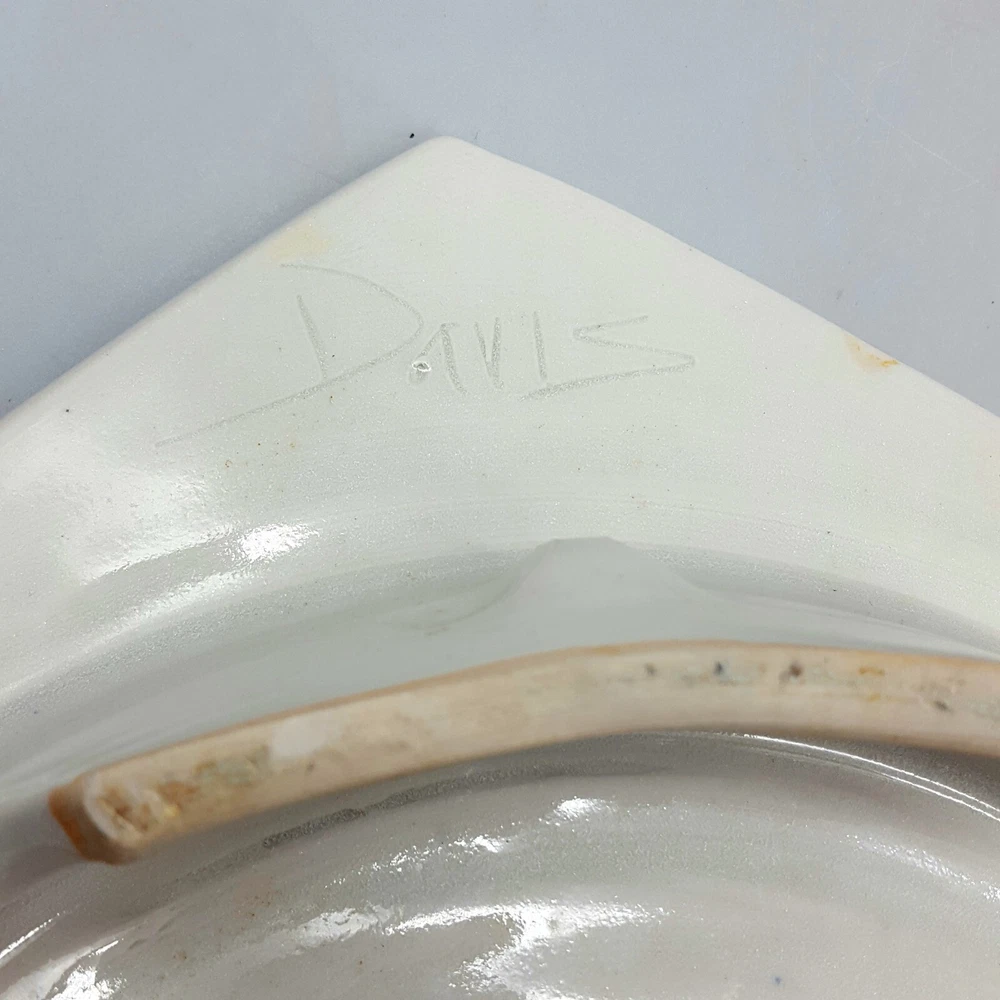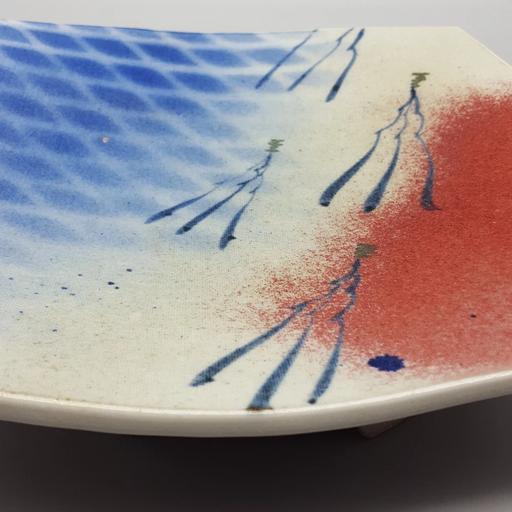 Oriental Ikebana-style footed platform, gently upcurved sides. Blue and red pattern glazed on a gray background. Abstract design suggests water and fish. Studio art pottery signed "Davis" on the underside. Stands 2" deep by about 10.75" square. Heavy for its size at 4 pounds. Noted a few production bumps, a pre-glaze chip on underside edge, and light scratches visible in reflected light. No other issues - no cracks, crazing nor stains. From clean, smoke-free storage. Thank you for visiting my eBay store. We are happy to bundle orders whenever possible, often use recycled packing, and typically ship in one day.
