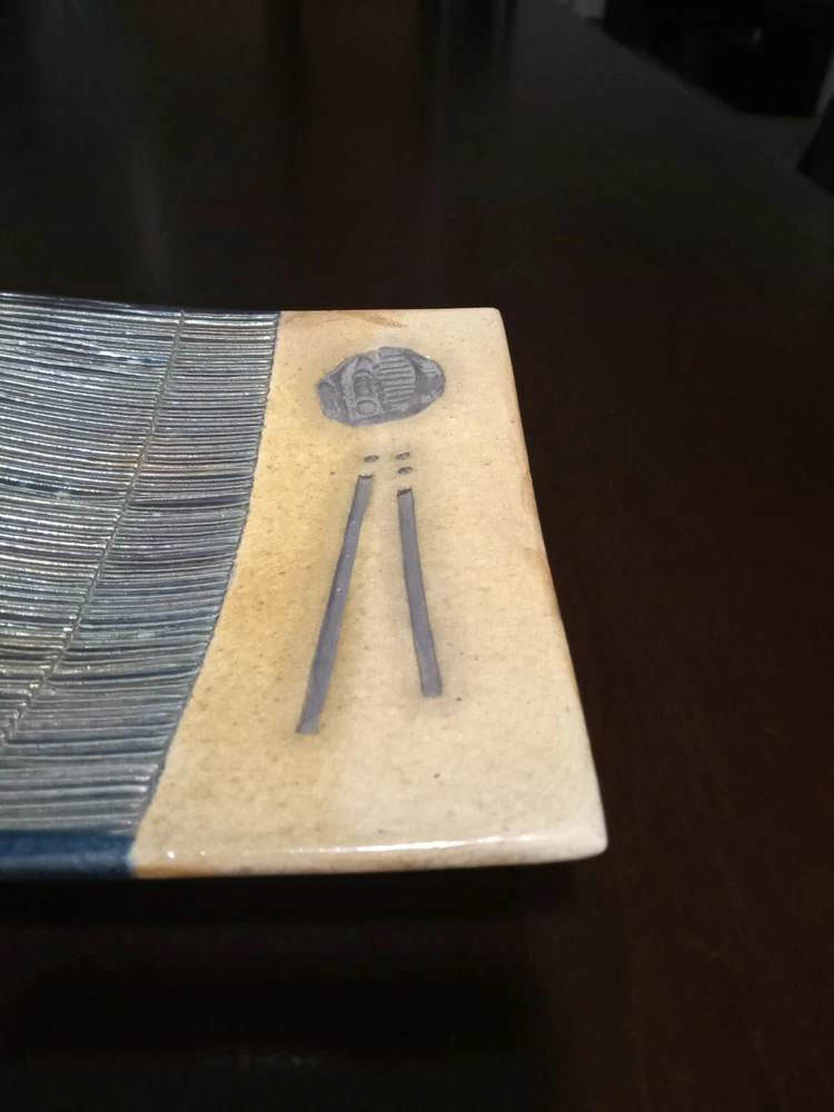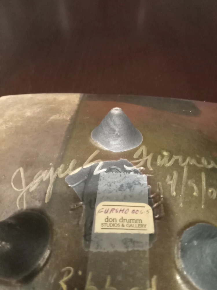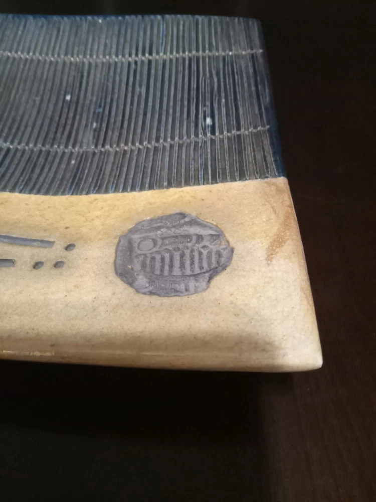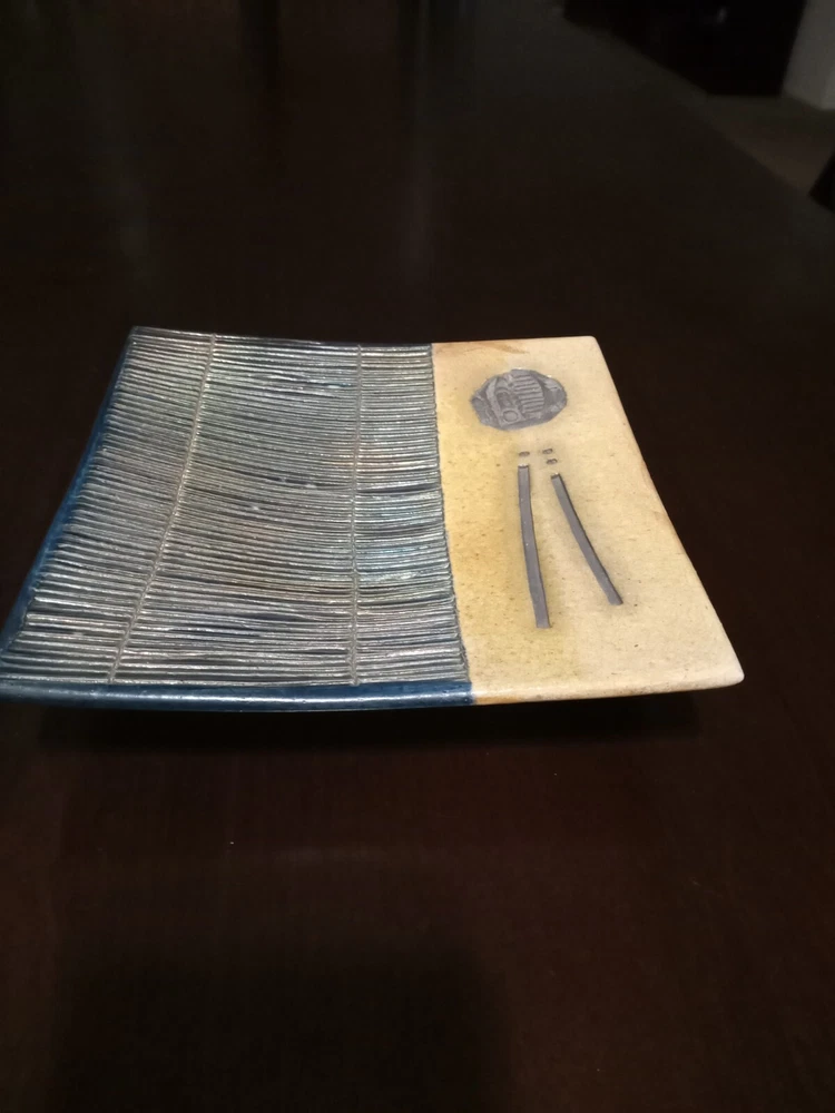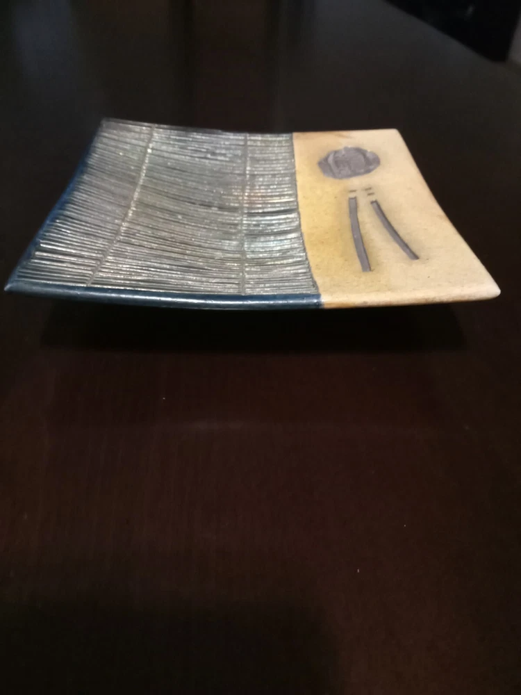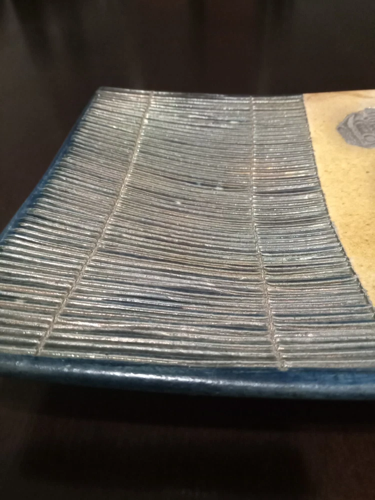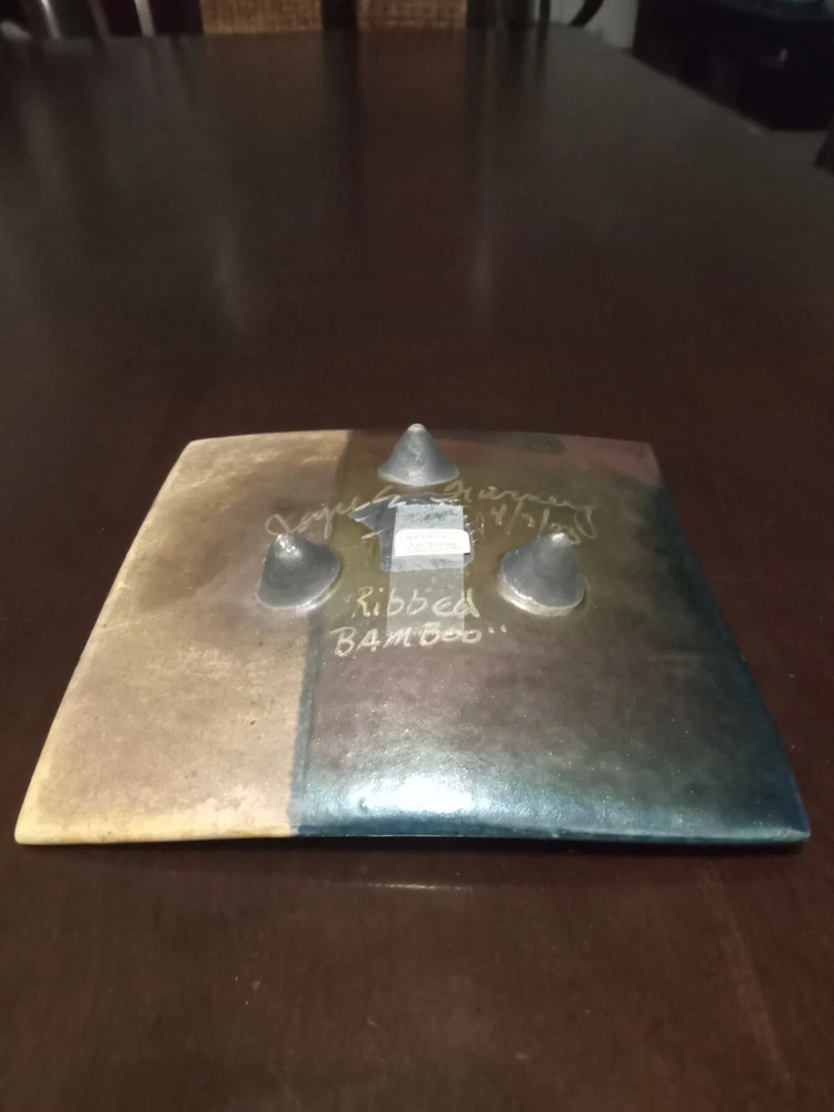 Modernist Handmade Raku Ceramic Studio Pottery textured dish, abstract pattern with beautiful shades of iridescent blue and gold. Titled "Ribbed Bamboo". Signed and dated 4/5/03. From Don Drummond Studio & Gallery. Measures approximately 1.25" H x 6.25" D. In excellent pre-owned condition. No chips or cracks.