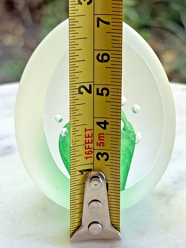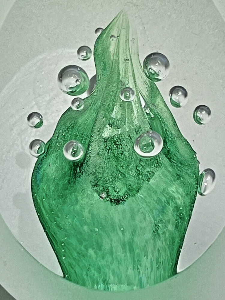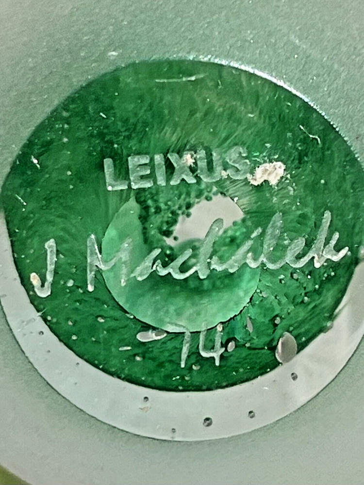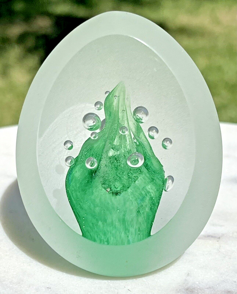 Signed "Leixus" J. Machalek 74 Studio Frosted Art Glass Egg Shaped Paperweight Signed, handcrafted paperweight - clear frost with green bubble interior. Botton reads: Leixus, J Machalek 74. Measures approx: 3" Signs of vintage age with a few scratches on the frost. Looks great displayed. Please view the photos closely and if you have any questions, be sure to inquire prior to purchase. Thanks for viewing! Good Hopes