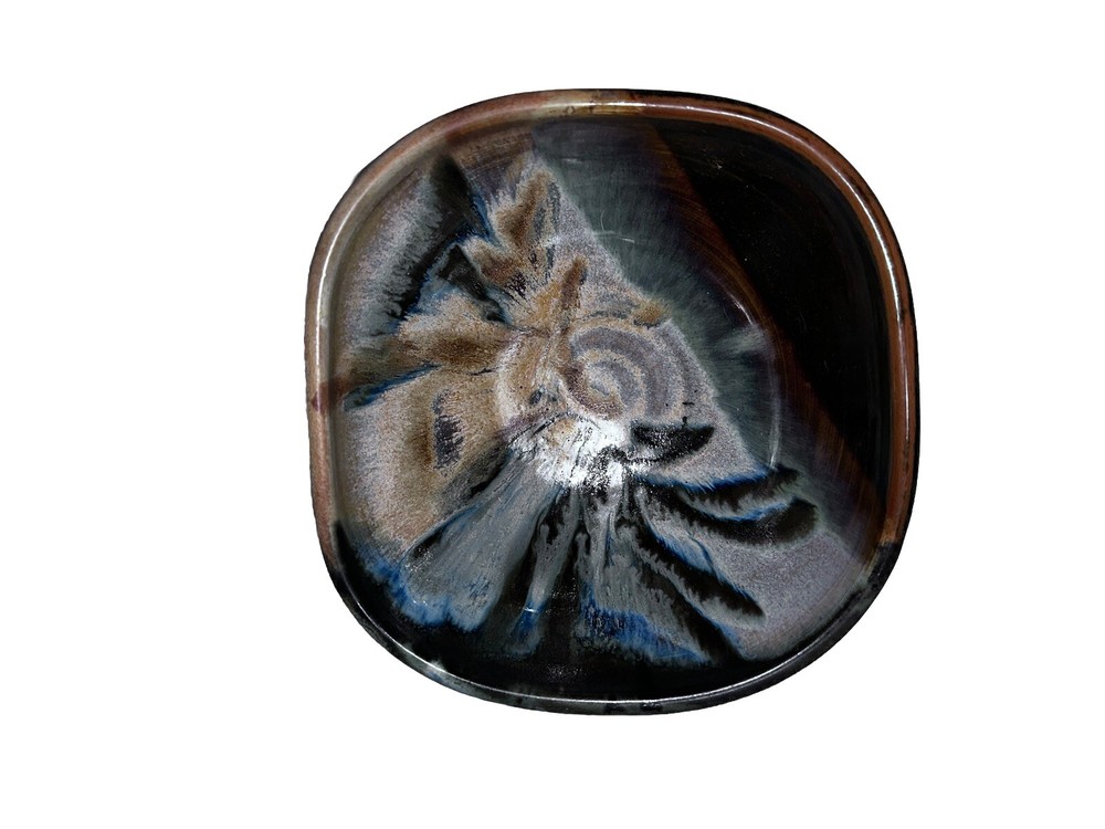 Add a touch of vintage charm to your decor with this beautiful studio pottery bowl. Handmade in America, this square bowl features a glossy finish and a unique swirl pattern in multicolor. Measuring approximately 6.5 inches in width and 3 inches in height, it's the perfect size for any occasion. Crafted from a combination of stoneware and ceramic, this original piece is a great addition to your collection. The bowl is signed by the artist and comes with an impressed backstamp. Whether you're using it to serve your favorite soup or as a decorative piece, this bowl is sure to impress.