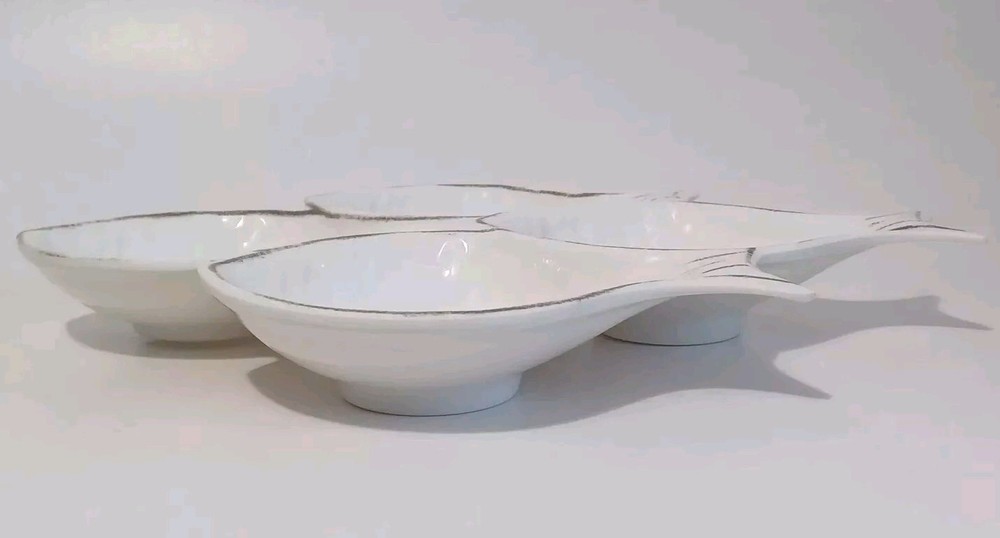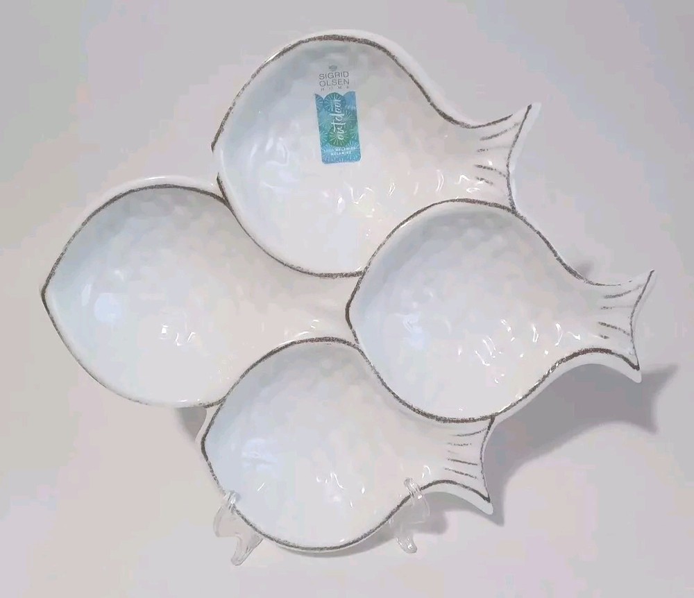 Add a touch of nautical charm to your serving collection with the Sigrid Olsen Home melamine white fish platter. Perfect for all occasions, this large tray measures 16 inches in diameter and 14 inches in width, with a depth of 1.75 inches, offering ample space for your favorite appetizers and dips. The shiny finish and intricate fish pattern make it a stylish addition to any table setting. Crafted from durable melamine, this serving platter is both lightweight and sturdy. It features four compartments, ideal for organizing a variety of dips and sauces. The tray is dishwasher safe for easy cleanup, ensuring that it remains a hassle-free addition to your entertaining ensemble.