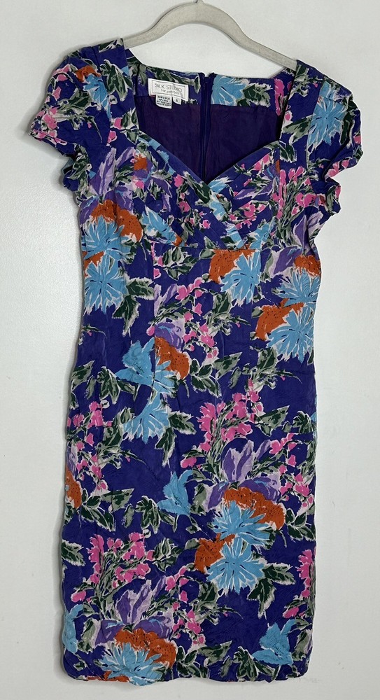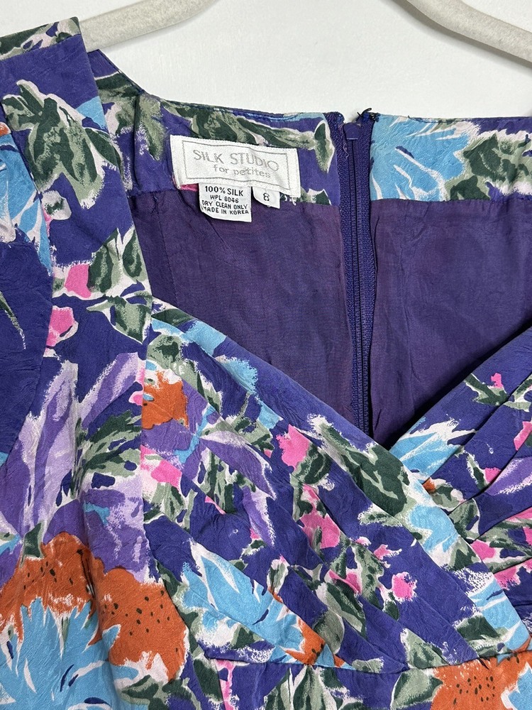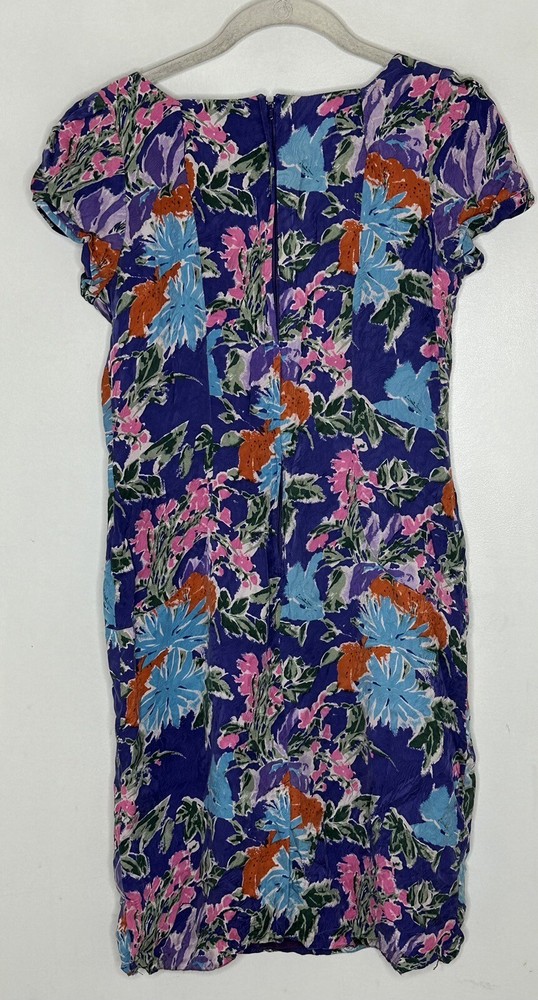 This beautiful purple floral dress is perfect for any casual occasion. The dress features a flattering V-neckline and a zip closure for easy wearing. The knee-length dress with puff sleeves is made from 100% silk chiffon material, making it both sheer and comfortable to wear. The sheath dress comes in size 8P and is from Max Studio, a well-known brand in women's clothing. The dress has a collarless design and no graphic print. It is perfect for the summer, fall, and spring seasons. The dress is not handmade and has no modifications. Enjoy the beautiful floral design and show off your fashion sense with this lovely dress. Bust 17.5” Waist 15” Length 36” C6