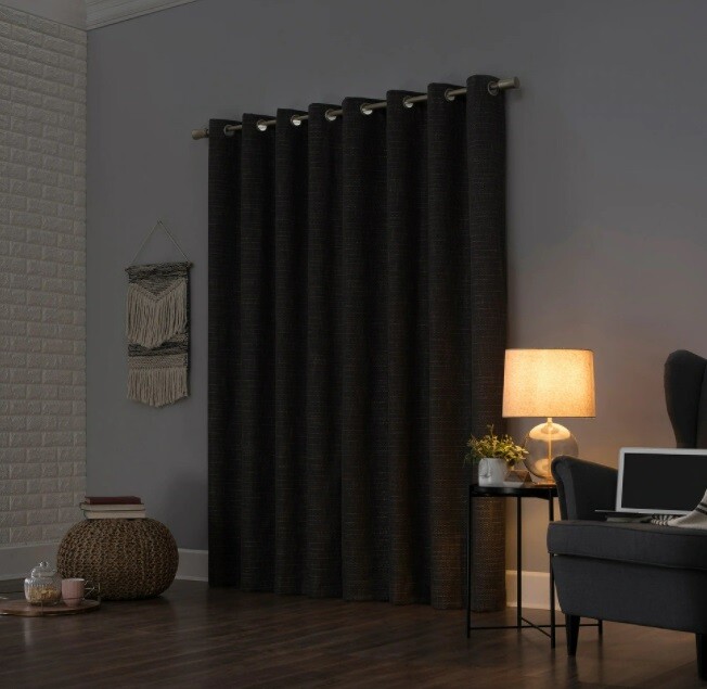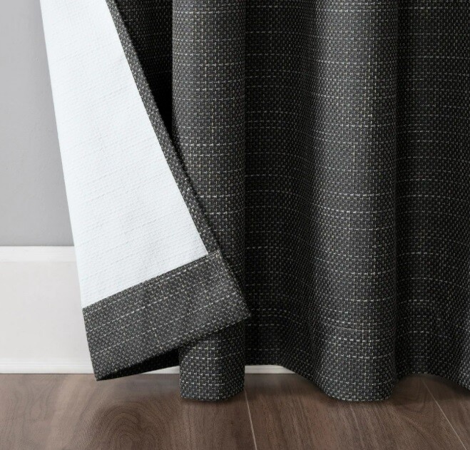 Description: Featuring an intersecting burlap weave texture, Sun Zero Kline Burlap Weave Thermal Extremes add a hint of rustic chic to any living space. Equipped with built-in metal grommets for easy hanging on standard curtain rods up to 1.5" in diameter. Sun Zero Extreme Blackout Thermal Lining is laboratory tested to block out 100% of light, reduce outside noise by up to 40%, and decrease energy lost through your windows by up to 40%. Comfort is optimized with thermal properties that help keep summer heat and winter chill out of your home. Built-in metal grommets allow for easy slide-through installation on curtain rods up to 1.5" in diameter. Hang in your entertainment room to eliminate screen glare and reduce distracting outside noise, or in your bedroom for enhanced privacy and a sounder, more uninterrupted sleep. Note: Set includes one single panel (two are pictured) Features: -Intersecting burlap weave texture adds a hint of rustic chic -Extreme Thermal Blackout technology blocks out 100% of outside light -Thermal properties help keep summer heat and winter chill out of your home -Noise reduction by up to 40% helps you get a sounder, more uninterrupted sleep -Built-in metal grommets fit curtain rods up to 1.5" in diameter Country of Origin: China Ships to the lower 48 states only. No local pickup. Returns accepted for 30 days.