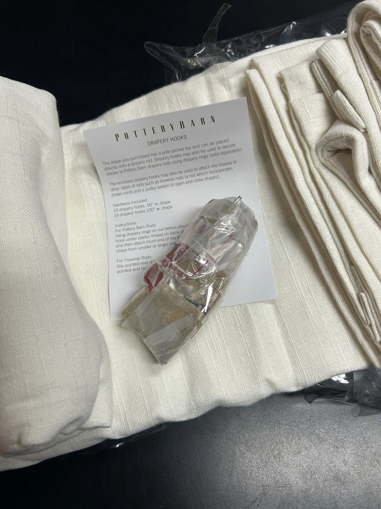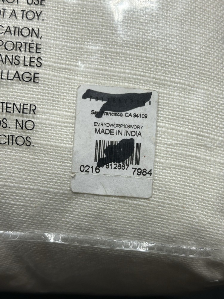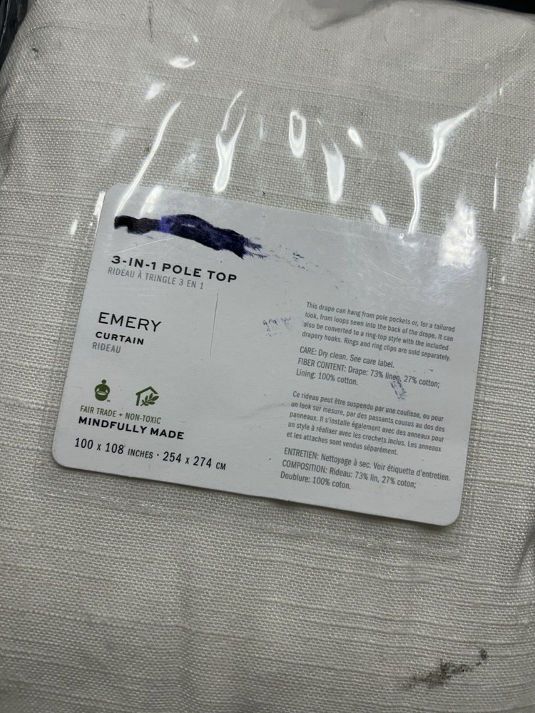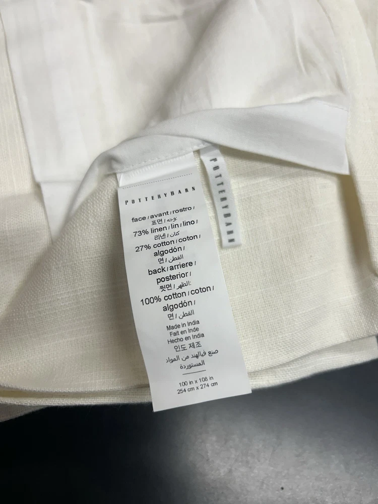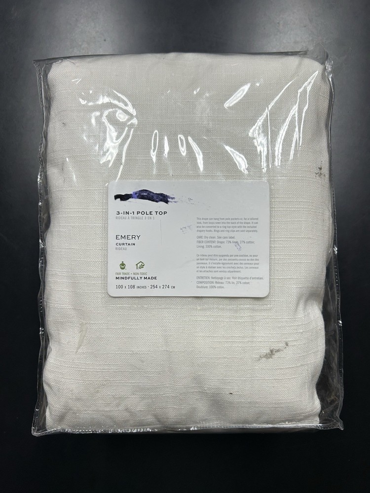 Gorgeous doublewide panel from Pottery Barn's Emery Linen Drapery collection in "ivory". Classic linen/cotton blend with light cotton lining. New, open box item. Includes hanging instructions and drapery hooks. No signs of use or wear-no stains, snags or marks. One panel Ivory 73% linen, 27% cotton Light filtering cotton lining 108" long by 100" wide 3-in-1 style top with options for rod pocket, tabs or drapery hooks/rings Original retail price $339