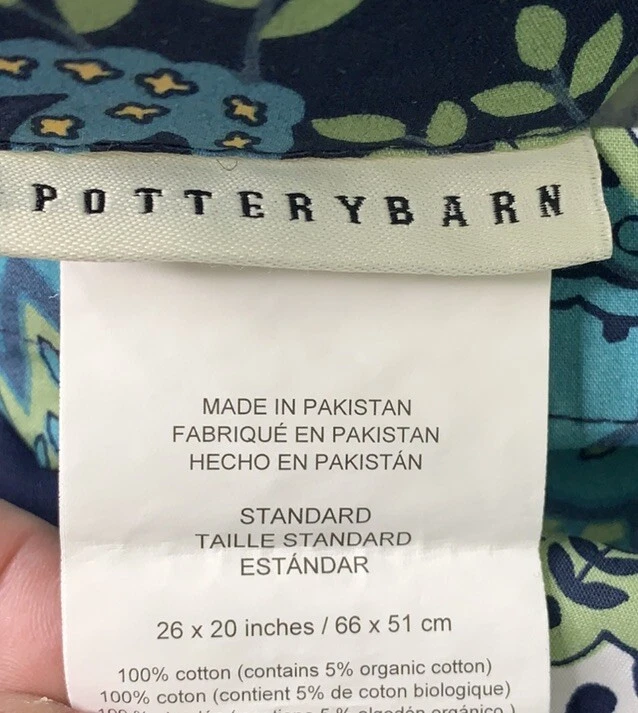 Single Pottery Barn Pillow Sham Standard Navy Blue Floral Paisley Cotton Excellent like new condition. No stains, holes or imperfections. Freshly laundered and pressed. Measures 26" long x 20" wide. Pillow not included. 100% cotton (contains 5% organic cotton). Envelope closure.