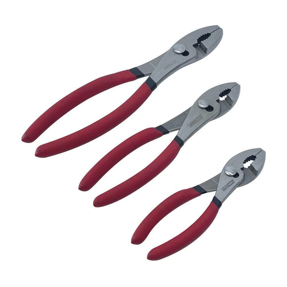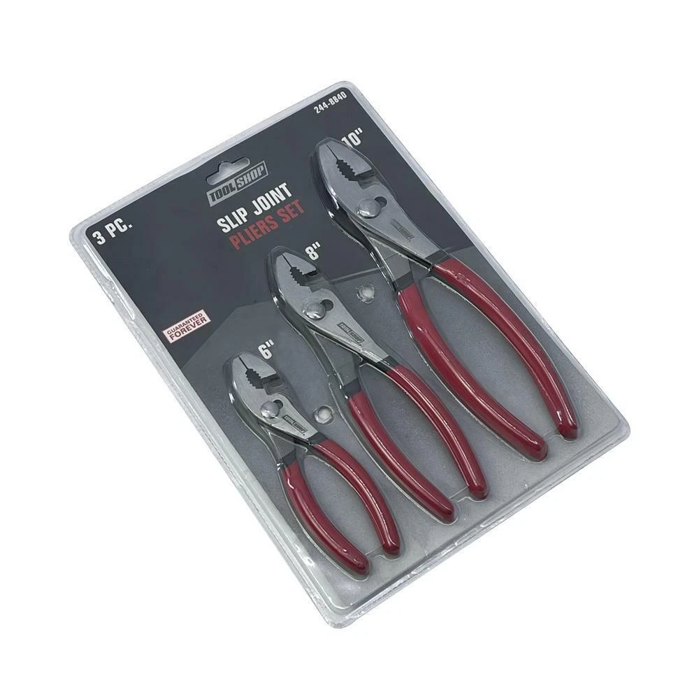 Slip Joint Pliers 3 Piece Set 6" 8" 10" Alloy Steel Dipped Cushion Grip Handles These slip joint pliers are made of drop-forged alloy steel with precision-milled teeth. It is heat treated, polished, and chrome plated. The cushion grip handles provide comfortable use for your projects. Includes: 6" slip joint pliers, 8" slip joint pliers, and 10" slip joint pliers Heat-treated, drop-forged alloy steel Fully polished Hardened jaws: HRC43-45 Double-dipped cushion grip handles Features Product Type Plier Sets Handle Grip Type Dipped Finish Fully polished Material Drop-forged alloy steel Manufacturer Warranty Lifetime Includes 6" Slip joint pliers, 8" Slip joint pliers, 10" Slip joint pliers Details Shipping Dimensions 12.31 H x 8.75 W x 0.88 D Shipping Weight 1.8125 lbs Fast and Free Shipping You're already purchasing the item. Why pay additional for shipping, especially slow shipping? We get your order shipped out within 1-business day and delivered to your doorstep as quickly as possible. Competitive Pricing With our dynamic pricing model, our prices are always competitive. Our prices are some of the lowest that you will find on the internet. Rest assured that you're getting a good deal when purchasing with us. 30-day Money Back Guaranty We are committed to making sure that you leave this transaction satisfied. If you're unhappy with the product for any reason, you may return it back for your money-back or a replacement within 30 days. No questions asked!