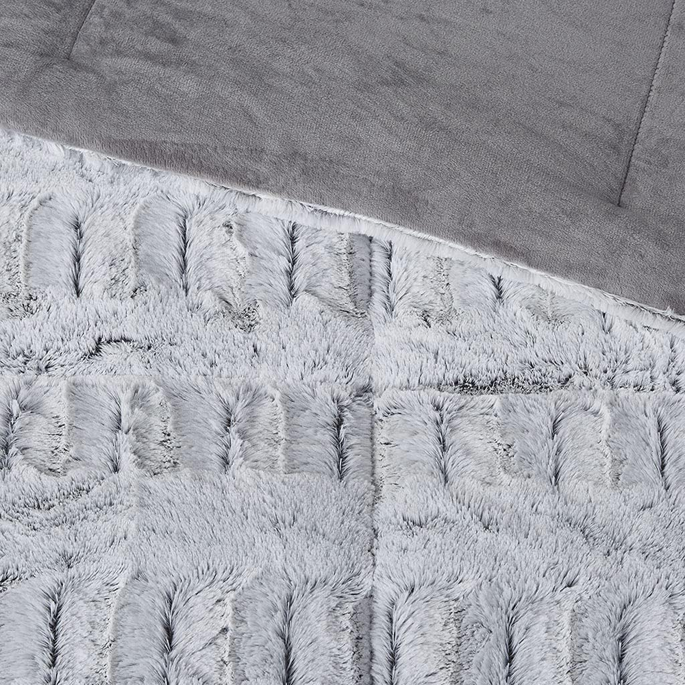 100% Long Faux Fur to Solid Mink Sleep in luxurious softness with the Madison Park Gia Long faux fur Comforter Set. For best results, use "no heat" or "air fluff" on your dryer to remove loose fibers The ultra-soft blush comforter brushed faux fur on the face that flips to a soft mink reverse, for a luxurious look and feel. Long faux fur design comforter provides exceptional warmth and comfort. Set Includes: 1 Comforter: 90"W x 90"L, 2 Standard Shams: 20"W x 26"L + 2"D CARE: Machine wash cold on gentle cycle, tumble dry on low heat, and do not bleach to keep the color vibrant. Commercial size washer is recommended. Minor shedding is expected with faux fur material and should subside after 3-4 washes Sleep in the pure softness and comfort of the Madison Park Gia Back Print Long Fur Comforter Mini Set. The ultra-soft grey comforter flaunts a stylish brushed faux fur on the face that flips to a soft faux mink reverse, for a luxurious look and feel. Matching shams (1 sham for Twin sizes) mirror the design of the comforter and feature a 2-inch flange to complete the comforter set. Hypoallergenic filling in the faux fur comforter provides exceptional warmth and comfort, while the end-to-end box stitching keeps the filling in place. Incredibly soft, this reversible long fur comforter mini set brings the perfect amount of comfort and glamorous style to your bedroom decor. This comforter is OEKO-TEX certified, meaning it does not contain any harmful substances or chemicals to ensure quality comfort and wellness.