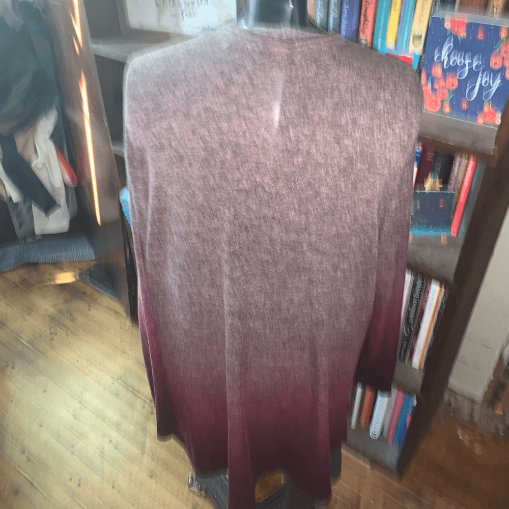 Soft Surroundings pink and gray, heathered, dipped hem, drape, cozy cardigan. In good, used condition. Approximately 23 inches from armpit to armpit, 33 inches long. From a pet and smoke free house.