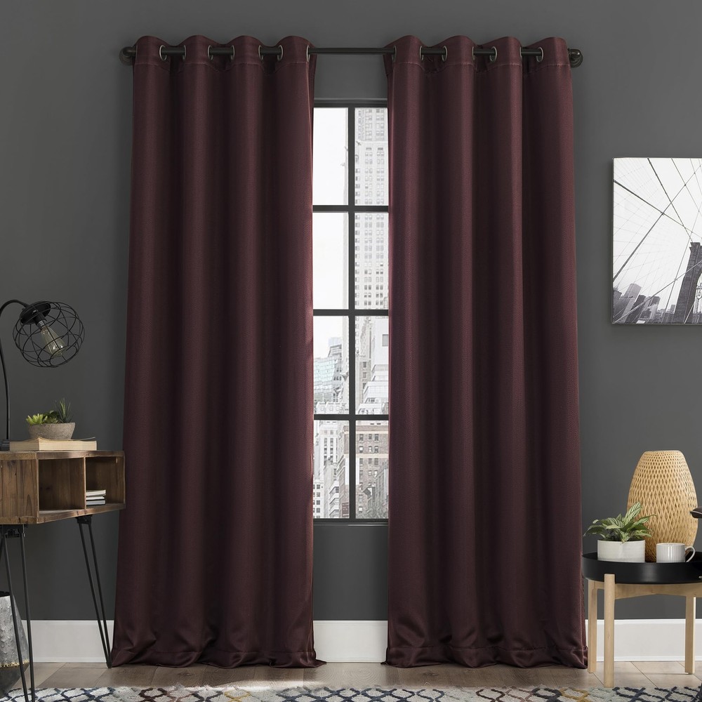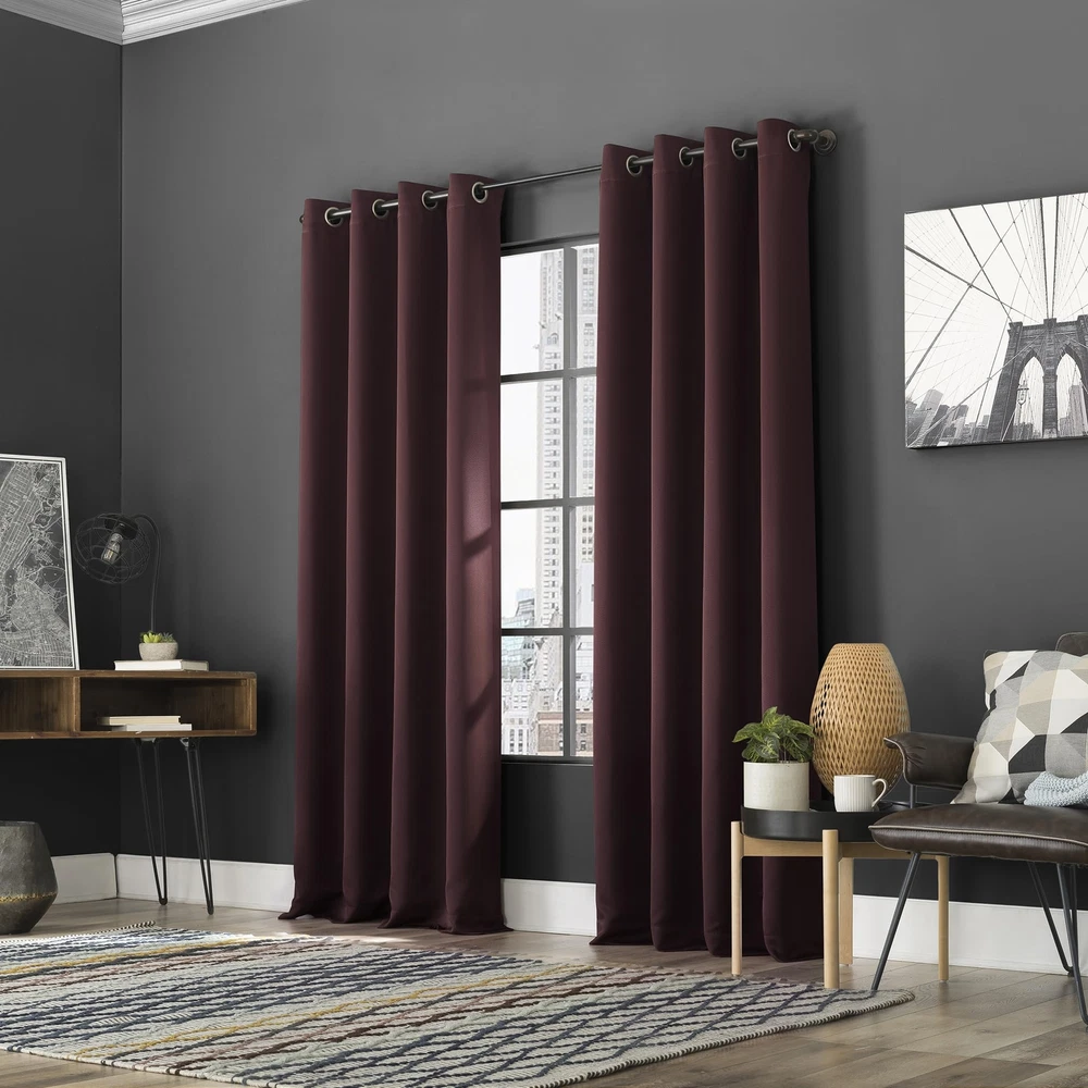 Soho Energy Saving Noise Reducing Blackout Grommet Curtain Panel Pairs infuse a modern sophistication into any living space. Equipped with built-in metal grommets for easy hanging on standard curtain rods up to 1.5" in diameter. Blackout technology blocks out most outside light, offers outside noise reduction by up to 30%, and decreases energy lost through your windows by up to 40%. Comfort is optimized with thermal properties that help keep summer heat and winter chill out of your home. Hang in your living room for enhanced privacy, or in your bedroom for a sounder, more uninterrupted sleep. Pair includes 2 merlot red panels, each measuring 54" width by 96" length. Measure carefully before selecting your desired size and quantity. Rod not included. Machine wash cold on gentle cycle. Use non-chlorine bleach when needed. Tumble dry on low heat, using a cool iron as needed. Blackout technology blocks out most unwanted light while enhancing privacy Energy efficient design reduces energy lost through your windows by up to 40% Thermal properties help keep summer heat and winter chill out of your home Noise reduction up to 30% helps you get a sounder, more uninterrupted sleep Built-in metal grommets fit curtain rods up to 1.5" in diameter Pair includes 2 panels