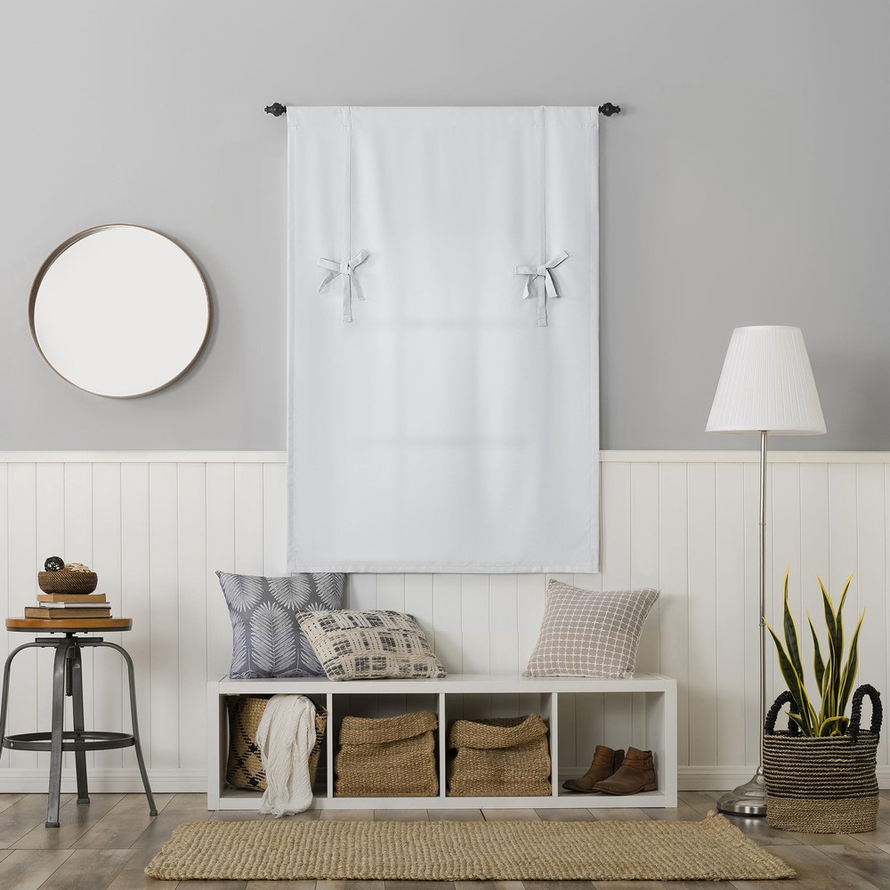Soho Energy Saving Blackout Rod Pocket Window Tie-up Shades infuse a modern sophistication into any living space. Adjustable to the desired height for optimal light control, each shade is equipped with a built-in rod pocket for easy hanging on standard curtain rods up to 1.5" in diameter. Blackout technology blocks out most outside light, offers outside noise reduction by up to 25%, and decreases energy lost through your windows by up to 25%. Comfort is optimized with thermal properties that help keep summer heat and winter chill out of your home. Hang in your living room for enhanced privacy, or in your bedroom for a sounder, more uninterrupted sleep. Sold as individual panels measuring 40" width by 63" length in color oyster white. Measure carefully before selecting your desired size and quantity. Rod not included. Machine wash cold on gentle cycle. Use non-chlorine bleach when needed. Tumble dry on low heat, using a cool iron as needed. Blackout technology blocks out most unwanted light while enhancing privacy Energy efficient design reduces energy lost through your windows by up to 25% Thermal properties help keep summer heat and winter chill out of your home Noise reduction up to 25% helps you get a sounder, more uninterrupted sleep Adjustable to desired height for optimal light control Built-in rod pocket fits curtain rods up to 1.5" in diameter