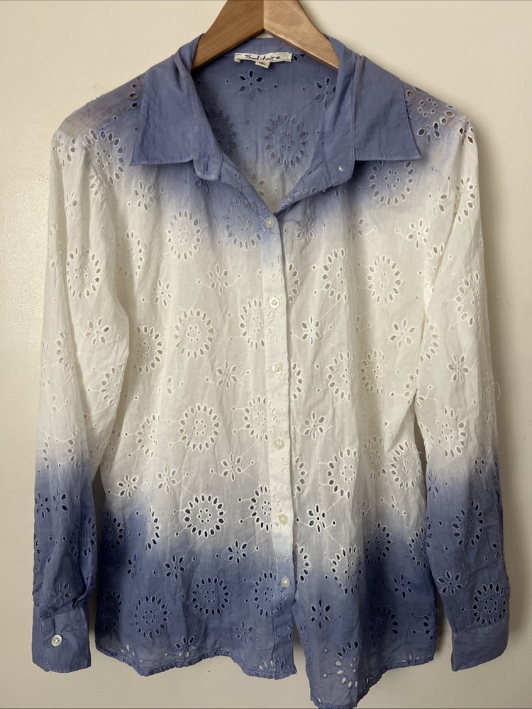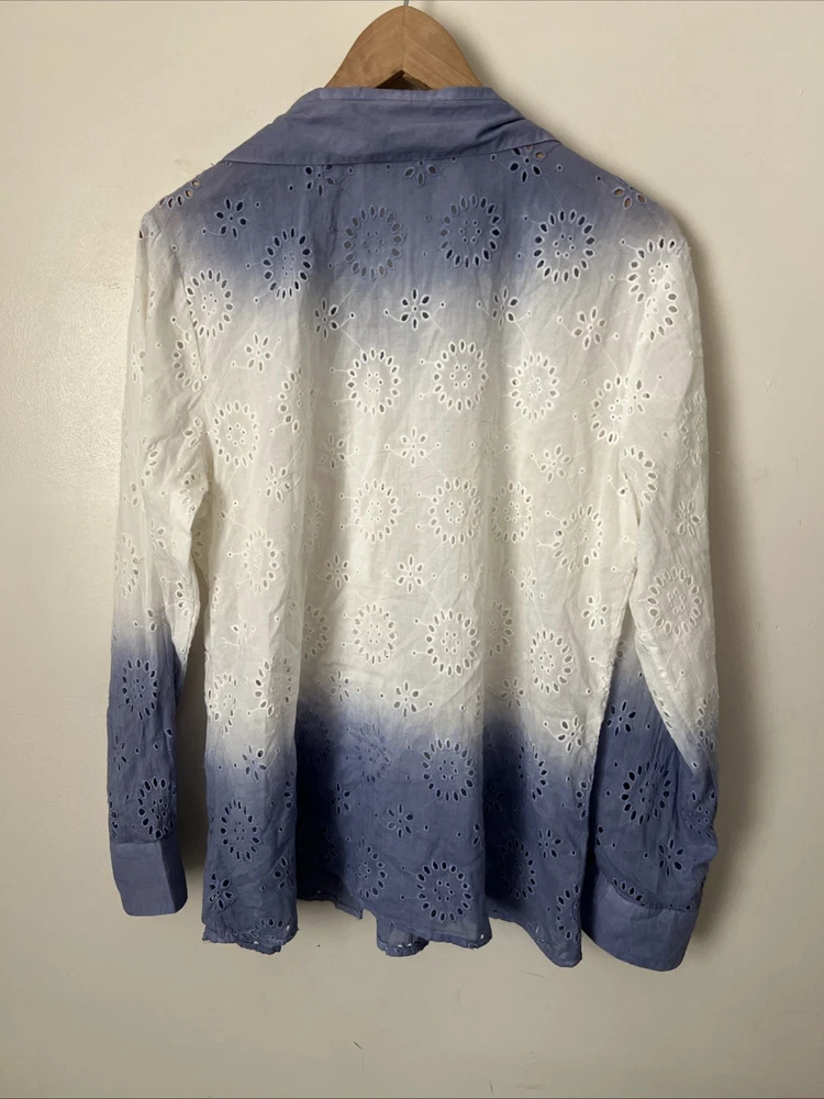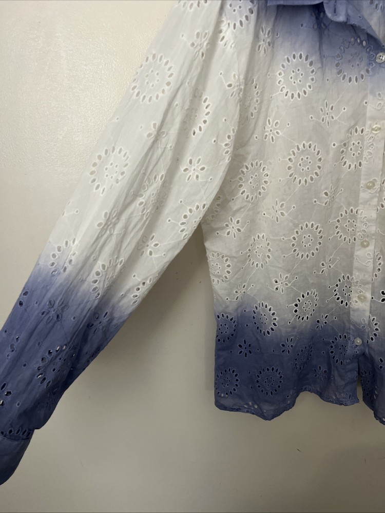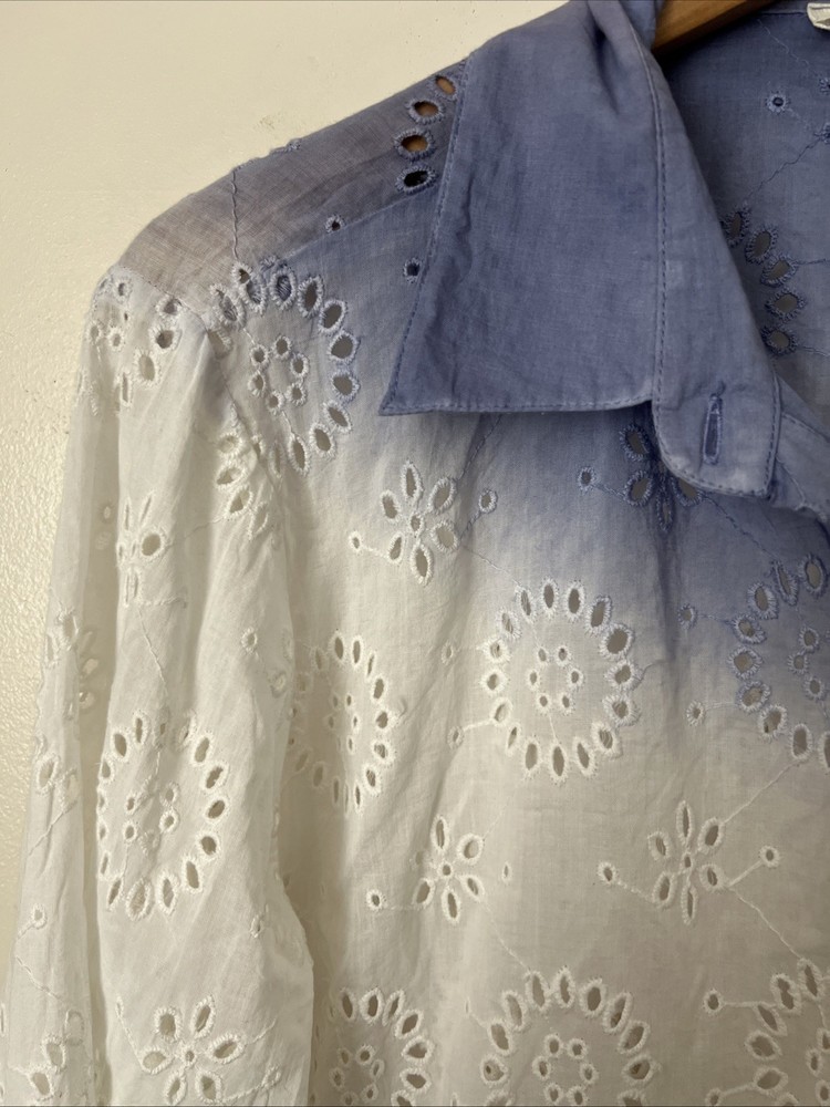 Solitaire Anthropologie Dip Dye Eyelet Blue White Cover Up / Button Down Shirt Size: L Large Gorgeous, Boho shirt. Floral details.