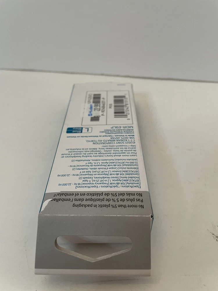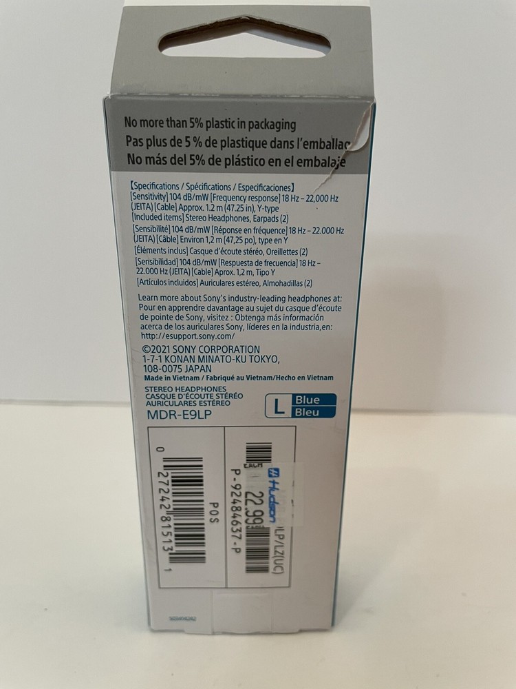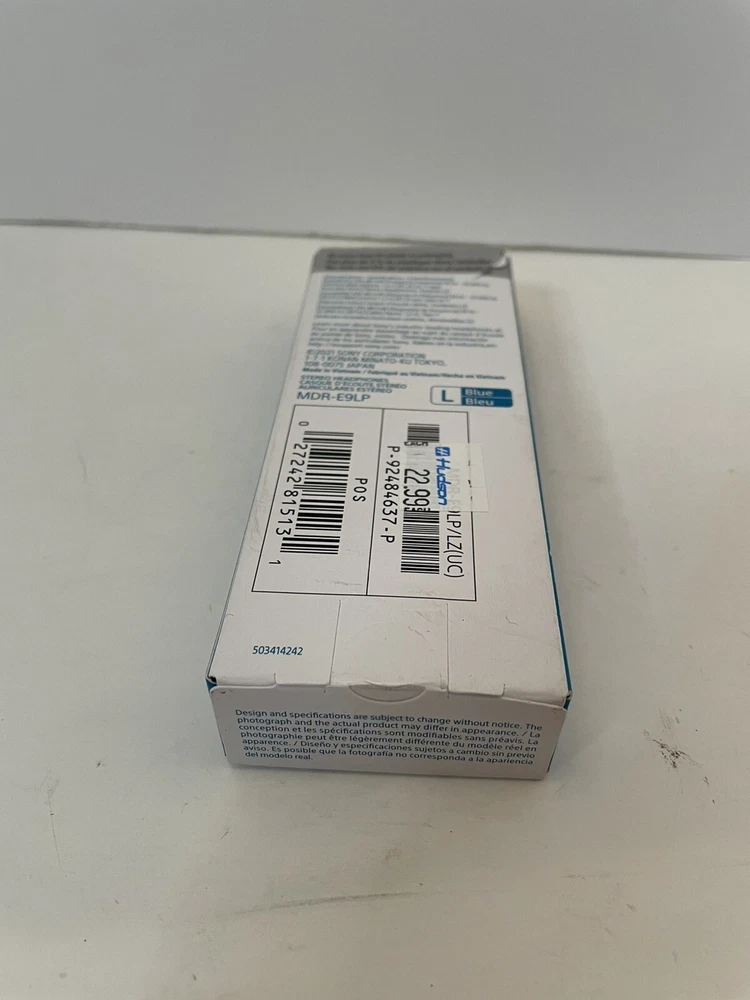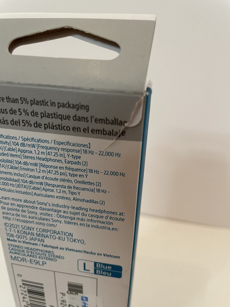 Sony MDR-E9LP In-Ear Only Headphones - Blue. Never opened, but the box has a small tear at the top. See pictures.