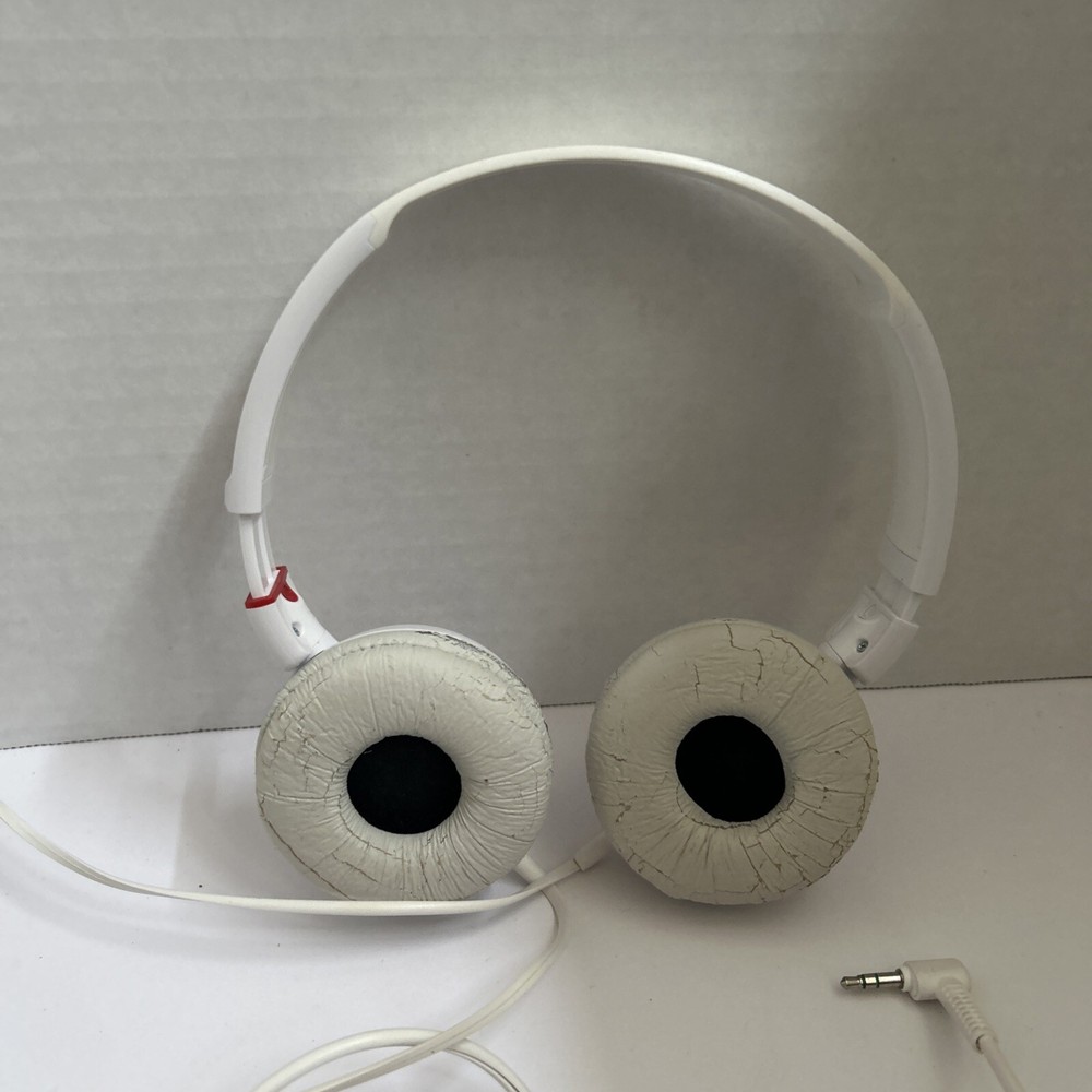 Experience your music like never before with these Sony MDR-ZX110 wired on-ear headphones in a sleek white color. These headphones feature an adjustable headband, L-shape plug, and rotating ear cups with leather cushions for maximum comfort. The noise cancellation technology allows you to enjoy your music without any outside interference, while the stereo sound delivers high-quality audio. With a 1.2m cable length and 3.5mm jack connectivity, these headphones are perfect for on-the-go listening. The closed-back design and 24 ohm impedance make these headphones perfect for any music lover. These headphones are from the 2020s and are in working condition.