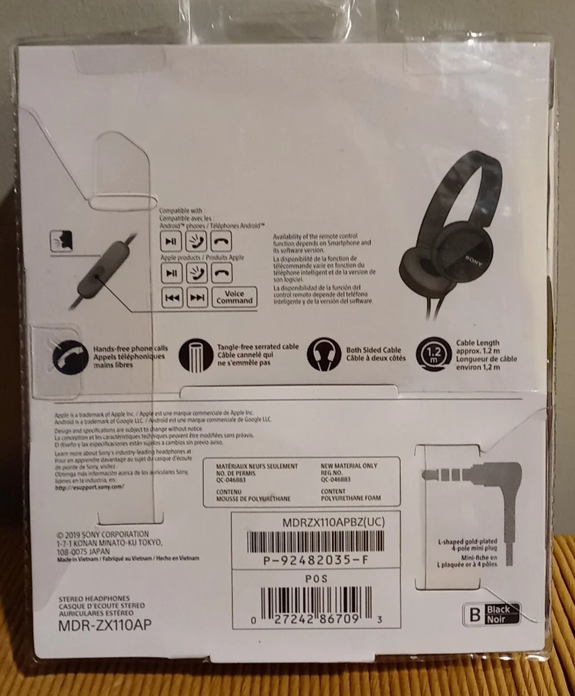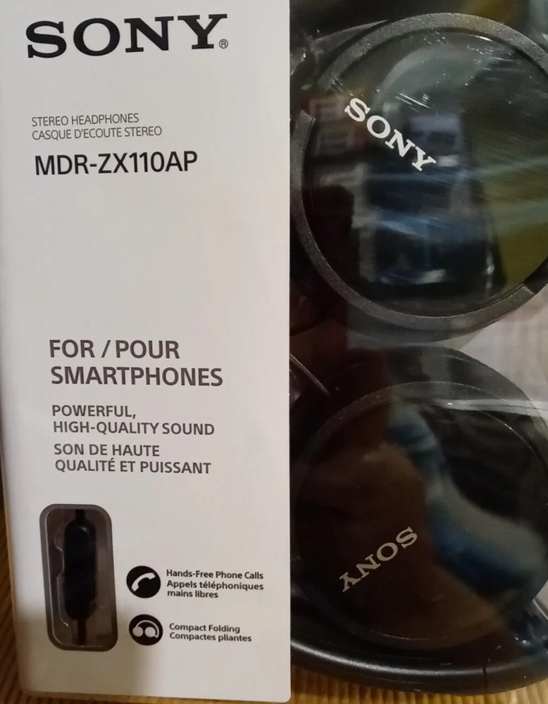 Sony MDR-ZX110AP Stereo Headphones for Smartphones - Black Wired Features: Built-in Microphone for Hands-free calling. The outer packaging has minor tear/ding and a sticker residue but the item is New! Pictures are included to help you with your decisions. Thank you for looking and have a great day.
