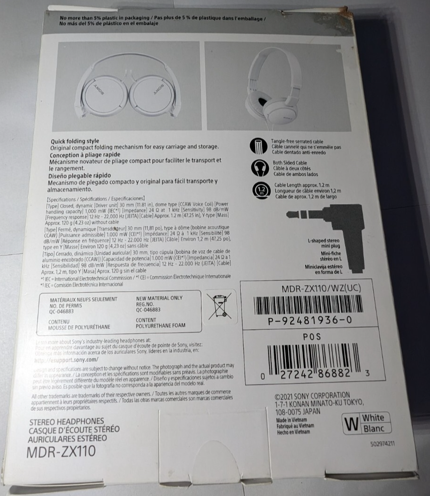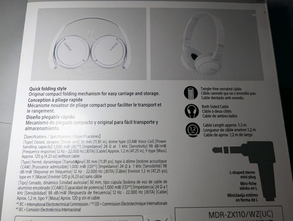 In Original Box Includes Original Accessories This is a NEW item in the original box, never opened Brand Sony Color White Ear Placement On Ear Form Factor On Ear Impedance 24 Ohm About this item Lightweight 1.38 in neodymium dynamic drivers deliver a punchy, rhythmic response to even the most demanding tracks The swiveling earcup design allows easy storage when you’re not using them, and enhances portability when you’re traveling Cushioned earpads for total comfort and enfolding closed-back design seals in sound The wide frequency range—spanning 12 Hz to 22 kHz—delivers deep bass, rich midrange, and soaring highs