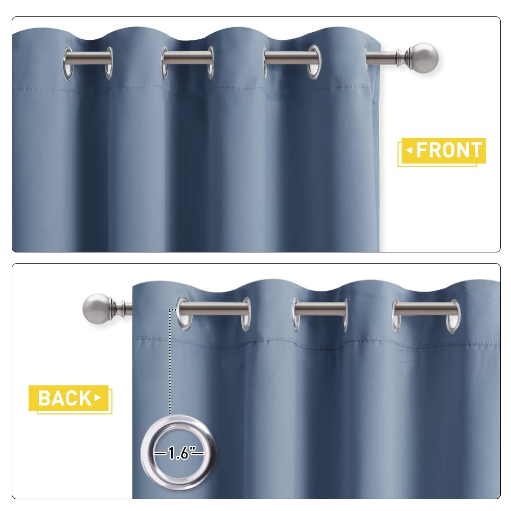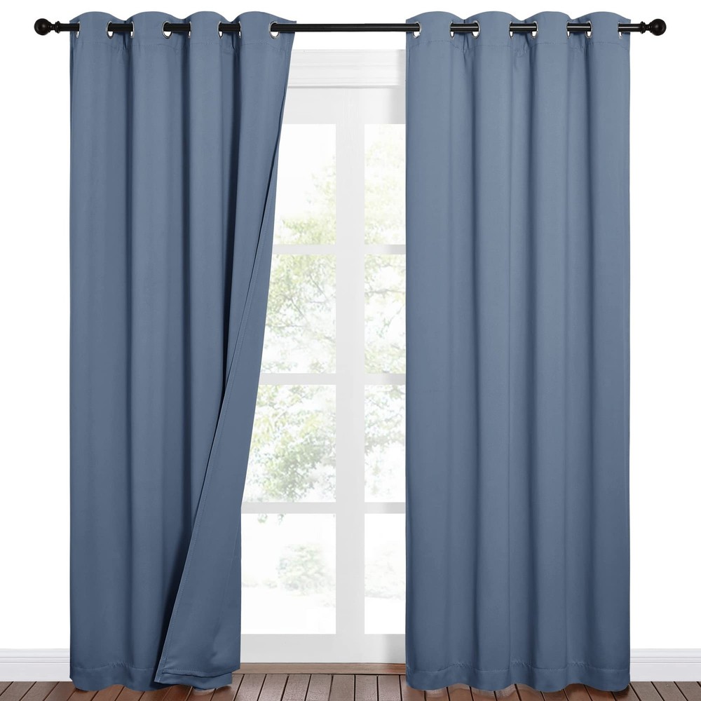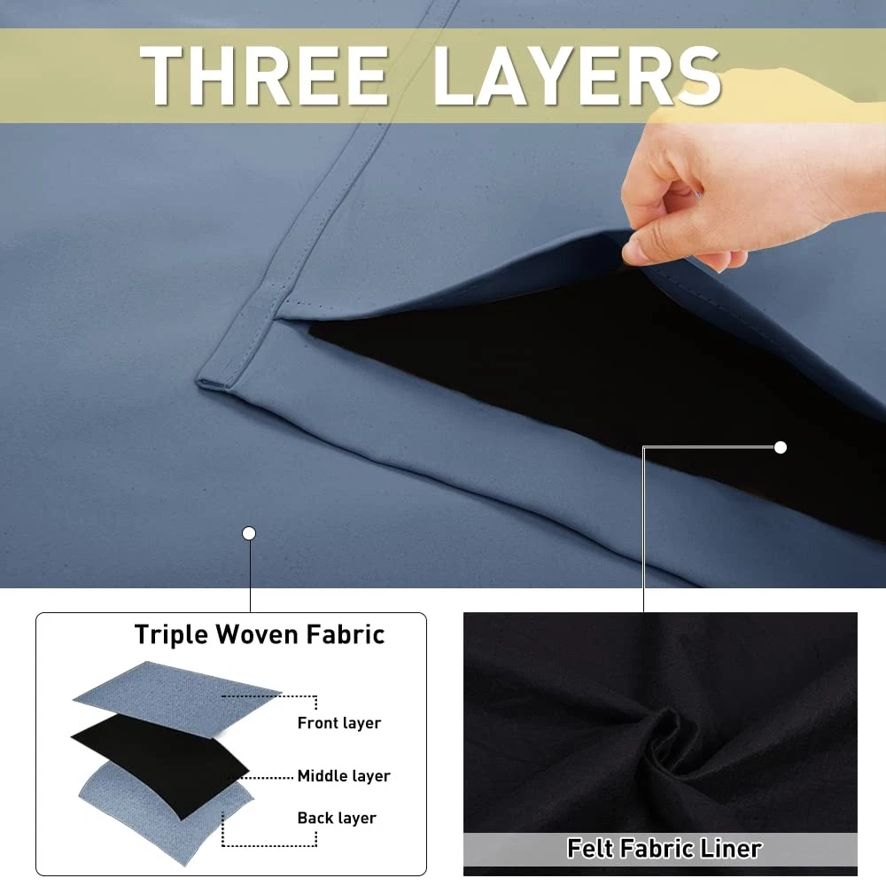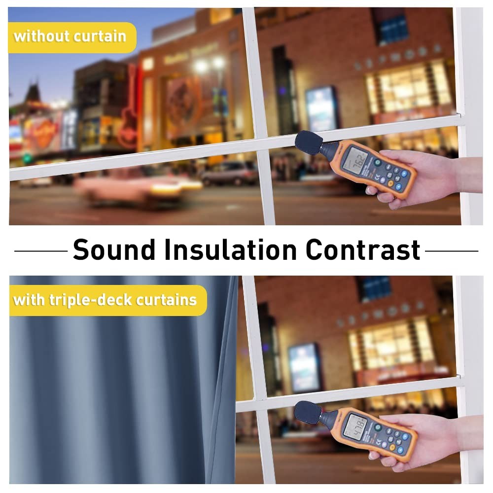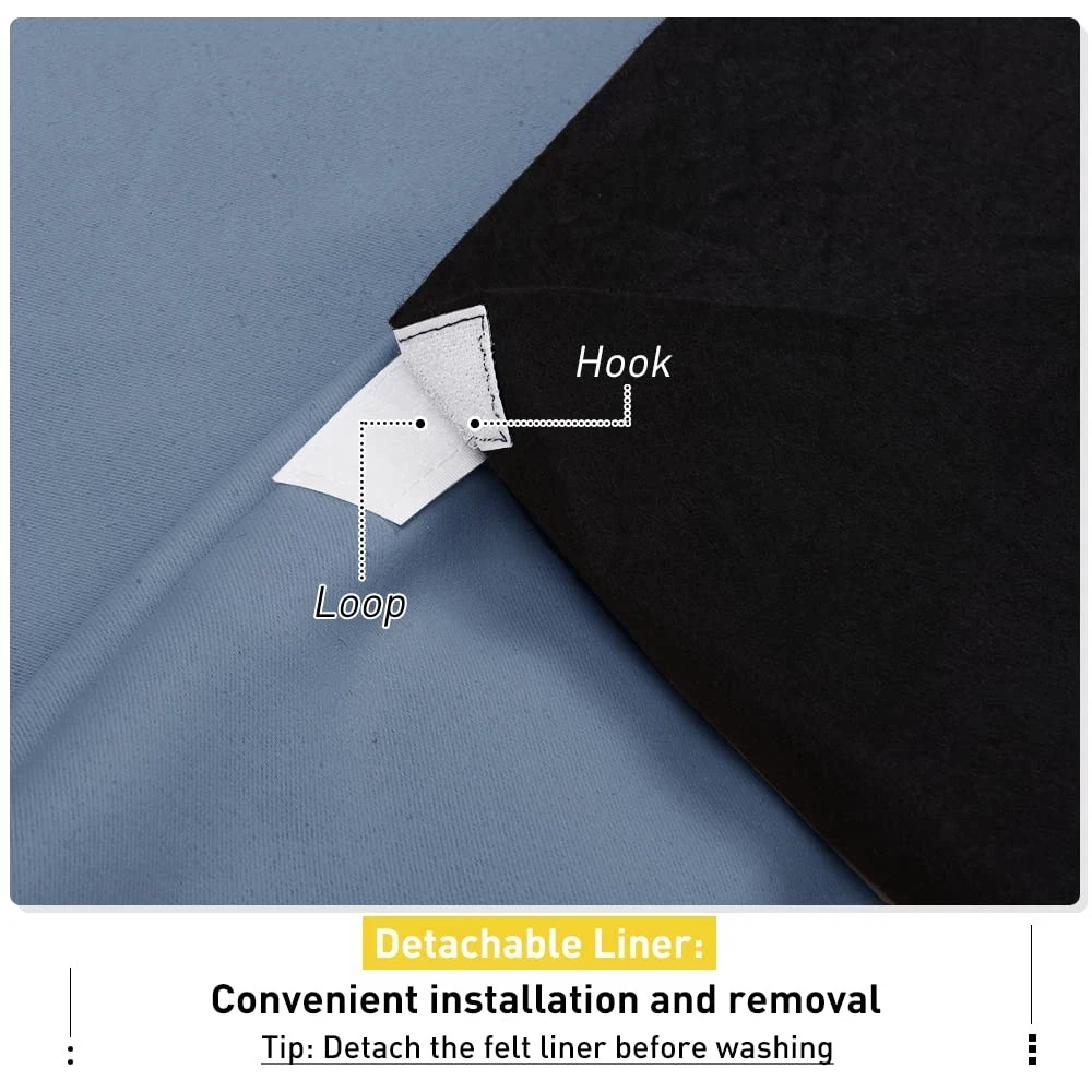 No matter where you live, California, Texas or even Florida, if you have the annoying sunshine of torture and street noise, and need a completely dark and quiet sleep environment, you can choose our 3-in-1 blackout curtains with noise absorbing liner. Different from other regular one layer blackout curtains, Thermal Insulated Blackout Lined Curtains go beyond that mundane function and provide the best benefits. FIT NICELY: Package includes 2 panels blackout curtains. 1.6" Grommet fits various standard or decorative curtain rod/pole. Due to grommet design, remember they narrow when you put them on a pole. Become shorter because of sewn into a 3-inch header with grommets. Particularly suitable: living room, kitchen, bedroom, baby room, villa, hall, and department, etc. MULTIFUNCTION: Draperies are thick enough to block out unwanted light completely and reduce some noise, encouraging day sleepers and the ones who have trouble falling asleep have a good sleep. The detachable felt fabric liner is in the middle of the 3 layers. Maximum absorb the annoying noise and create a peaceful environment. Not only that but also make your resting zone truly blissful. They would be perfect for any home theater and supply you with the enjoyment of watching TV in real darkness. The sophisticated designs allow you to brighten your home decor, making your living space more lively. Protect your furniture, floors, and artwork from the ravages of the sun. Lined Grommet Curtains have kept the room much warmer in winter and also block a lot of heat during summer, relieving the strain on home heating and cooling while reducing energy budget. READY MADE: 2 panels per package. Each Curtain with 1.6" diameter rings measures 52" wide x 84" long (Total width of 2 panels is 104"). 3 layers together: front is pure white, back is grayish-white & 1 detachable felt fabric lining in the middle. NOISE REDUCING: Detachable felt fabric liner in the middle which makes the effect of absorbing sound is 2.5 times higher than the ordinary curtains. So that minimize the effect of noise on you at any time. But these curtains are not noise cancelling, but noise reducing. The more folds the better the noise dampening. 100% BLACKOUT: Curtains are made with 2 layers triple weave fabric and 1 layer detachable felt fabric liner. Thick enough to completely keep out the 100% SUNLIGHT and UV RAY. Offering you a real dark environment, a great choice for any room you would like to turn day into night. THERMAL INSULATION: 3-in-1 curtains can balance room temperature by insulating against summer HEAT and winter CHILL meanwhile protect PRIVACY. Help you to reduce energy costs. Tips: You will need a rod that is strong with a center support to support the heavy curtains. EASY CARE: Good quality finishing will withstand years of use. Detach the felt liner before machine wash. Machine washable and Wash the water temperature below 86℉. Mild detergent no bleaching. Low-temperature ironing.