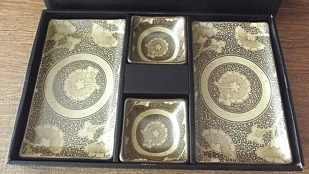 Unused - Box Shabby from long storage ....Sound Collection Japanese, Sousaku Brown Flowers Stoneware 2x PlateTrays & 2x Dipping Bowls ....Great Collectibles ......Free Shipping...