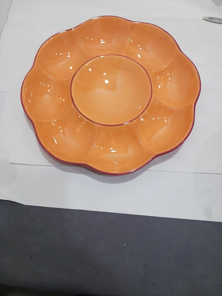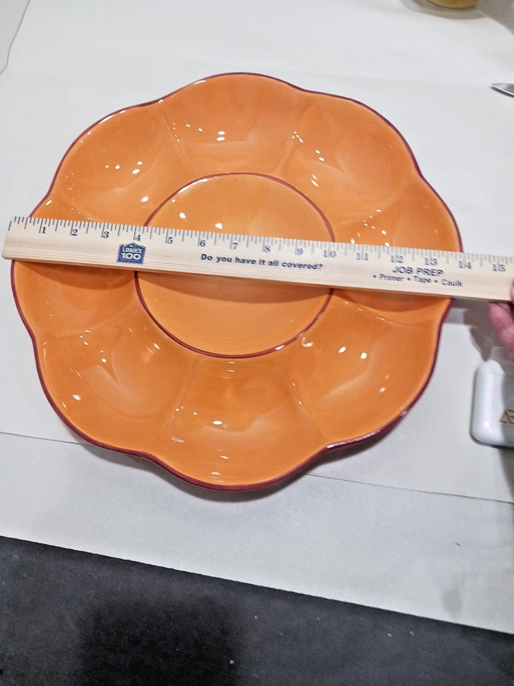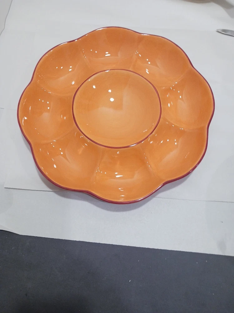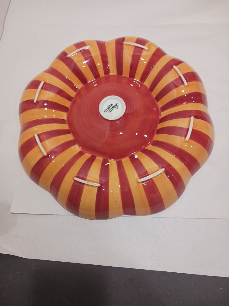 Elevate your hosting elegance with the Southern Living Gail Pittman Sienna Large Chip Dip Serving Platter. Crafted with care, this Ceramic platter features a vibrant inside orange color with classic stripes on the outside, offering a pop of color and a touch of sophistication to any table setting. Designed with a round shape and art pottery production style, it’s a piece that marries functionality with a artistic flair. Perfect for your next gathering, this platter is a beautiful way to serve appetizers and dips, ensuring that your guests are treated to both the taste and the visual appeal of your hors d'oeuvres. Lovely piece. Well taken care of.Signed GP for Gail Pittman on the back. Will be carefully packed and shipped. Please check out my other items. thanks