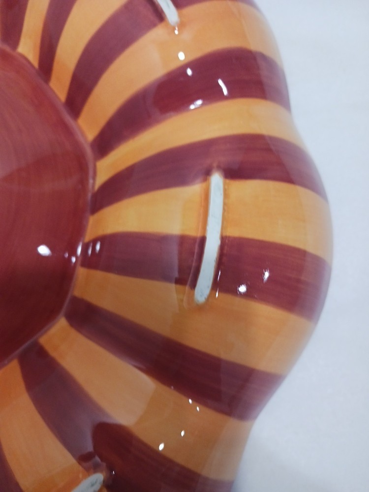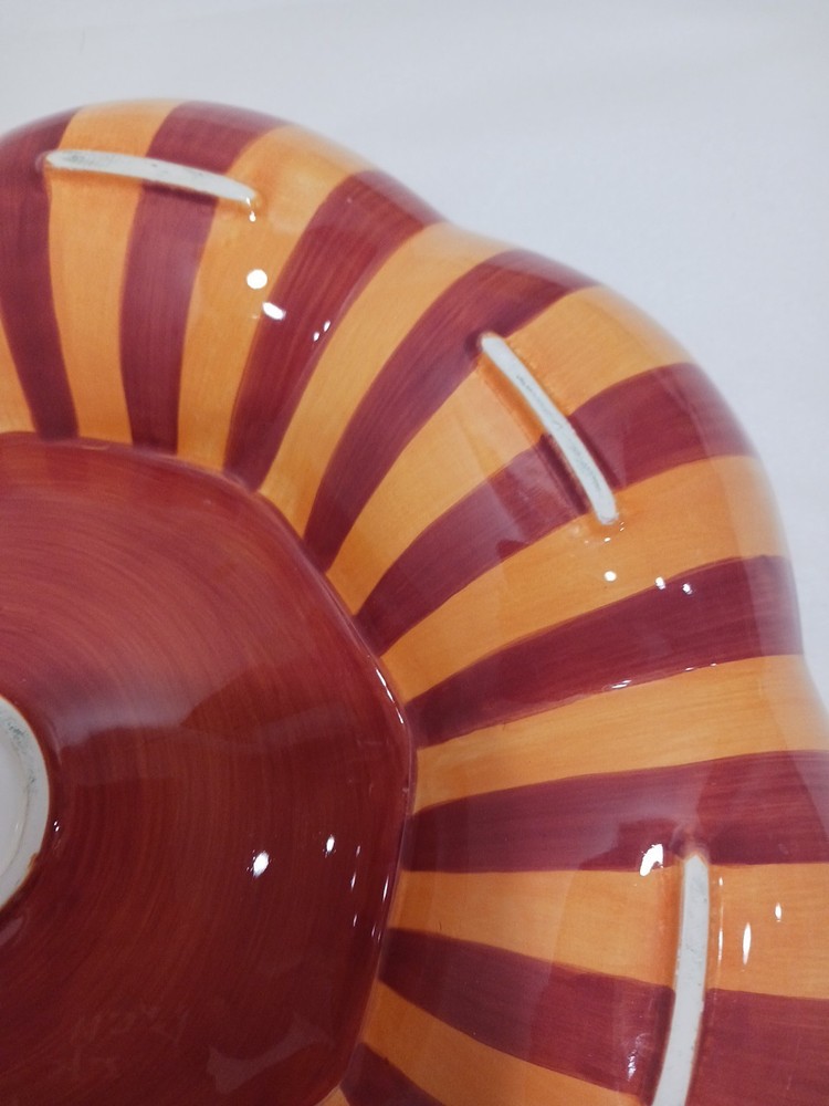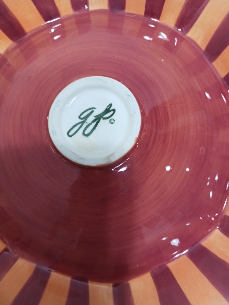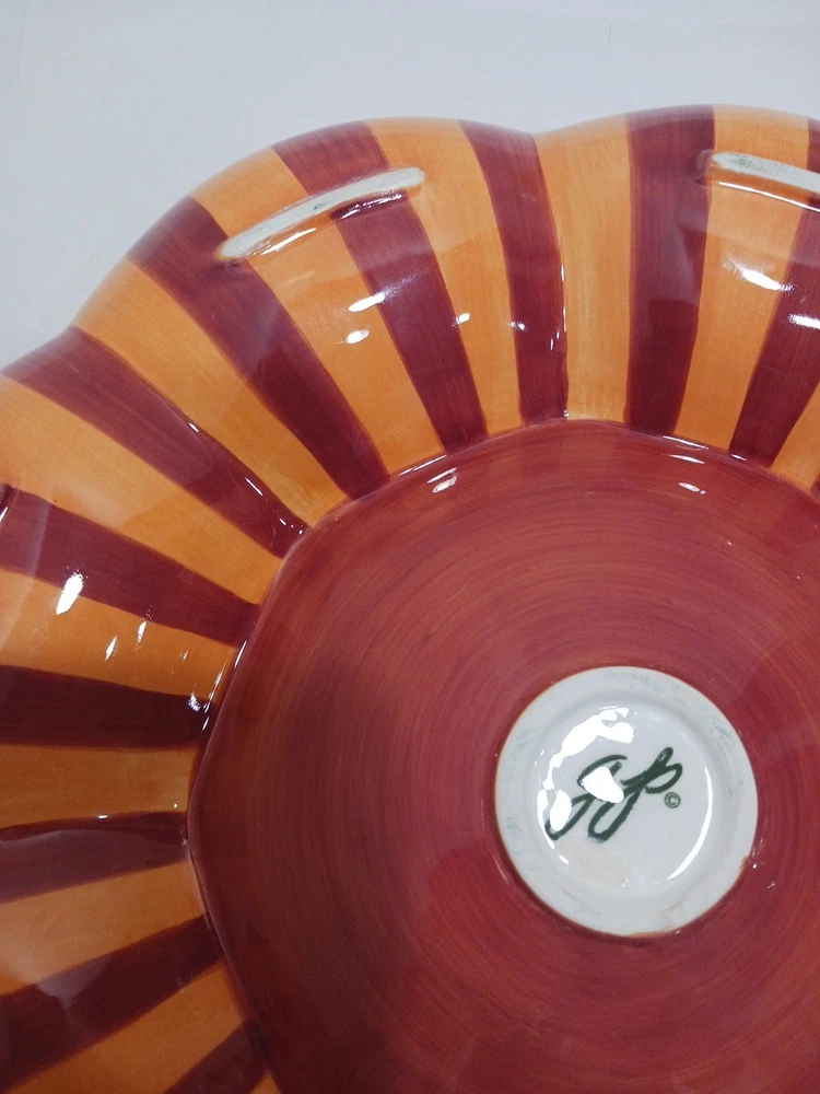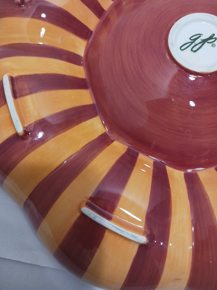Elevate your hosting elegance with the Southern Living Gail Pittman Sienna Large Chip Dip Serving Platter. Crafted with care, this Ceramic platter features a vibrant inside orange color with classic stripes on the outside, offering a pop of color and a touch of sophistication to any table setting. Designed with a round shape and art pottery production style, it’s a piece that marries functionality with a artistic flair. Perfect for your next gathering, this platter is a beautiful way to serve appetizers and dips, ensuring that your guests are treated to both the taste and the visual appeal of your hors d'oeuvres. Lovely piece. Well taken care of.Signed GP for Gail Pittman on the back. Will be carefully packed and shipped. Please check out my other items. thanks