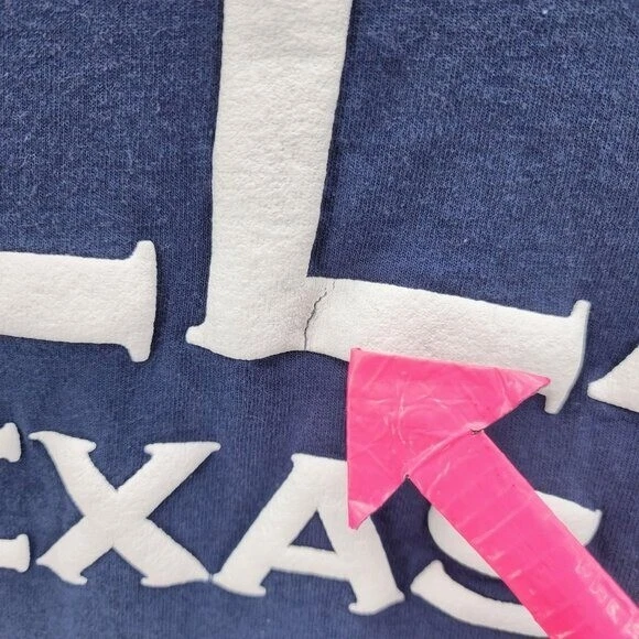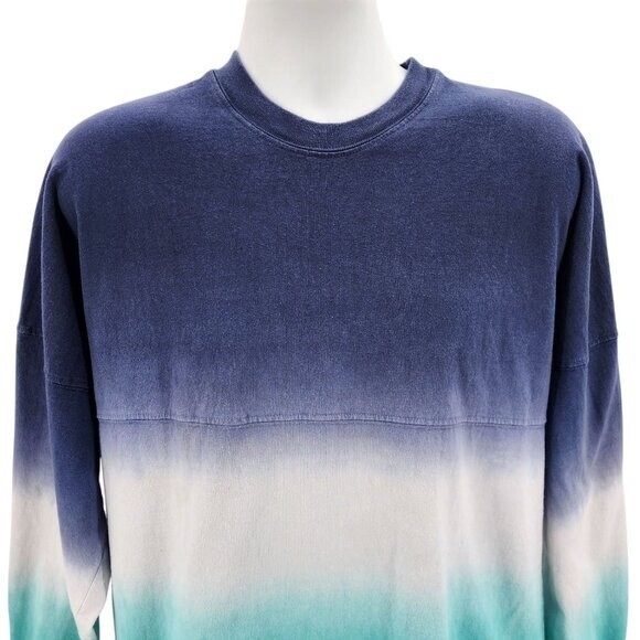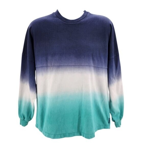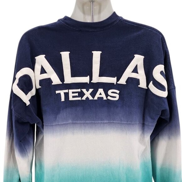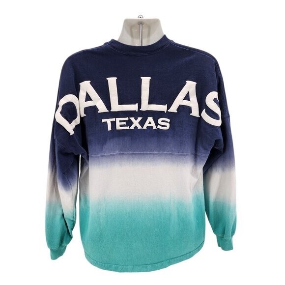 Spirit Jersey Adult Small Shirt Dallas Texas Puffy Print Dip Dye Blue Long Sleeve Retro Adult Size Small Long sleeve relaxed fit crew neck shirt with a navy blue, white & aqua blue dip dye / tie dye design. Dallas Texas spelled out on the back in large white puffy print. 100% Cotton. Made in USA. Condition: Pre-owned, has some minor cracking in puffy print, some tiny minor stains, see photos for condition Measurements: Approximately 23" armpit to armpit & 29.5" long