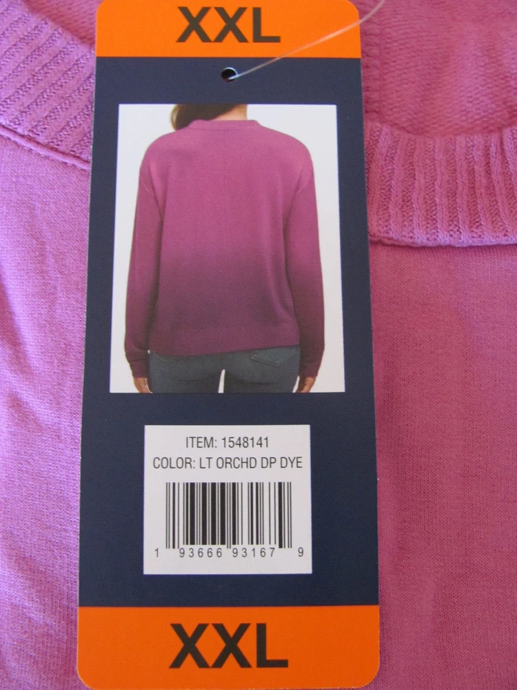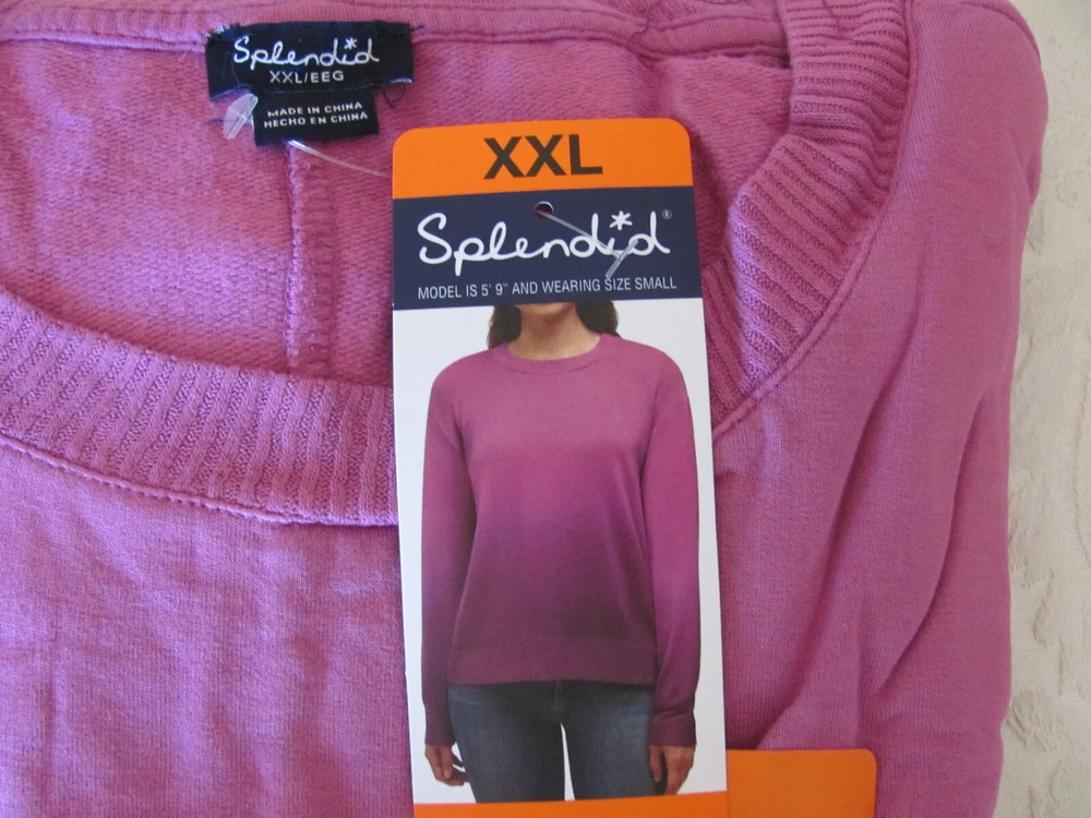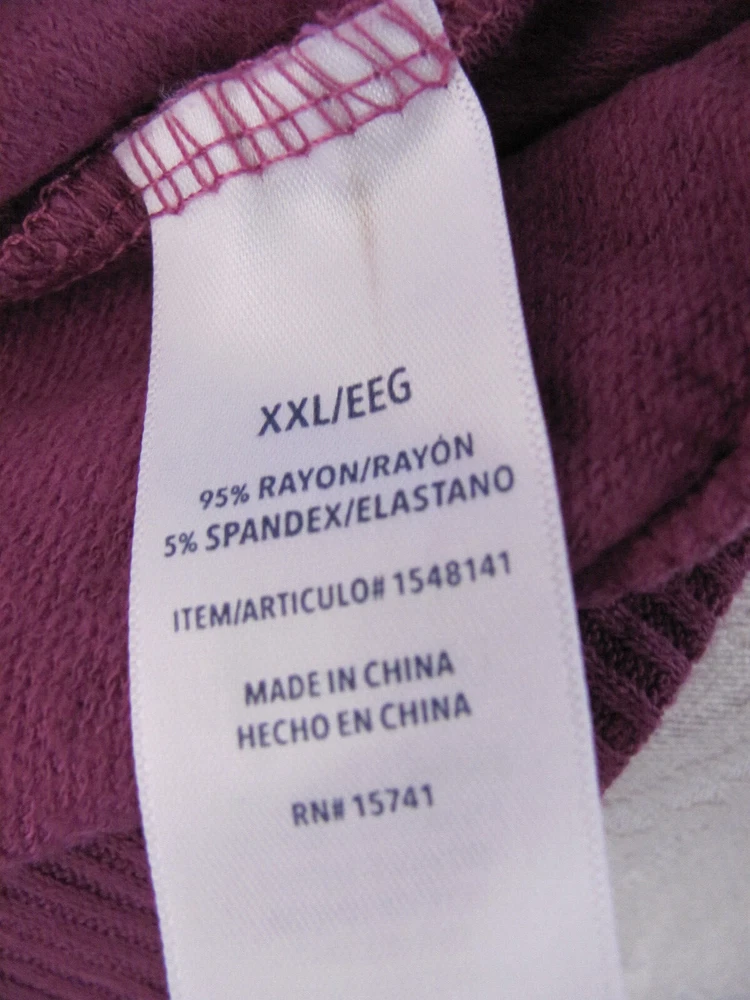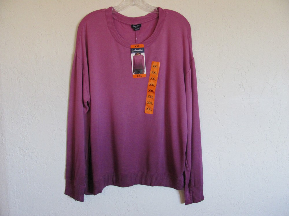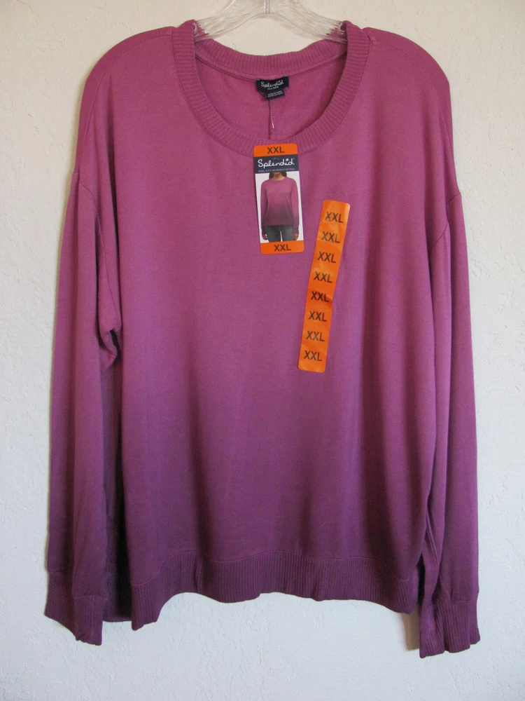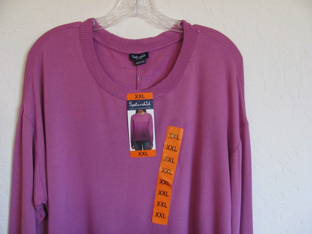 Size XXL -(Size 18-20) Pit to Pit 24" Length - 24 1/4" Sleeves - Pit to Cuff 19 1/4" Features: Soft hand feel Relaxed fit Ribbed cuffs, Collar & Hem Made in China Content: 95% Rayon | 5% Spandex Sizing Sizing Conversion: XS = 0-2 | S = 4-6 | M = 8-10 | L = 10-12 | XL = 14-16 | XXL= 18-20 Model is 5’10” and wearing size Small