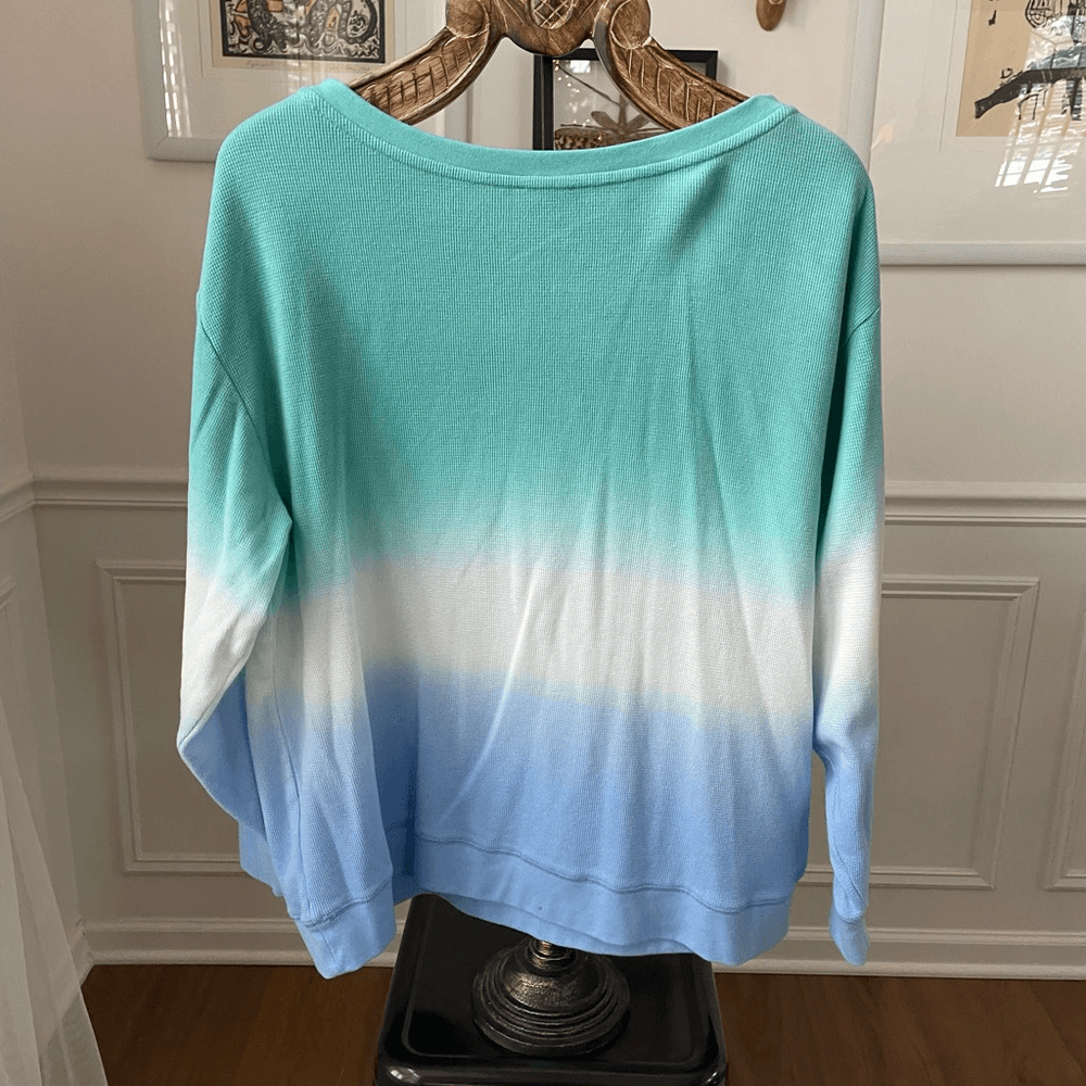 Splendid brand dip dye thermal, long sleeve top that is banded at the waist and cuffs like a sweatshirt but not fleece on the inside. Cotton and polyester blend. Shades of green, blue and wipes. Laying flat measures 27 inches shoulder to hem and 24 inches armpit to armpit.
