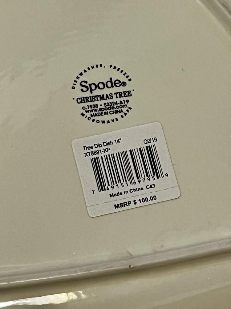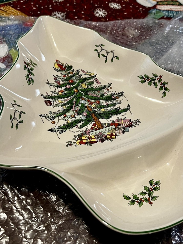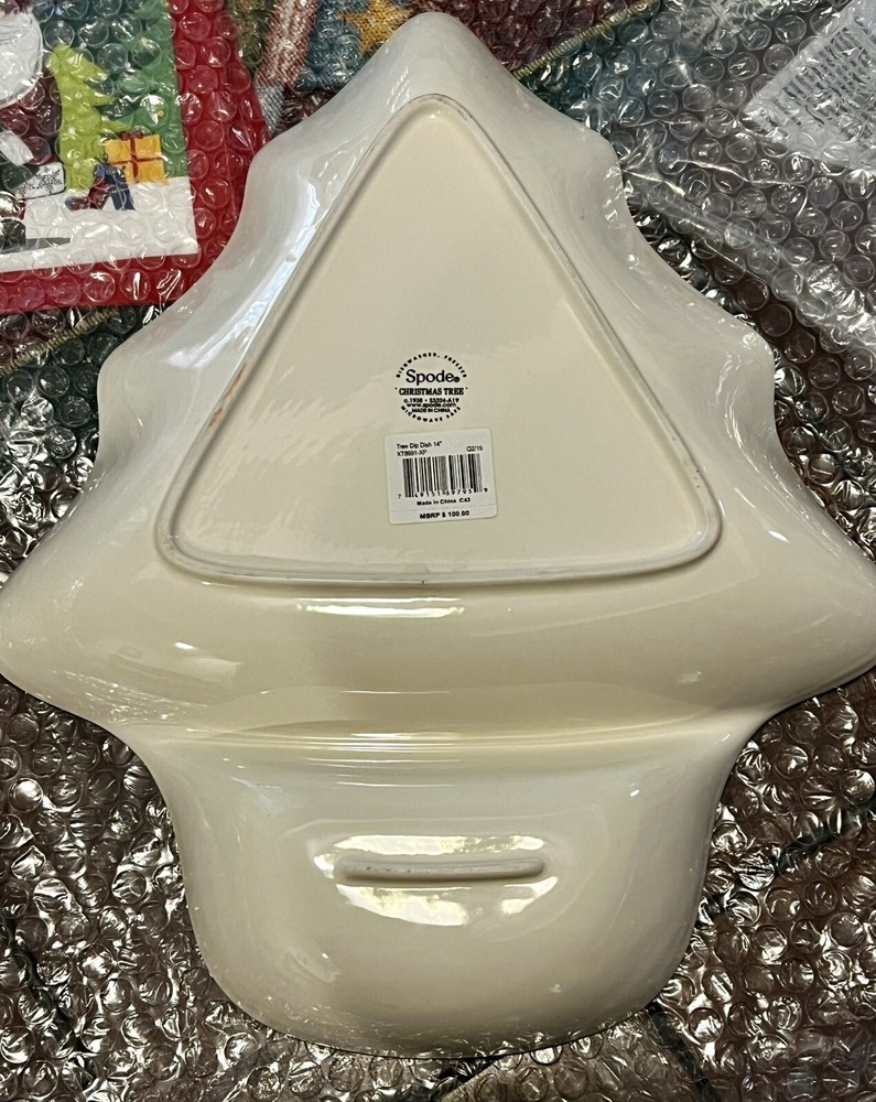 The Spode Holiday Christmas 14-Inch Fine Porcelain Tree-Shaped Dip Dish Server is a large, multicolor serving dish in the shape of a Christmas tree. It features two compartments and is adorned with a traditional Christmas theme. This dishwasher and microwave-safe dish is perfect for serving dips or other holiday treats, with a glossy finish and a size of 14 inches in length and 11.5 inches in width. New without box