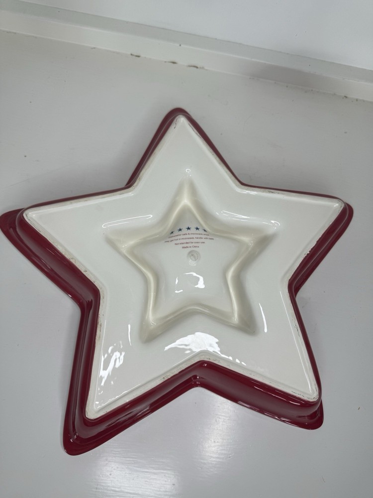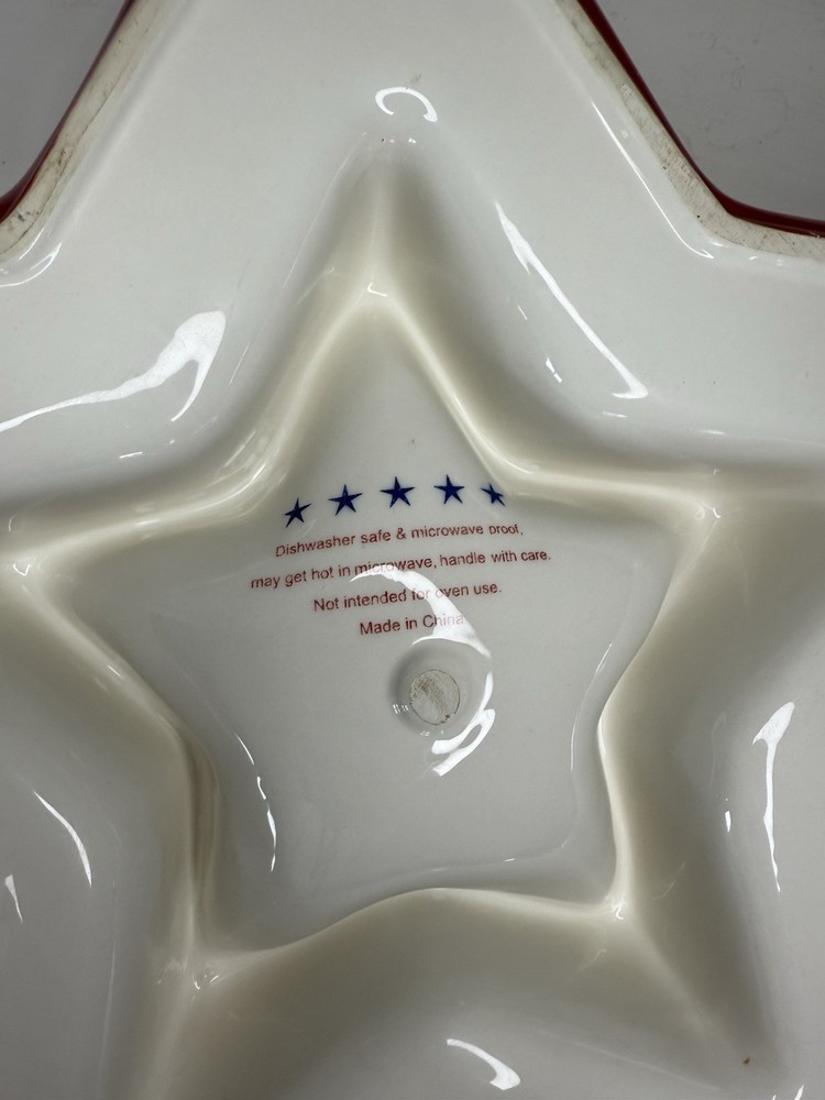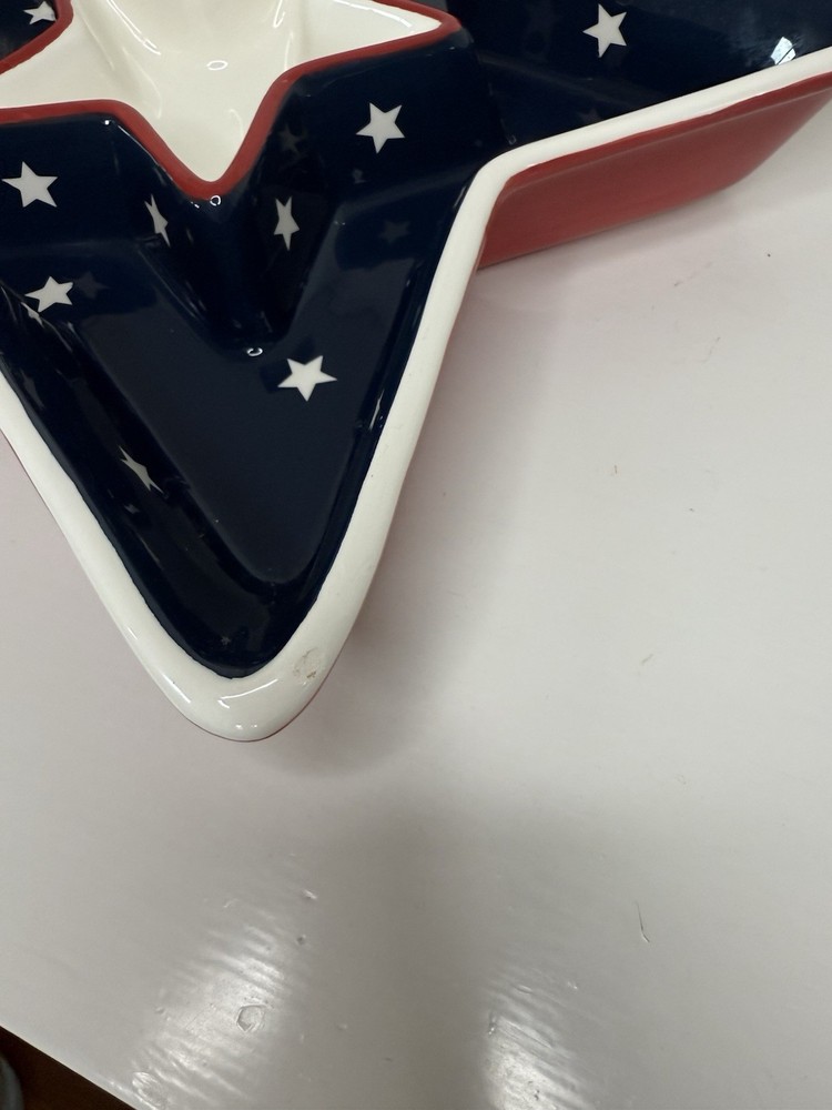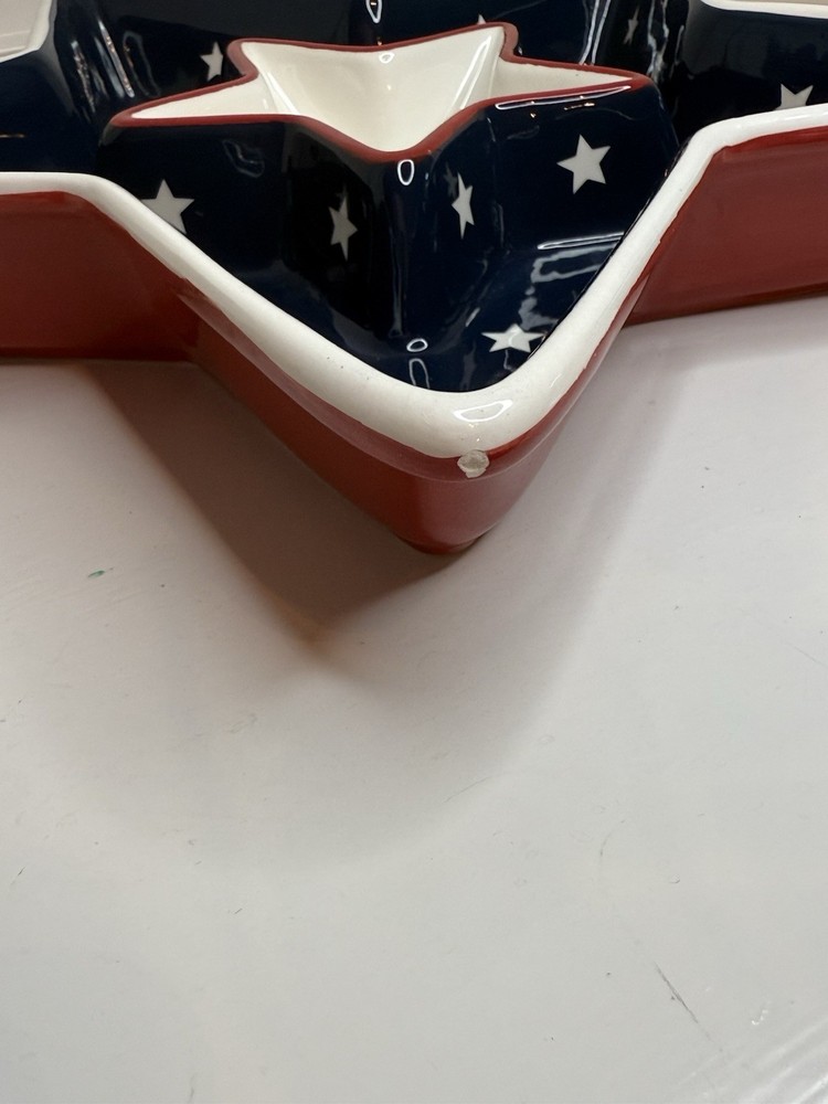 Star Chip Dip Tray Platter - July 4th - American Red White Blue Patriotic Party Dishwasher and Microwave proof May get hot in microwave, handle with care Not intended for oven use 15" x 15" x 2.75" There is a small chip on the underneath side on one of the points of the star. Please see photos.