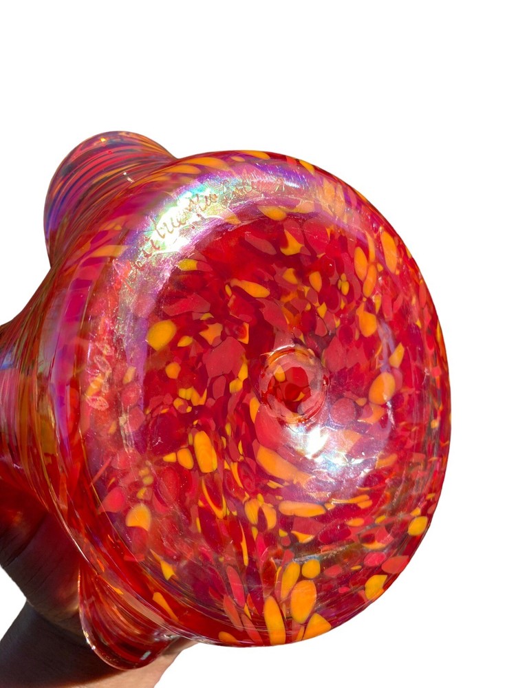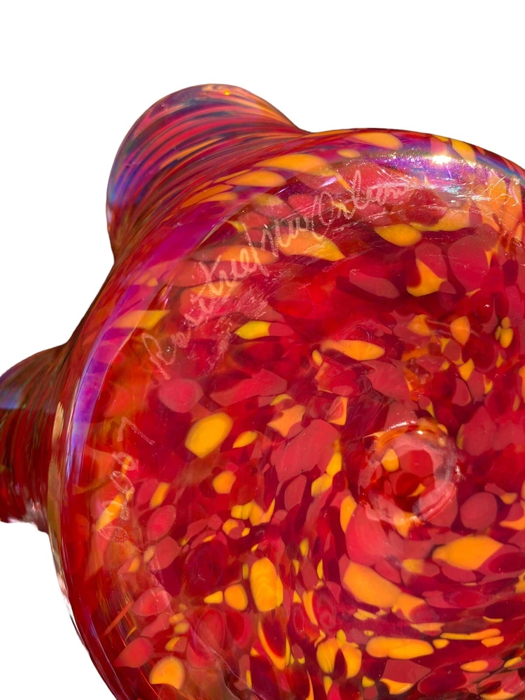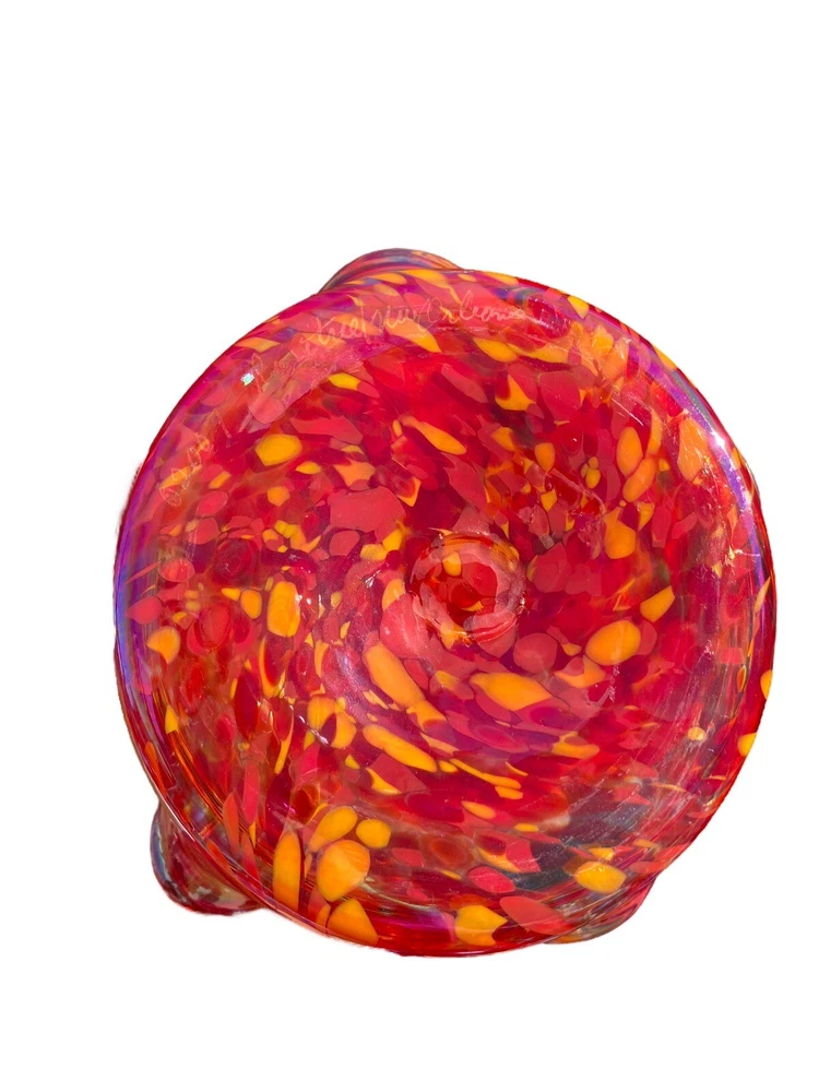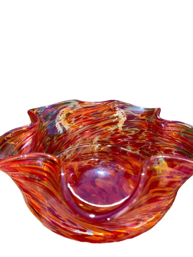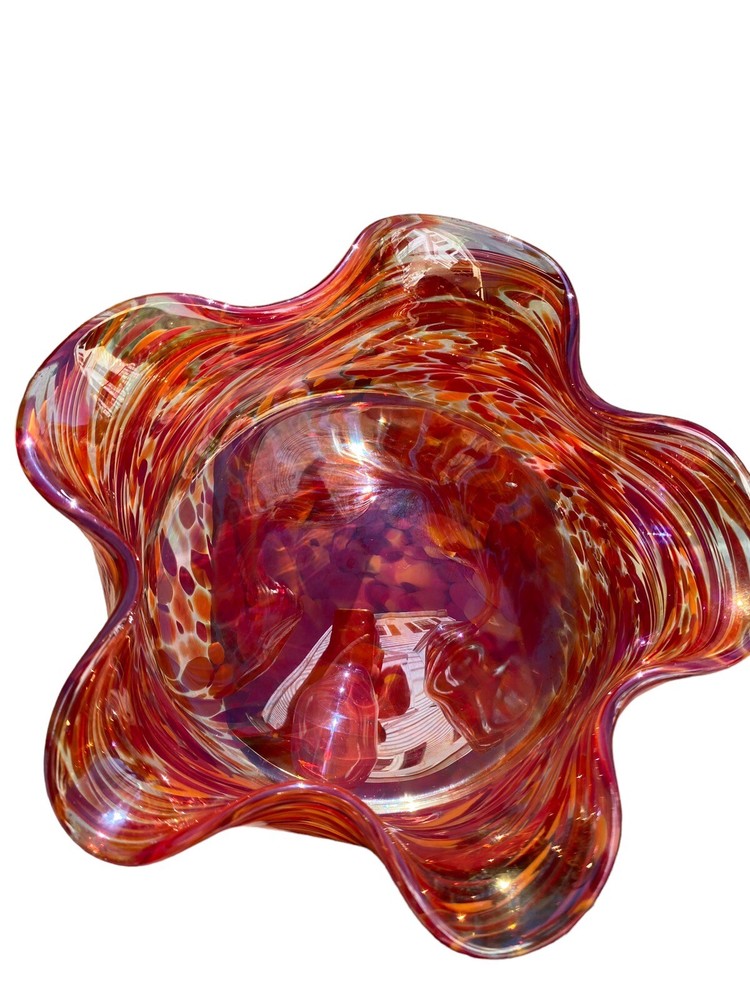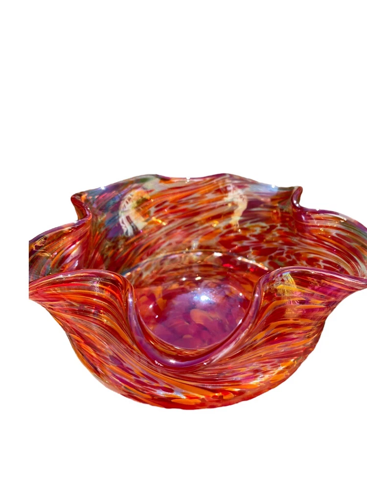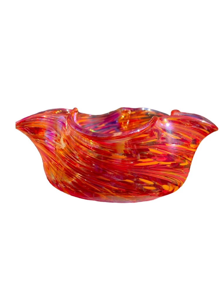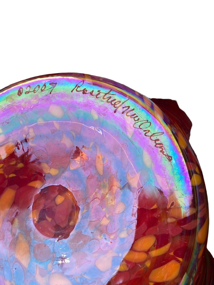 This unique decorative glass bowl is a beautiful addition to any home decor. The star shape and swirl pattern make it a stunning piece that will catch anyone's eye. The bowl is made of hand blown glass and has a glossy iridescent finish in yellows and purples. The Rosetree New Orleans brand adds to the bowl's charm and it was produced in the United States in 2007. It's perfect for serving snacks or as a decorative piece.