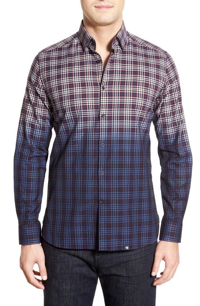 A classic dip-dye effect distinguishes a trim-tailored plaid sport shirt woven in light and breathable Egyptian cotton with a button-down collar and a sleek French placket. 30 1/2" length Hidden button-down collar. French placket. Long sleeves with adjustable button cuffs. Box pleat with locker loop. Curved hem. 100% cotton. Size 2=S 3=M 4=L 5=XL 6=2XL